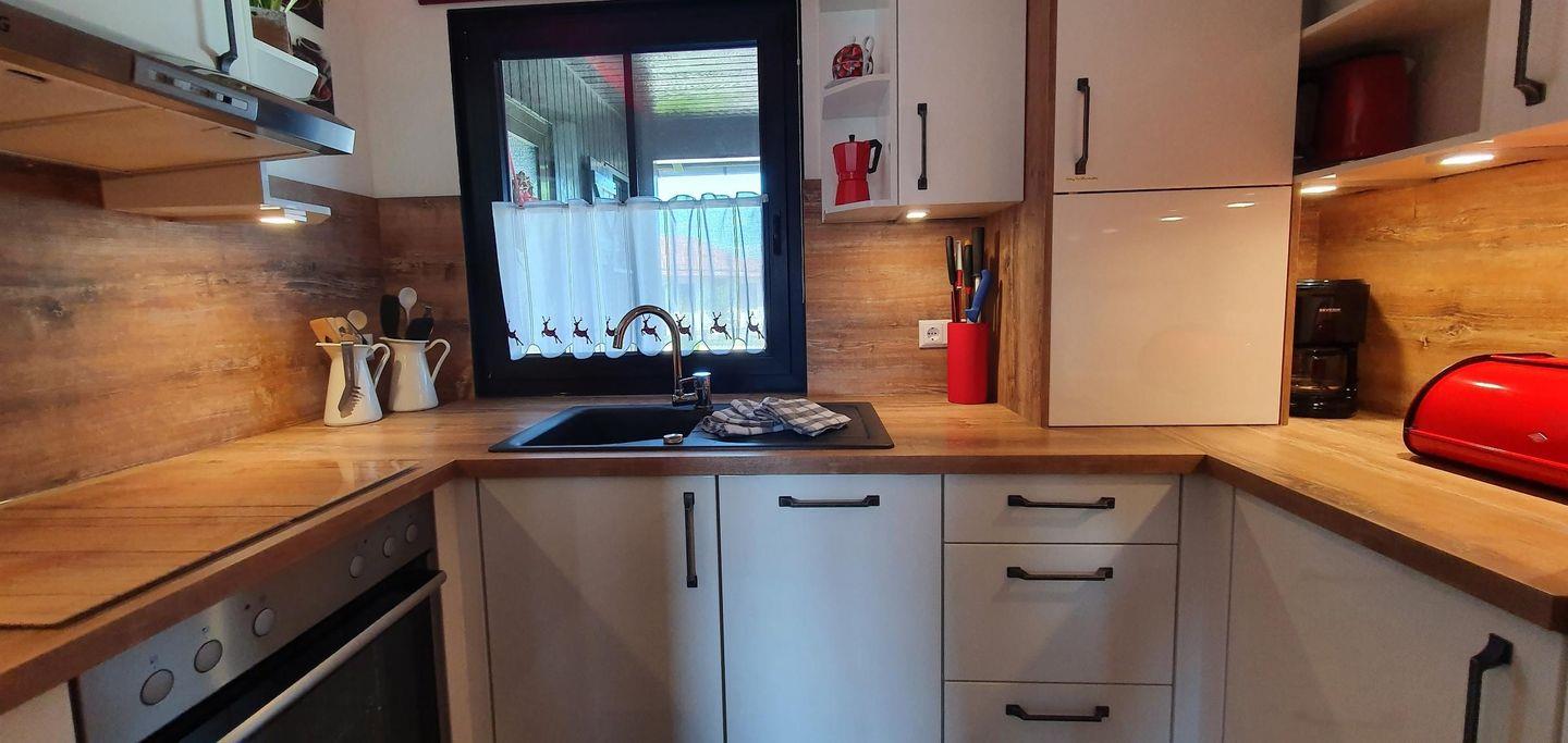 Die Wohnung ist hell und freundlich gestaltet, mit Laminatböden, die eine warme Atmosphäre schaffen. Die offene und gut ausgestattete, geschlossene Küche lädt zum gemeinsamen Kochen ein. Hier stehen Ihnen modernste Küchenutensilien, ein Cerankochfeld, ein Elektrobackofen, eine Spülmaschine, ein Kühlschrank sowie eine Mikrowelle und ein Wasserkocher zur Verfügung. Genießen Sie Ihre Mahlzeiten an einem stilvollen Esstisch, der ausreichend Platz für alle bietet.