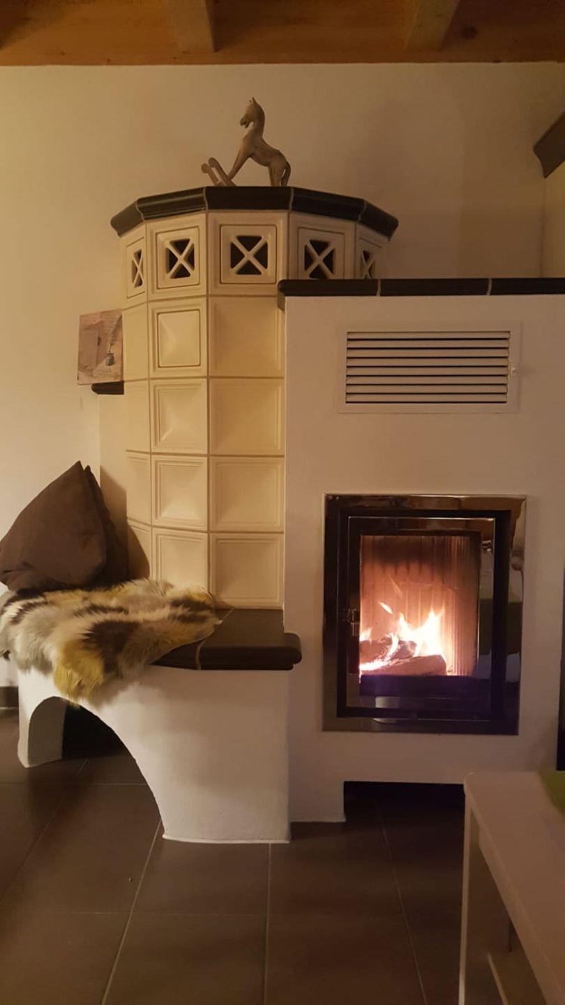 Verbringen Sie unterhaltsame Abende auf der bequemen Couch mit TV-Ecke und Wohlfühlatmosphäre durch den Kamin inklusive Feuerholz.