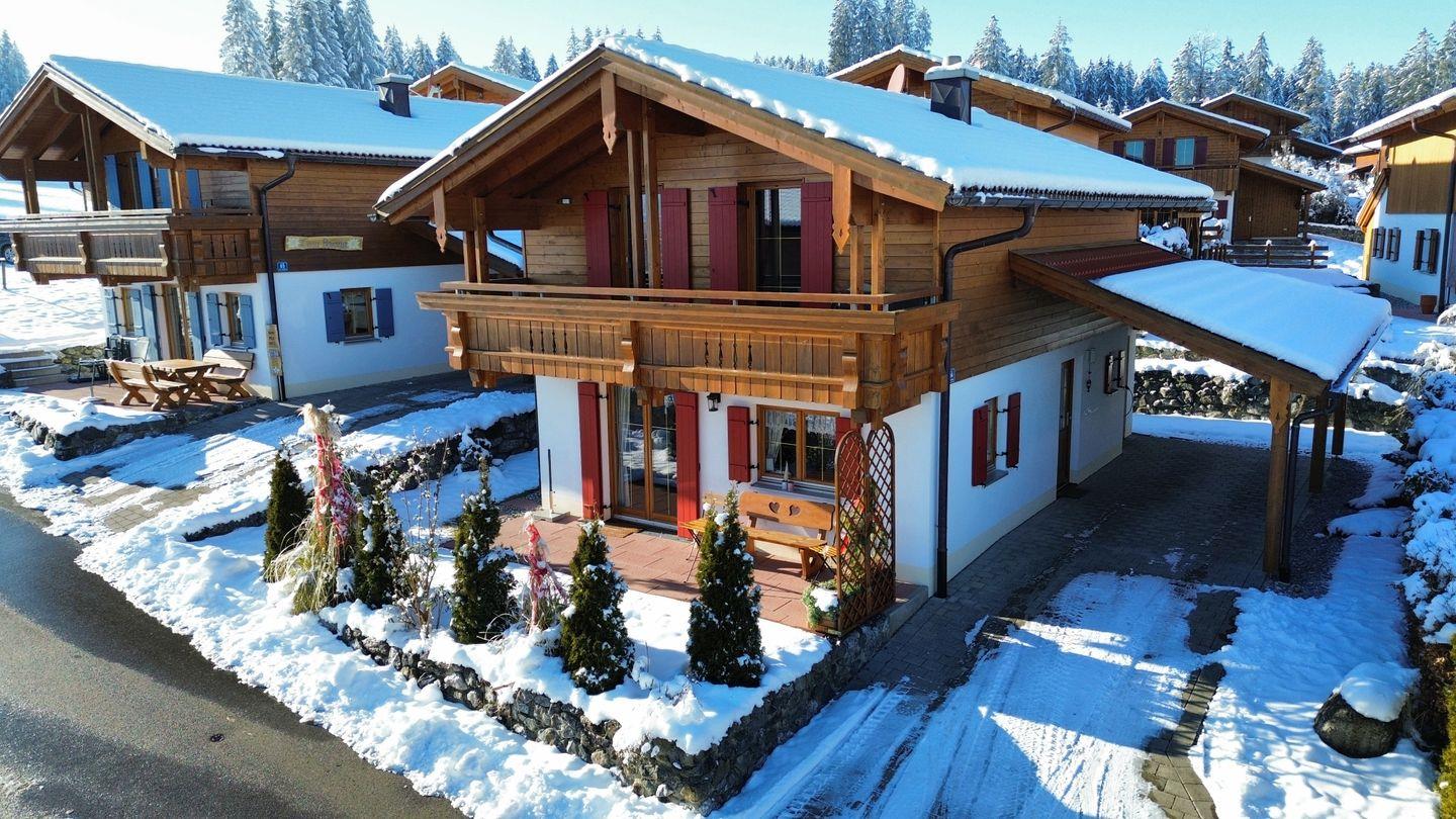Ferienhaus mit Bergblick, Terrasse und Kamin im Feriendorf Via Claudia Lechbruck