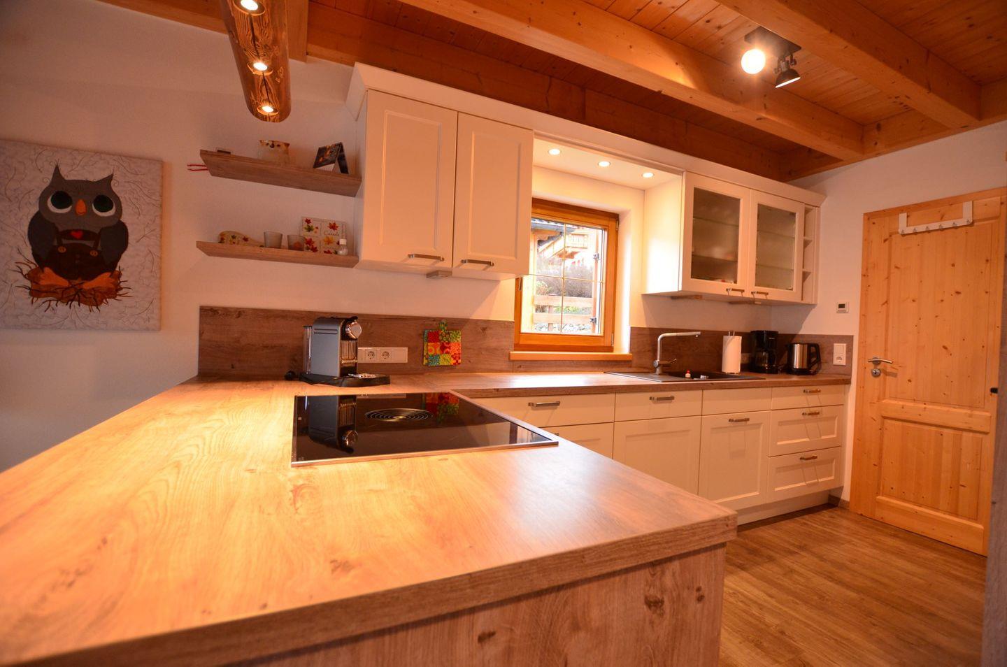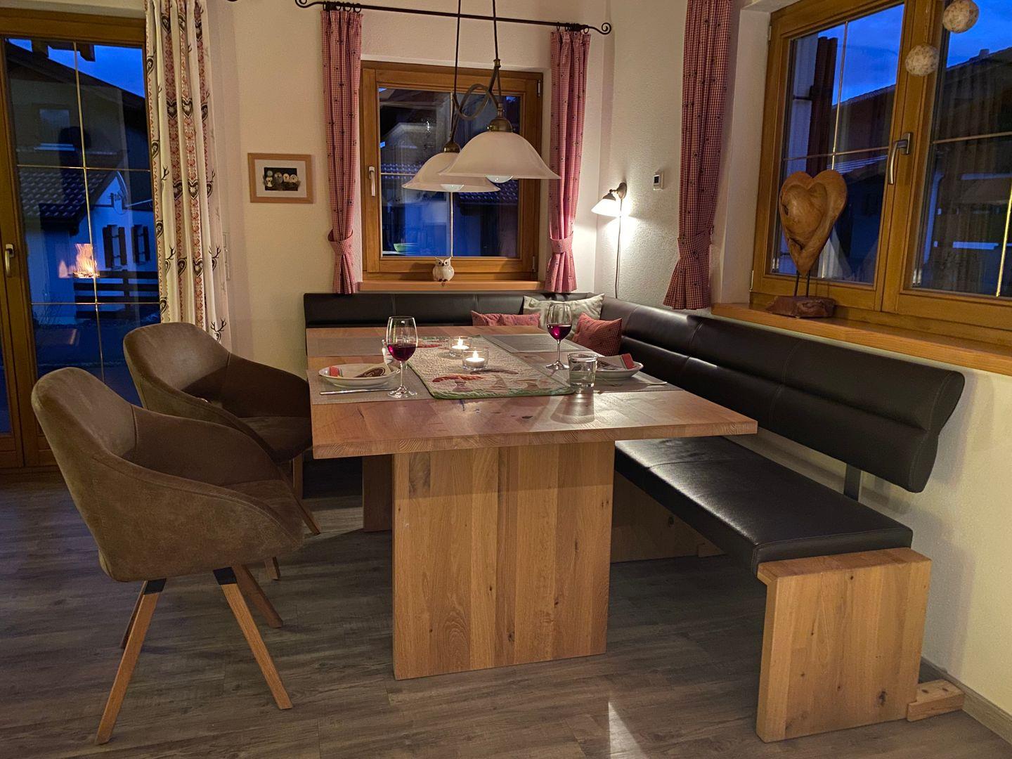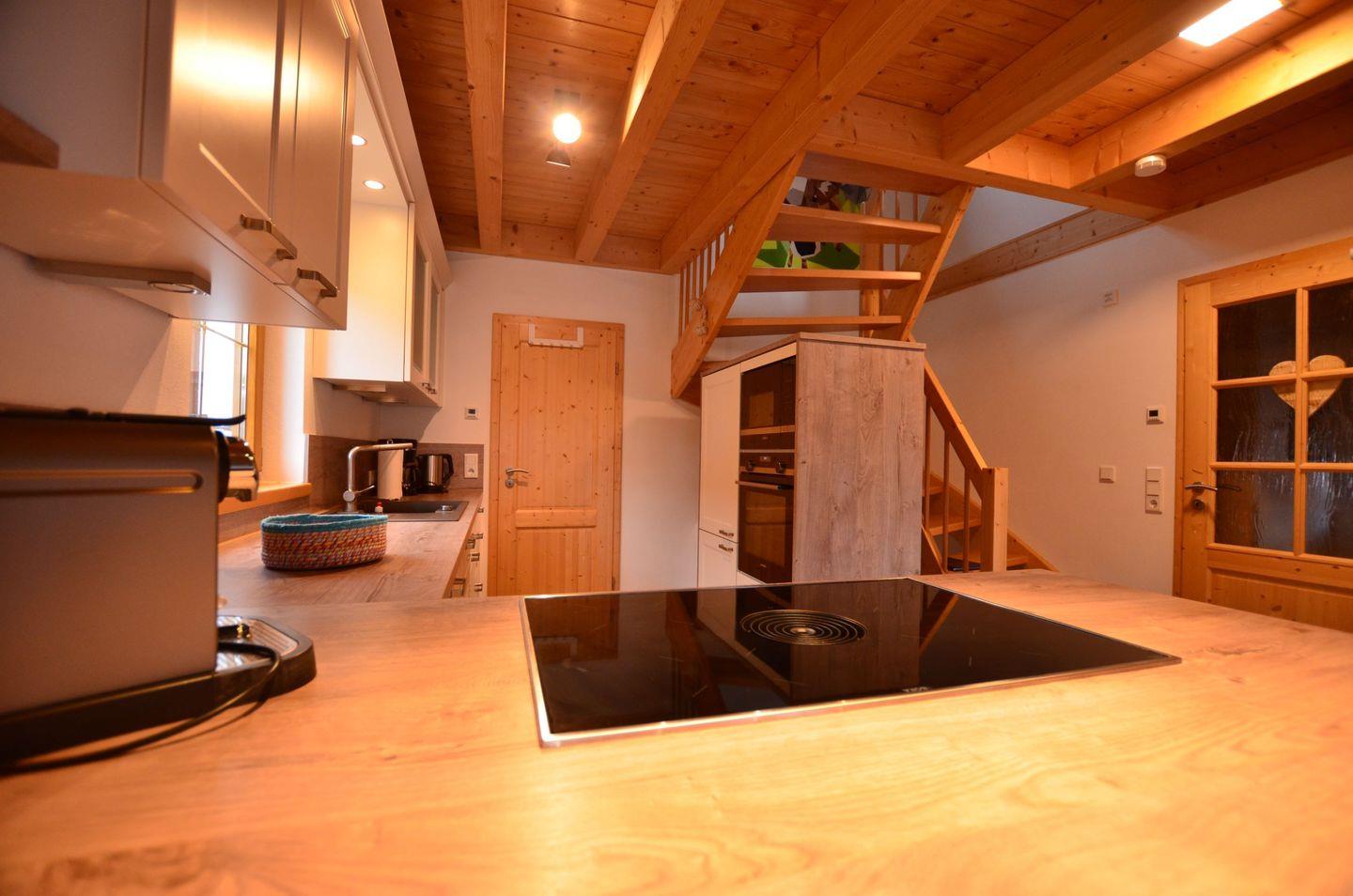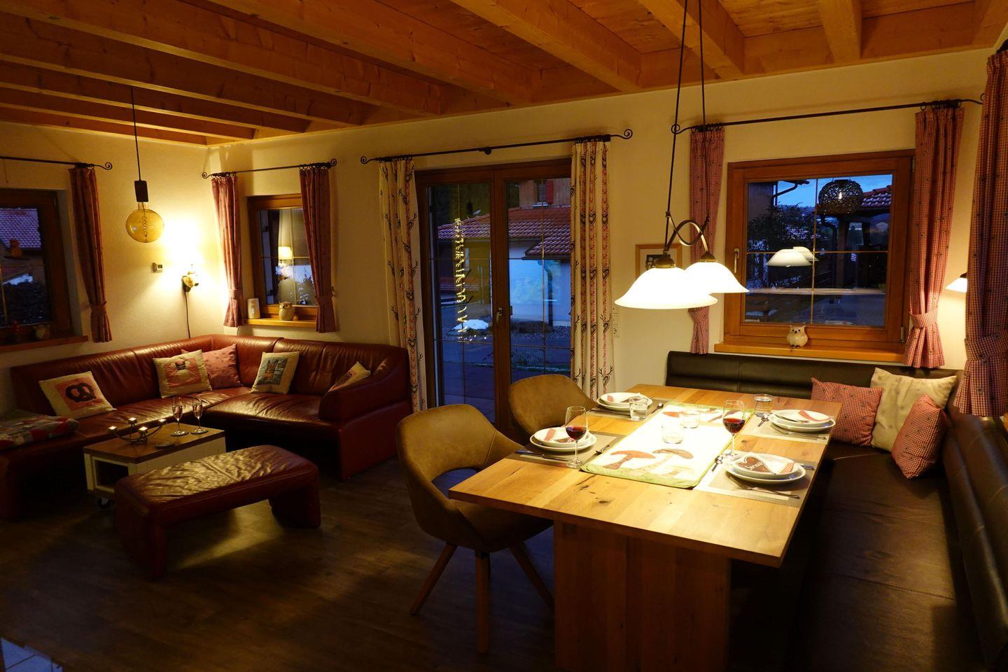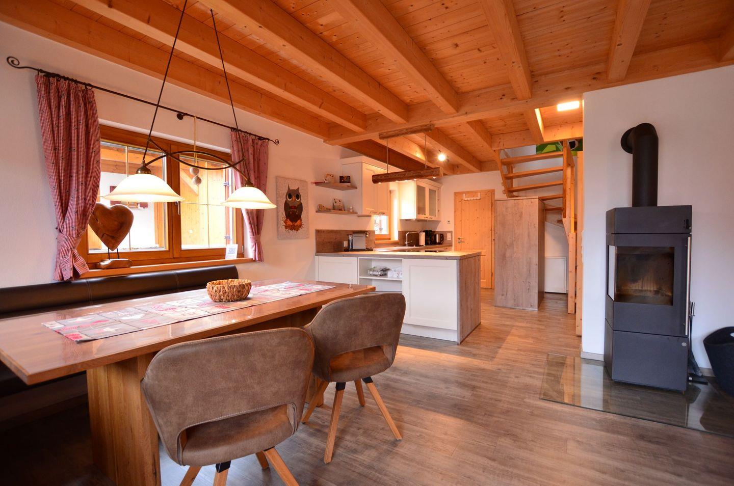Ein offener gemütlicher Wohnbereich mit Couch und Ofen und großem Esstisch, sowie eine komplett ausgestattete Küche lassen keine Wünsche offen und werden Ihnen einen erholsamen Urlaub bereiten.