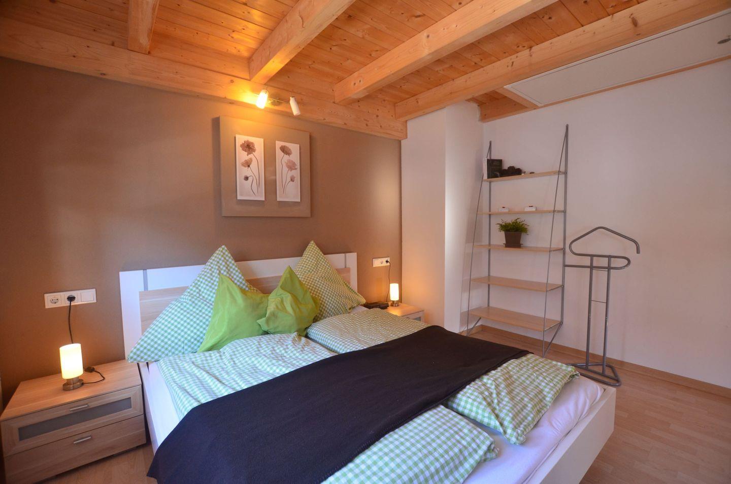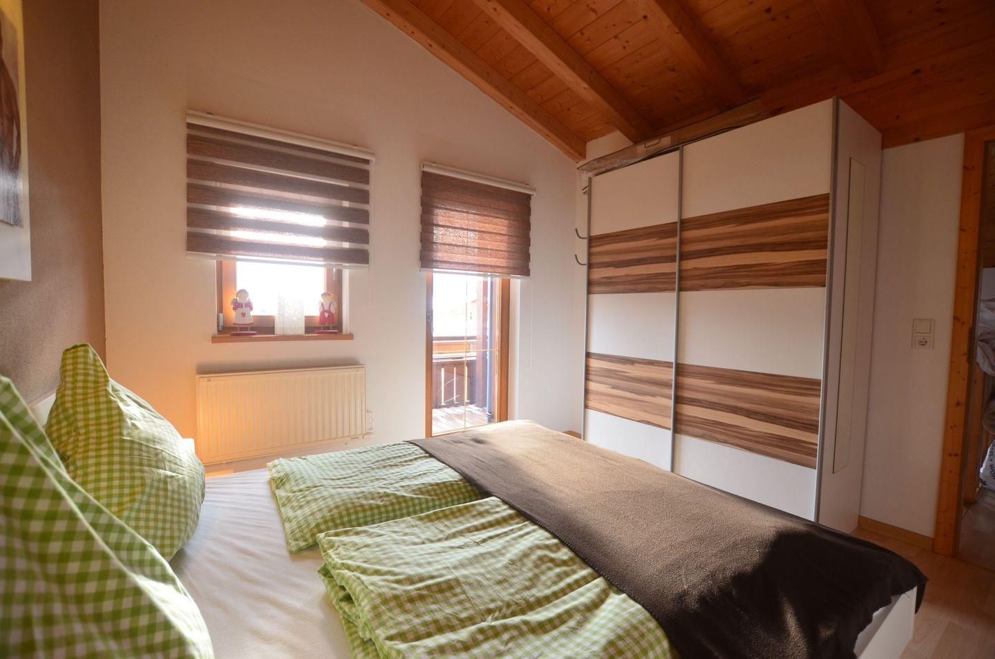 Die Schlafzimmer befinden sich im Obergeschoss. In einem genießen Sie zu einem gemütlichen Doppelbett zusätzlich die Aussicht vom angrenzenden Balkon.