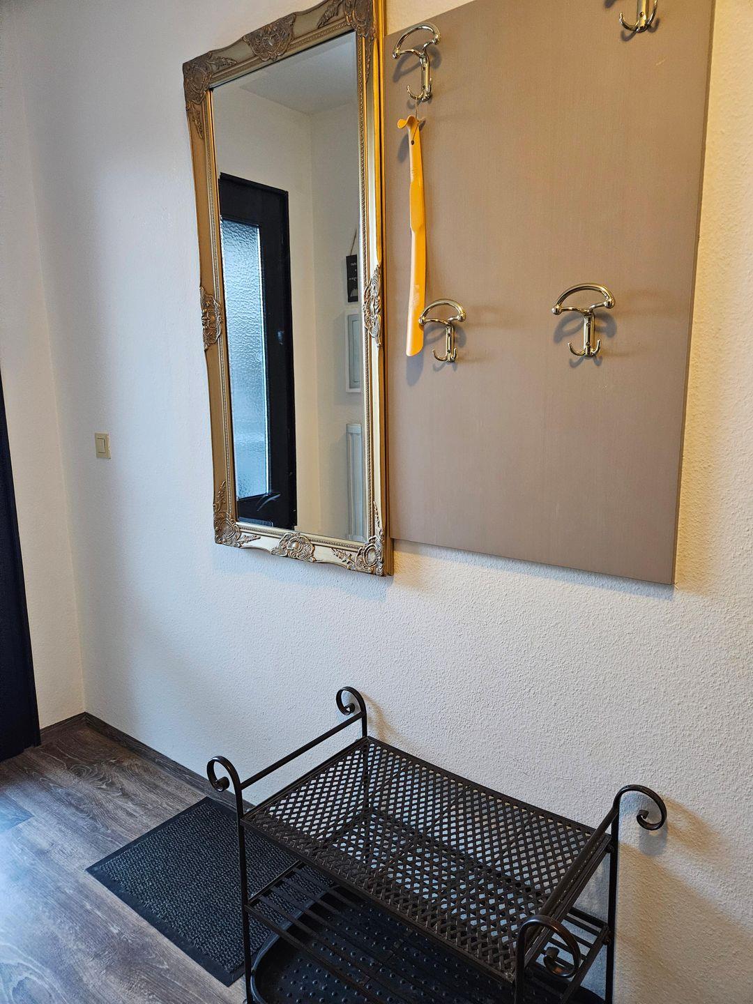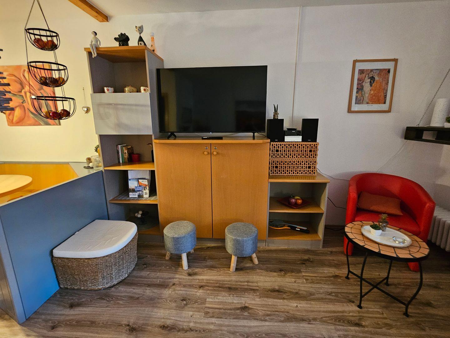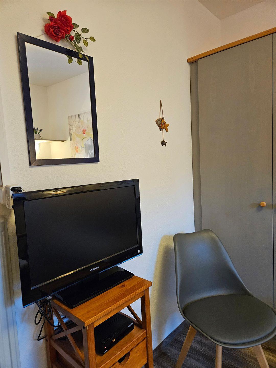 Die geschlossene Küche ist voll ausgestattet und lässt keine Wünsche offen: Cerankochfeld, Backofen, Mikrowelle, Geschirrspüler, Kühlschrank mit Gefrierfach, Kaffeemaschine sowie eine Kapselmaschine, Wasserkocher und Toaster. Geschirr und Besteck sind selbstverständlich ebenfalls vorhanden, sodass gemeinschaftlichen Mahlzeiten im angrenzenden Essbereich nichts im Wege steht. Neben einer Garderobe sorgen eine Kommode sowie ausreichend Stauraum für Komfort. Im Badezimmer erwartet Sie eine moderne Dusche sowie Waschbecken, WC, Fenster und ein Haartrockner.