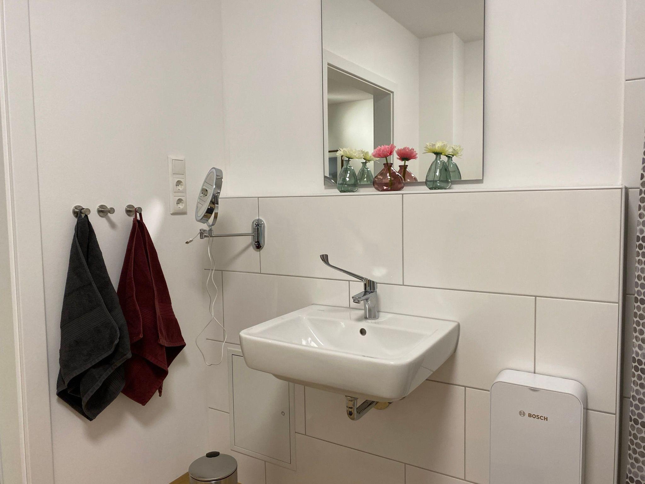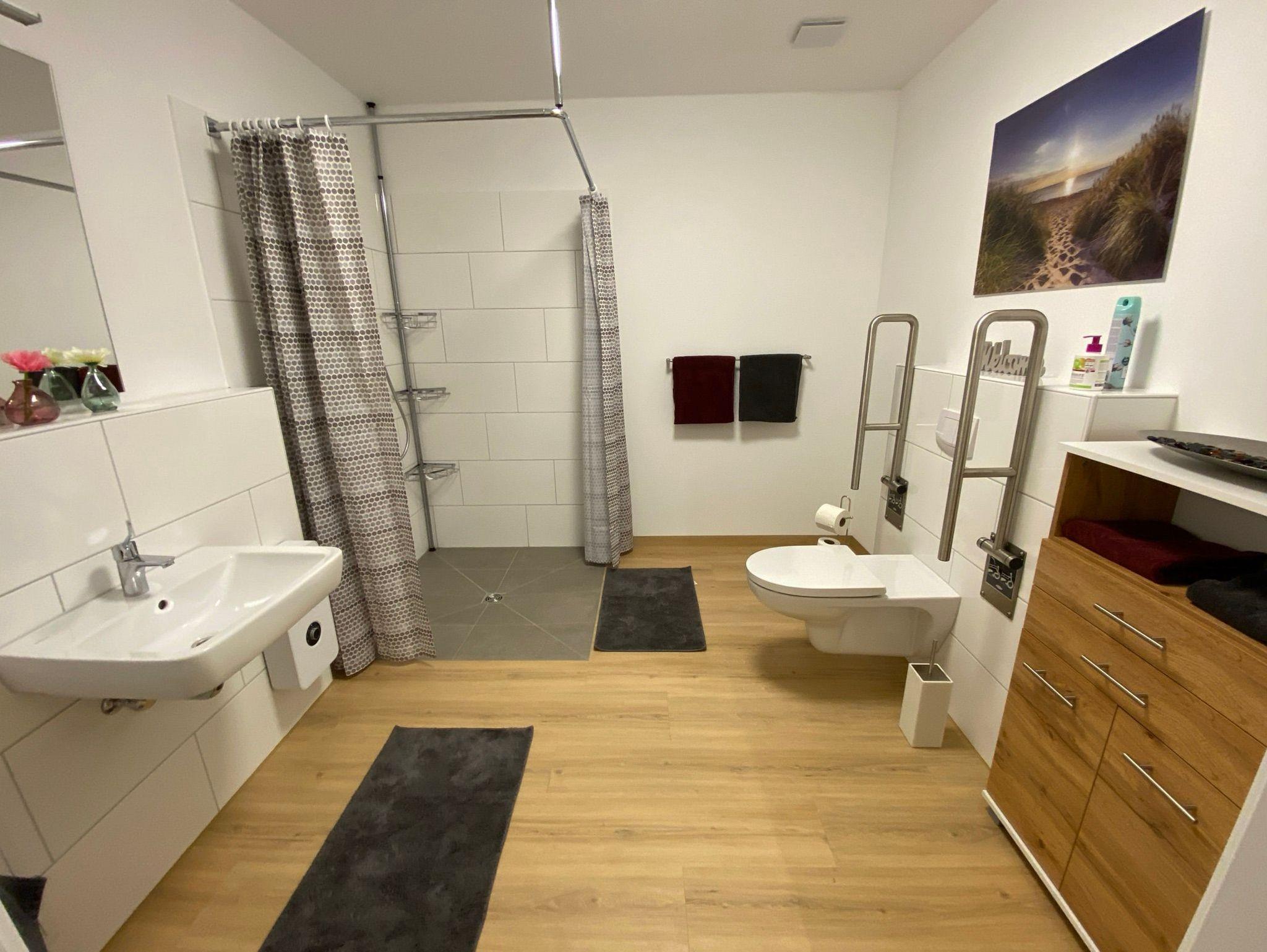 Schöne, geschmackvoll eingerichtete Ferienwohnung mit komplett ausgestatteter Küche für 2 -3 Personen (73qm), barrierefrei und rollstuhlgeeignet in sehr zentraler Lage von Leer-Loga. Die Wohnung verfügt über einen Wohn-Essbereich mit offener Küche, ein Schlafzimmer, ein Bad (behindertengerecht), einen Flur und einen kleinen Garten mit Terrasse. Zur Wohnung gehört ein behindertengerechter Parkplatz, ein abschließbarer Keller und eine E-Bike Ladestation, der Keller ist über Fahrstuhl und Treppe erreichbar.