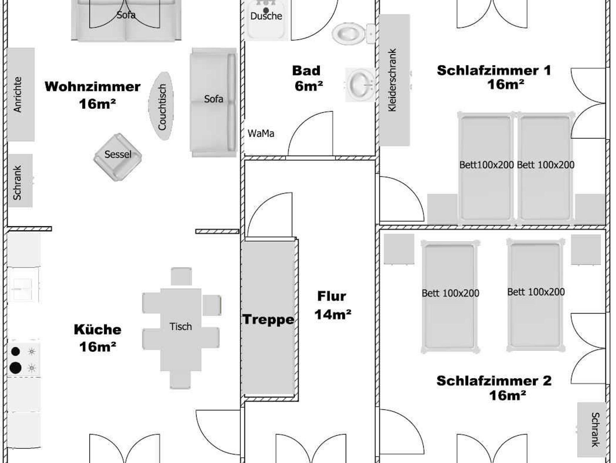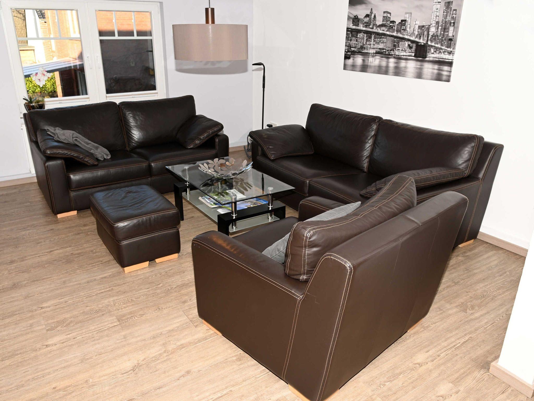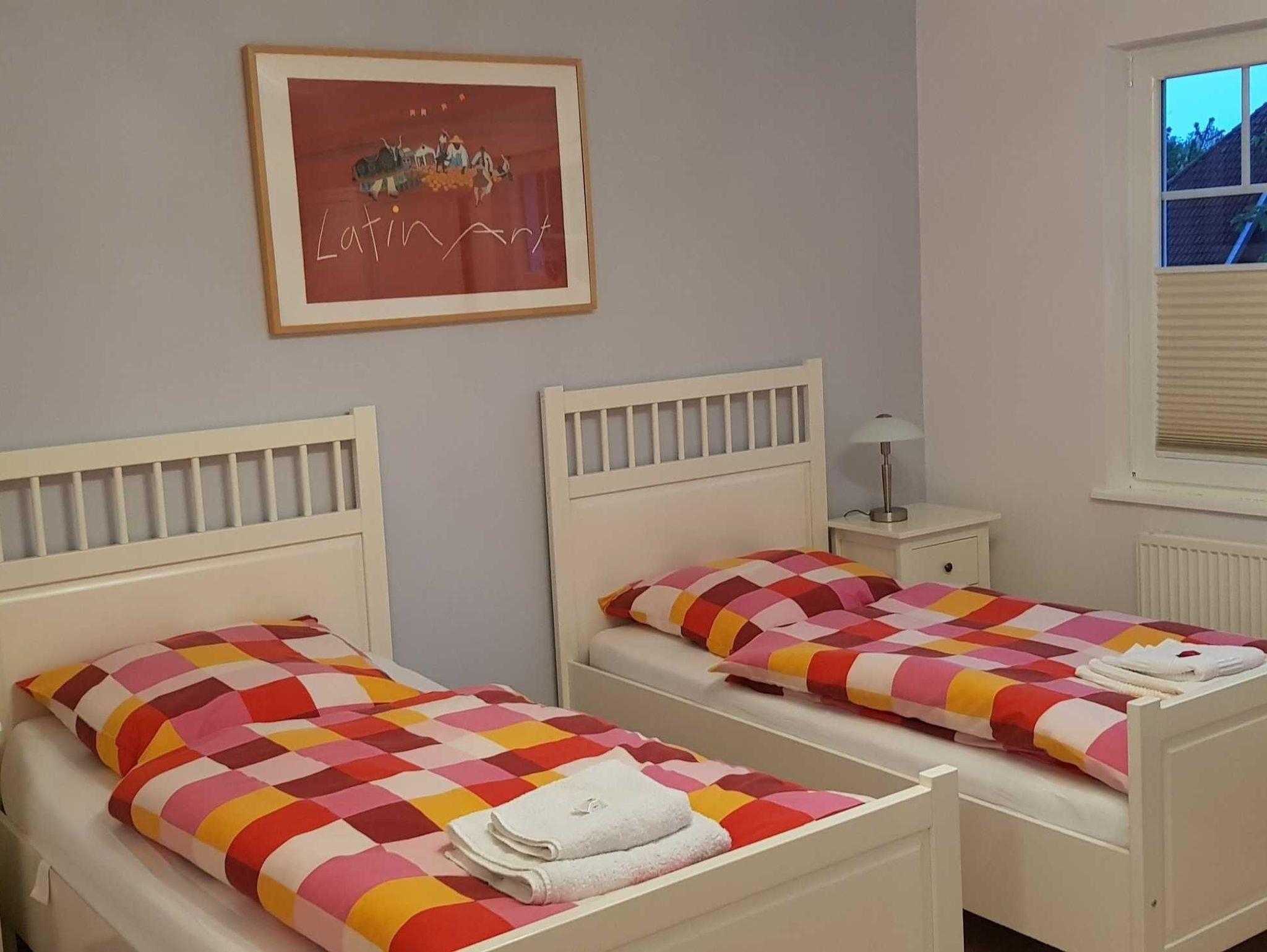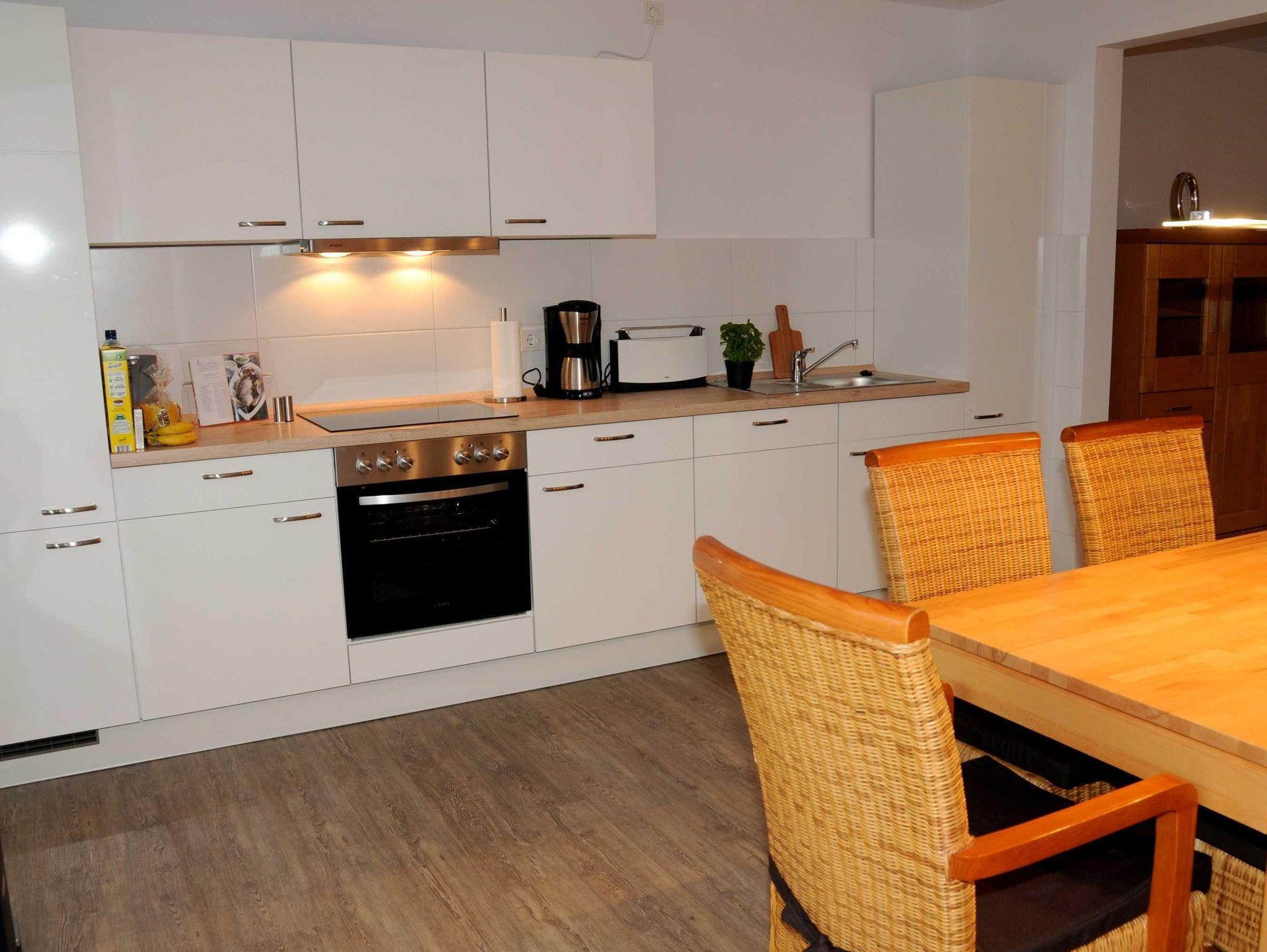 In der Wohnung befinden sich weiter zwei gemütliche, modern eingerichtete Schlafzimmer, eines mit Doppelbett, das Andere mit zwei Einzelbetten, die wahlweise zu einem Doppelbett zusammengestellt werden können. Eine neue, komplett ausgestattete, moderne Einbauküche inkl. Geschirrspülmaschine, Waschmaschine, E-Herd mit Ofen, Mikrowelle, Eierkocher, Kaffeemaschine und Toaster lässt keine Wünsche offen, an die offene Küche gliedert sich das Wohnzimmer mit Ledergarnitur (3-2-1), Kuschelkissen und Decken, Flachbildfernseher und Stereoanlage. Im ganzen Haus 50 Mbit WLAN.