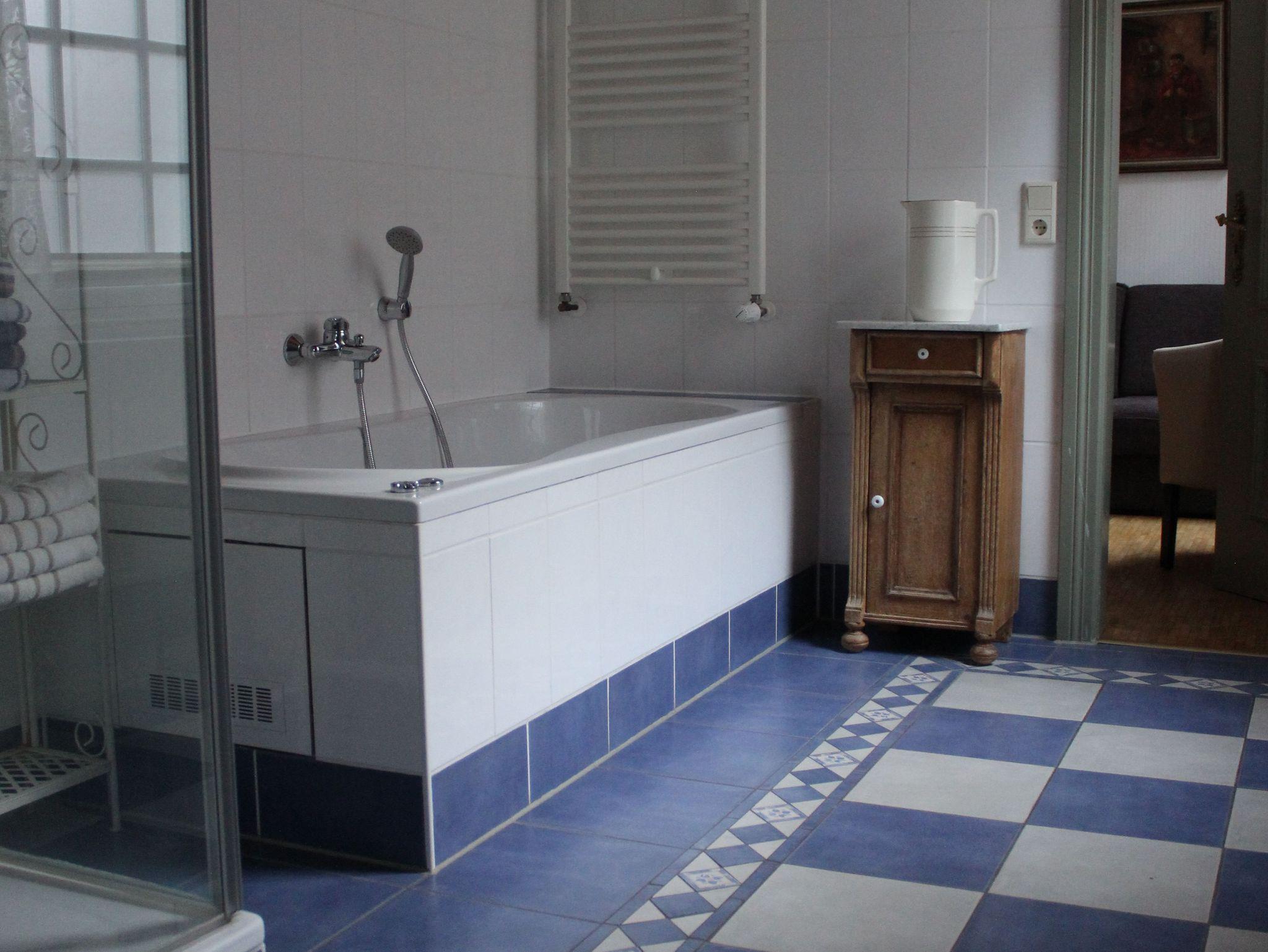 Diese gemütliche Wohnung hat eine Größe von 55 qm. Sie verfügt über eine vollausgestattete Küche, ein gemütliches Wohnzimmer mit Kamin und stilvollen Antiquitäten-Möbeln, ein großes Badzimmer mit Badewanne, Dusche und WC, sowie ein Schlafzimmer mit Doppelbett.