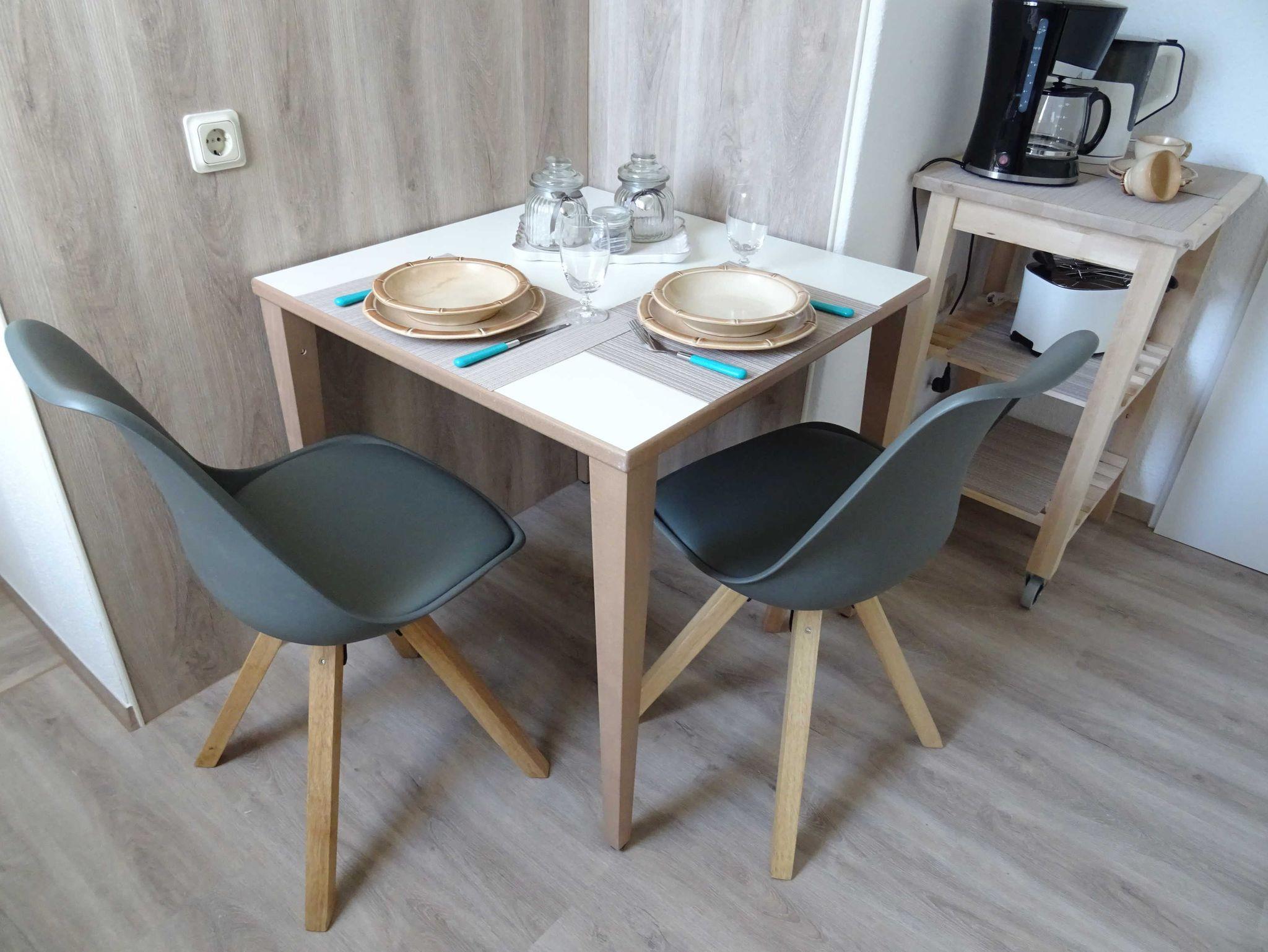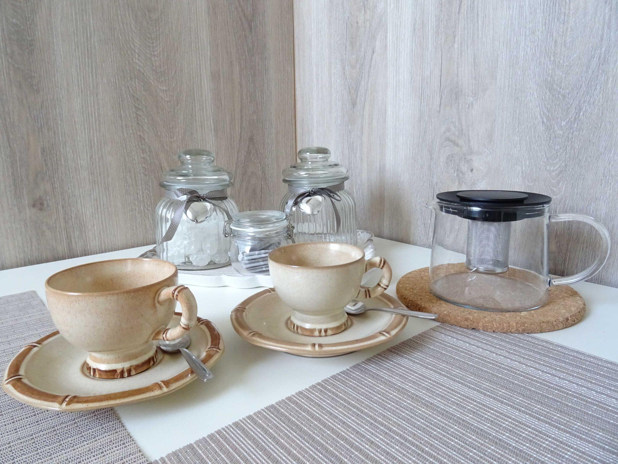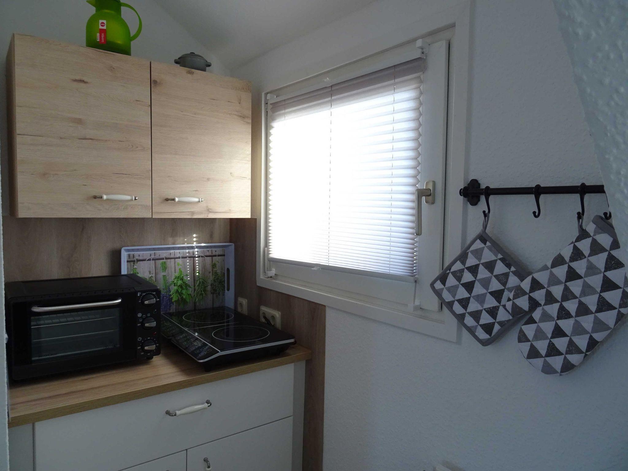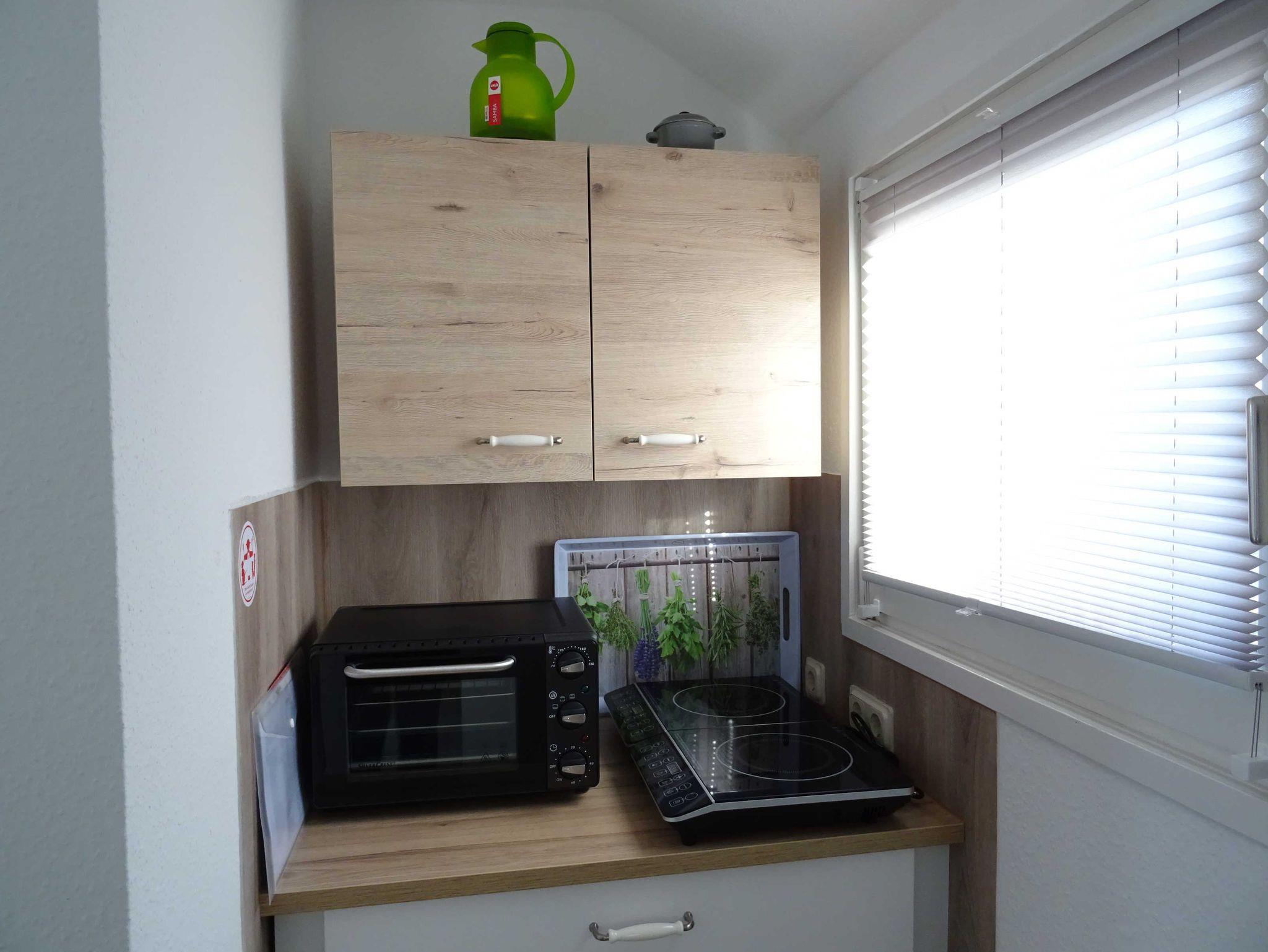 In der kleinen, individuellen Frühstücksküche mit Sitzecke gibt es neben einem kleinem Backofen einen Kühlschrank mit Gefrierfach, zwei Induktionsplatten und alles, was zu einer voll ausgestatteten Küche gehört.