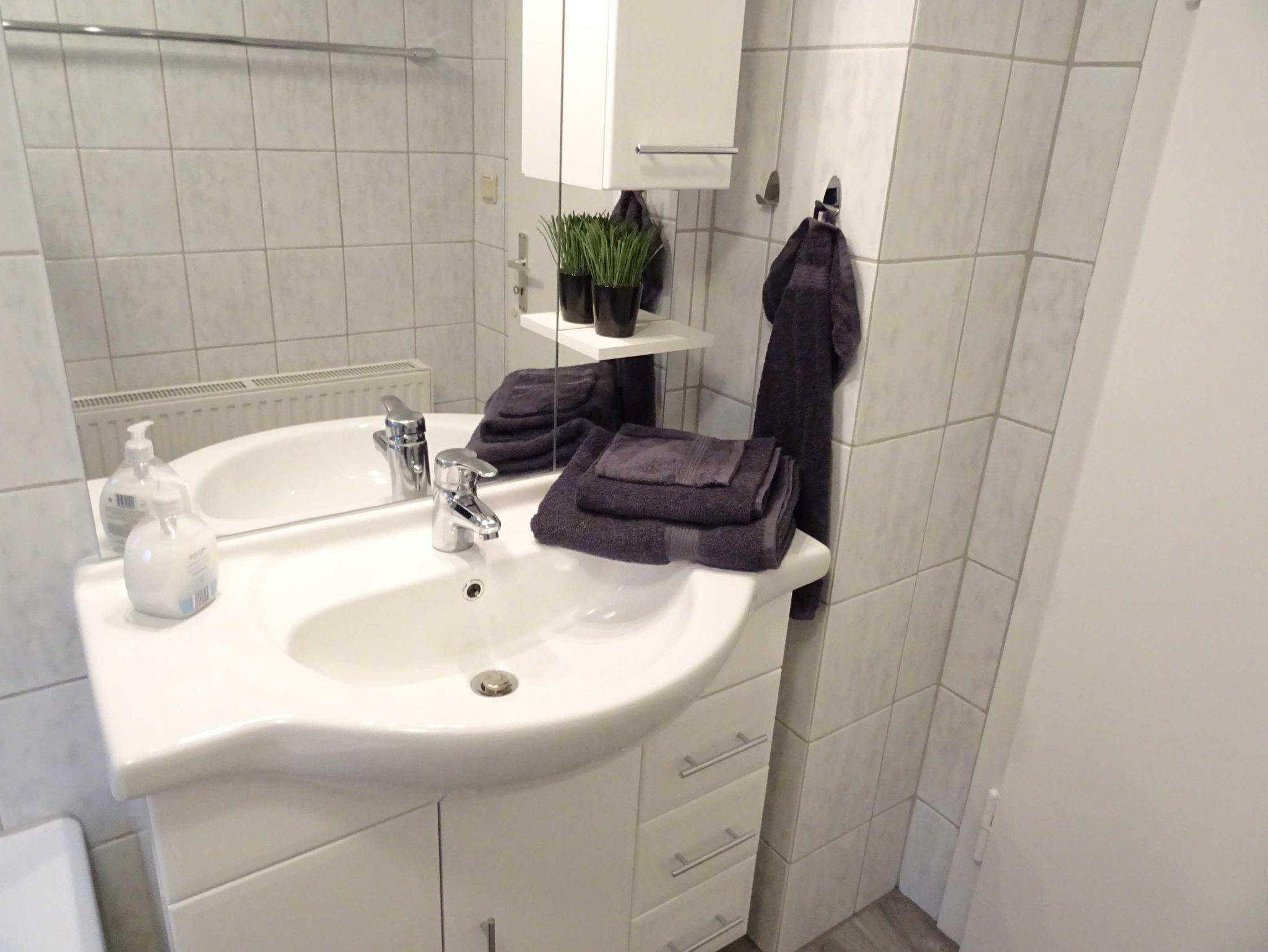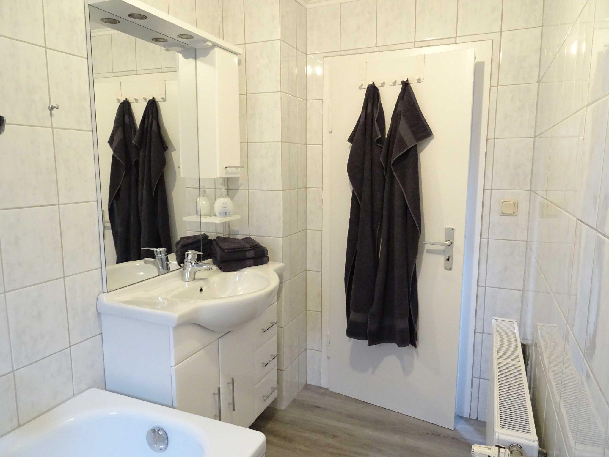 Das Badezimmer ist mit einer Dusch-Badewanne und einem modernen Waschtisch ausgestattet.