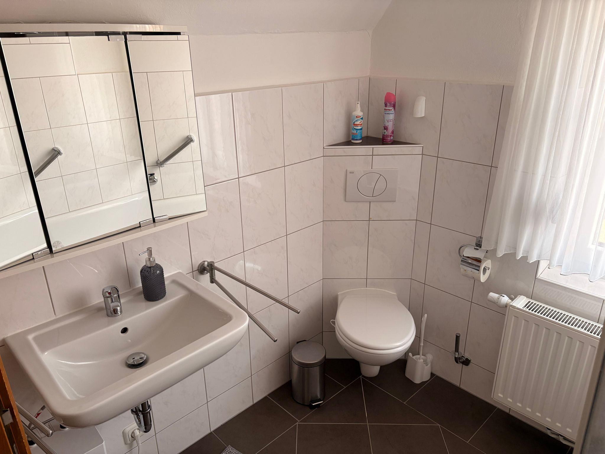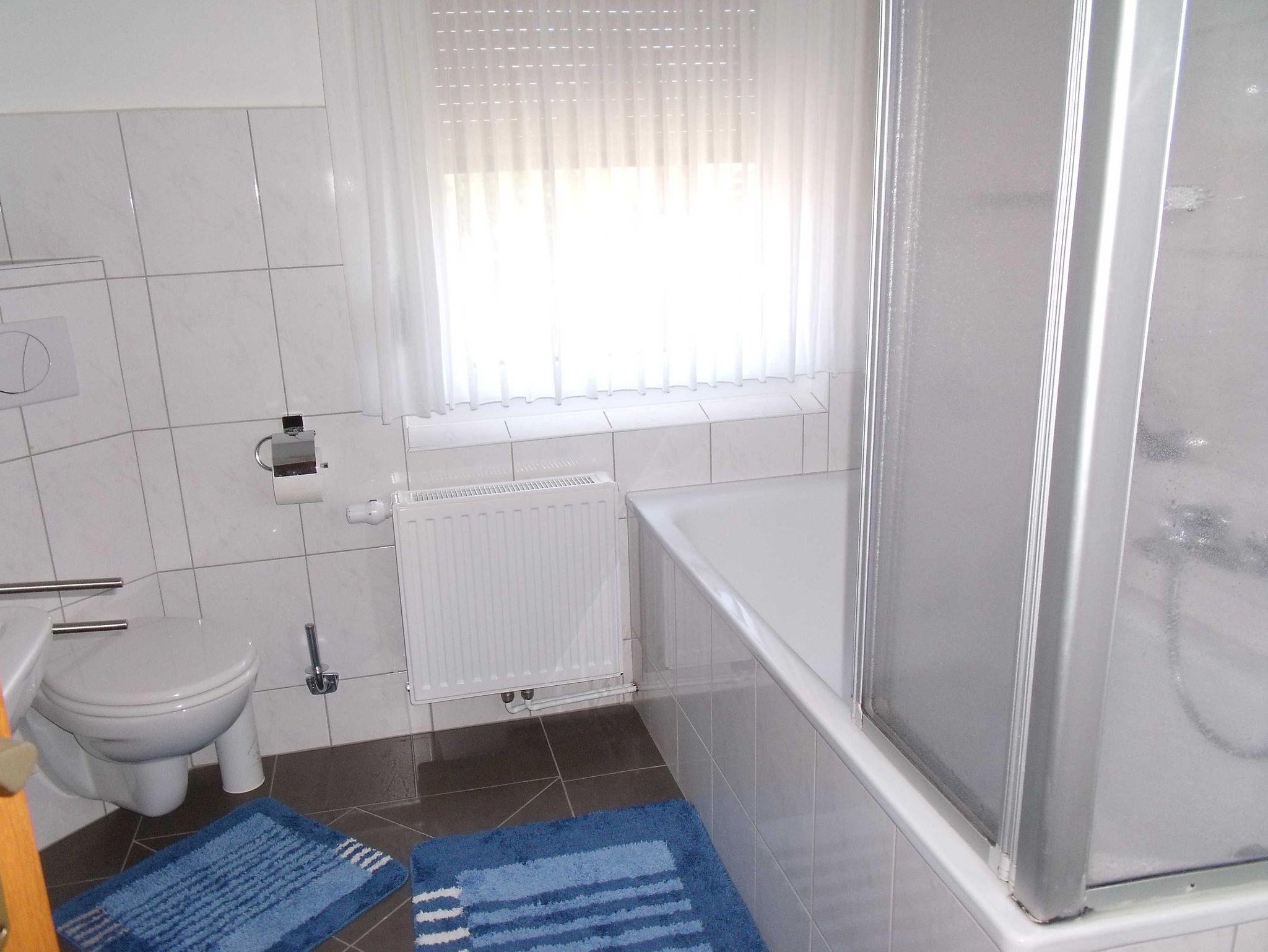 Das Badezimmer ist mit einer Duschbadewanne und WC ausgestattet.