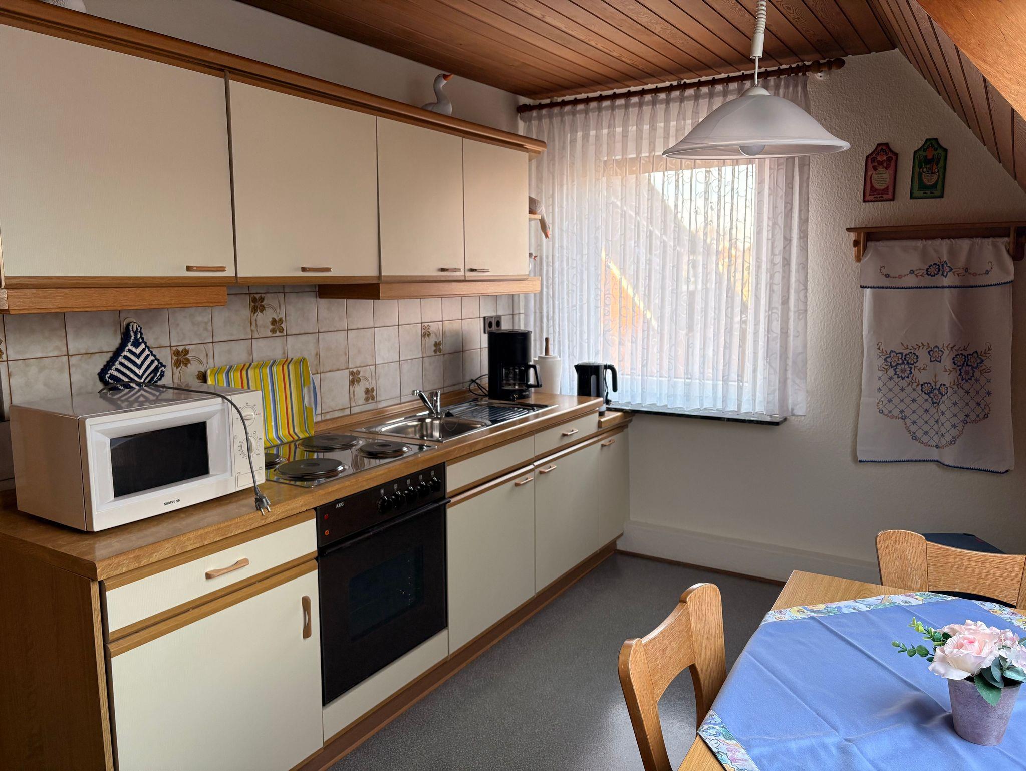 Komplett ausgestattete Küche mit Sitzgelegenheit für bis zu vier Personen.