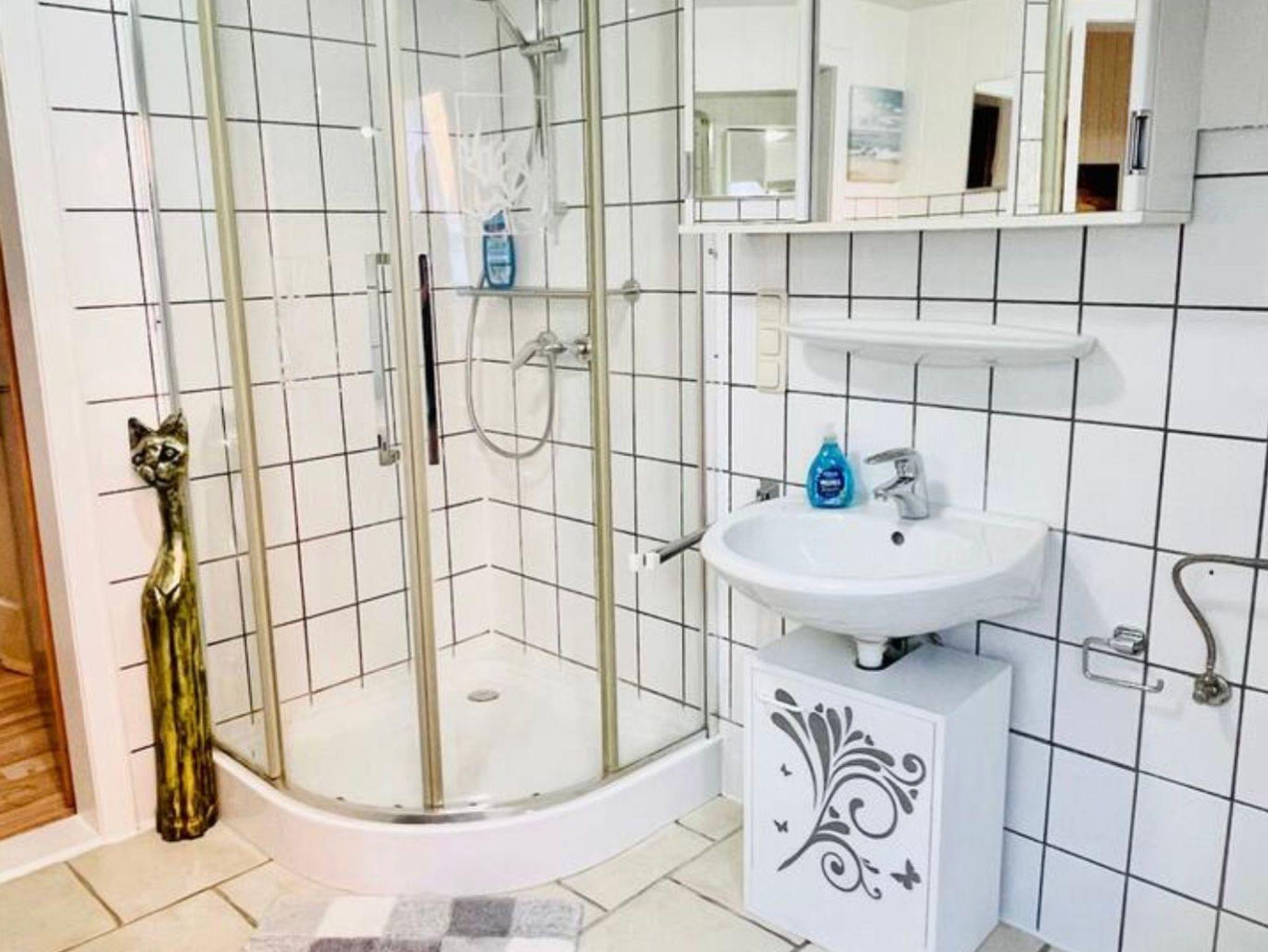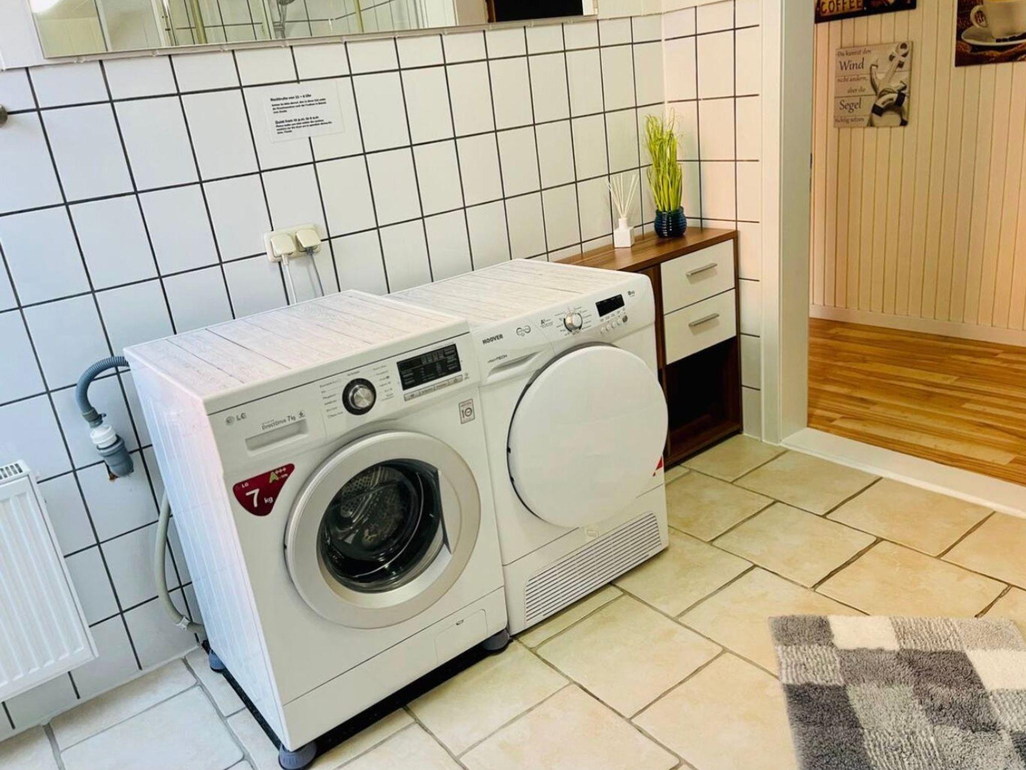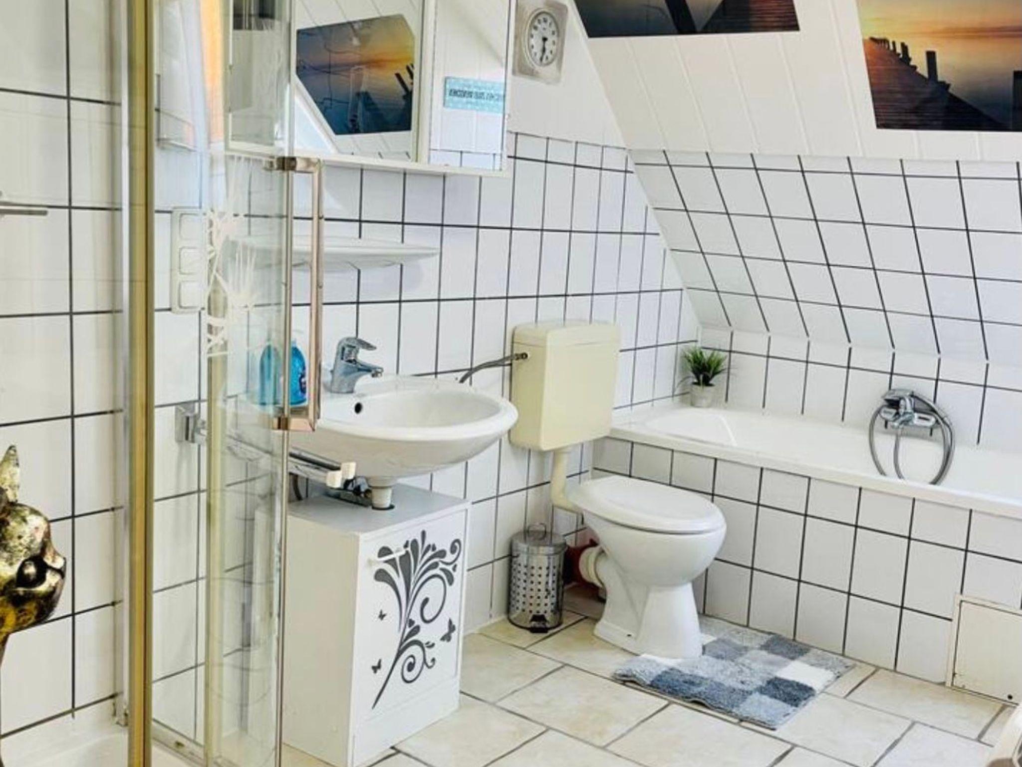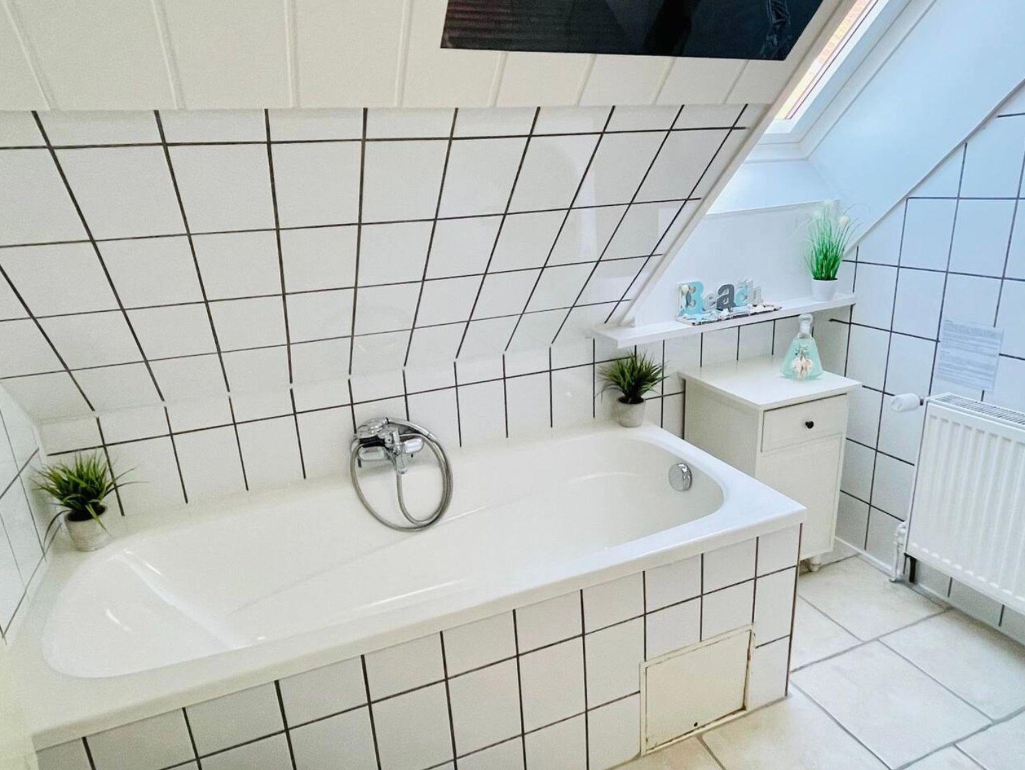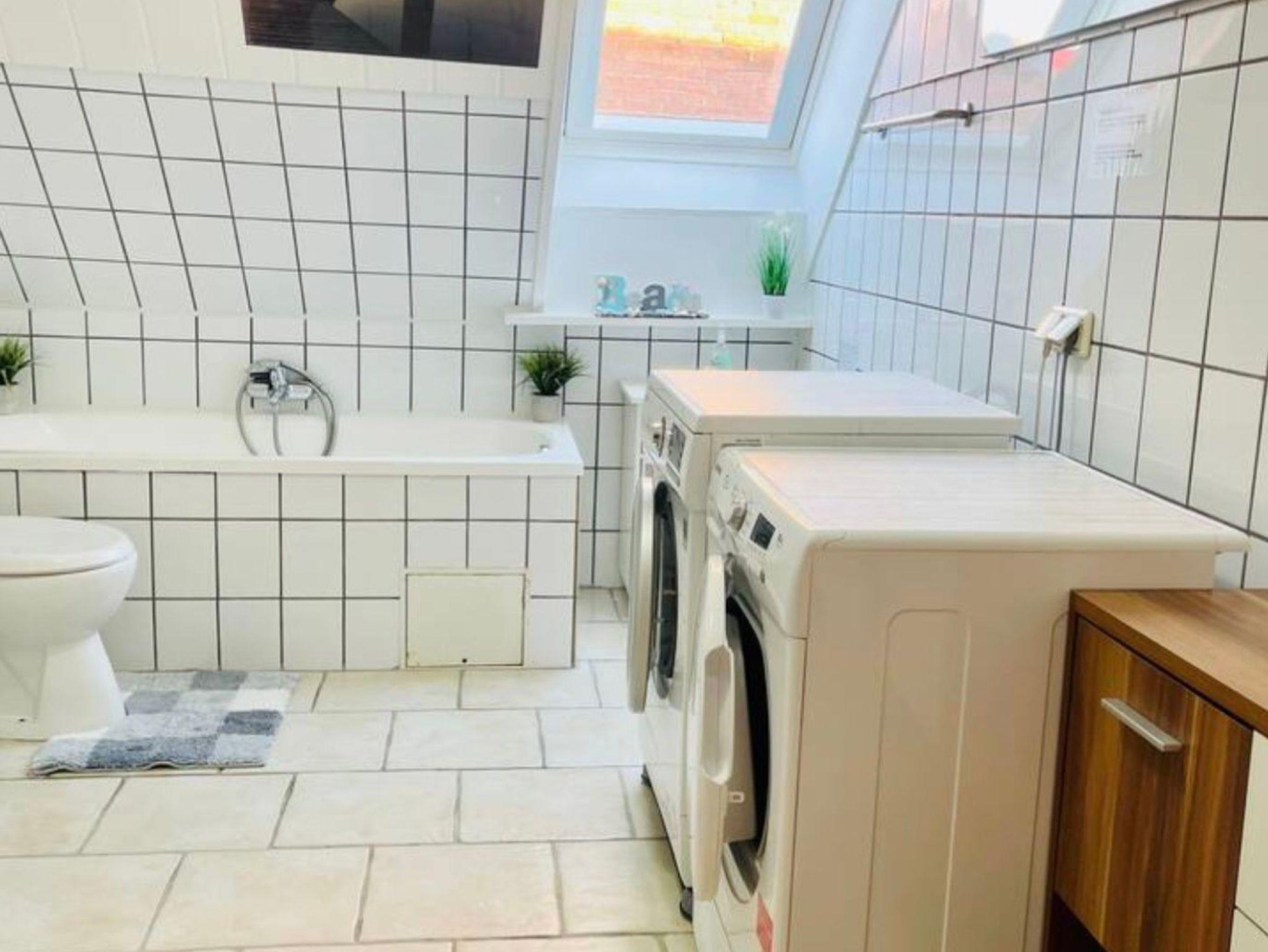 Gr. Bad m. Dusche, Wanne, WC, Waschmaschine + Trockner und Reinigungsmitteln