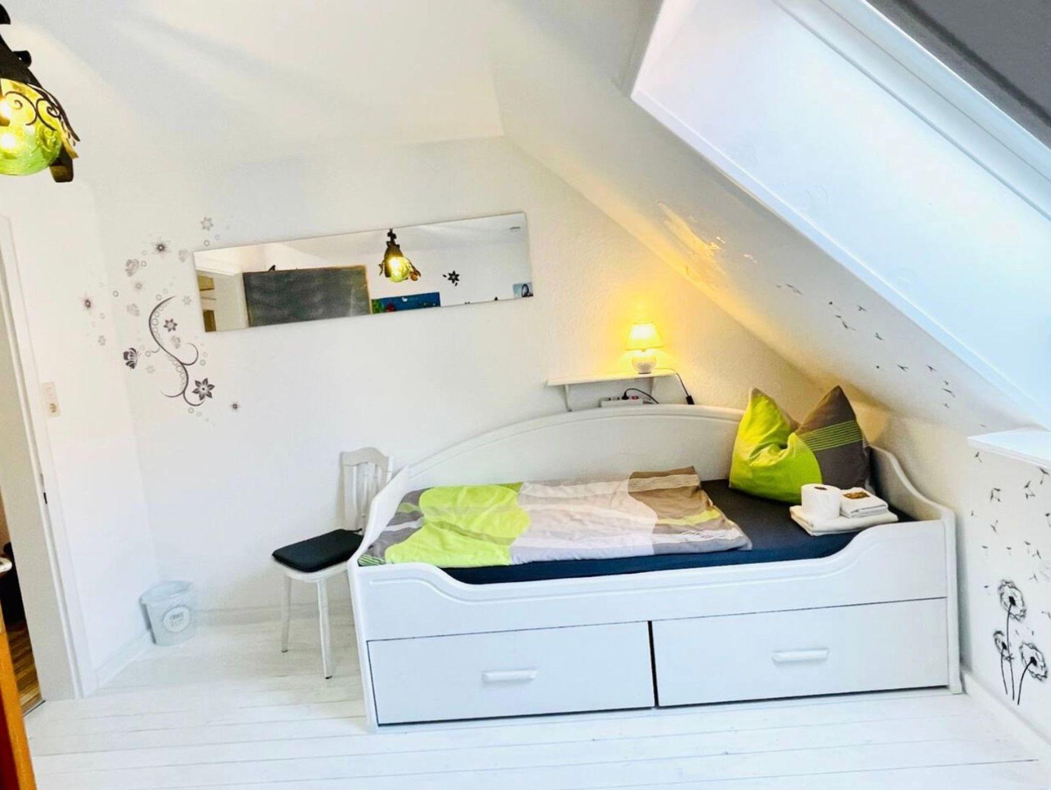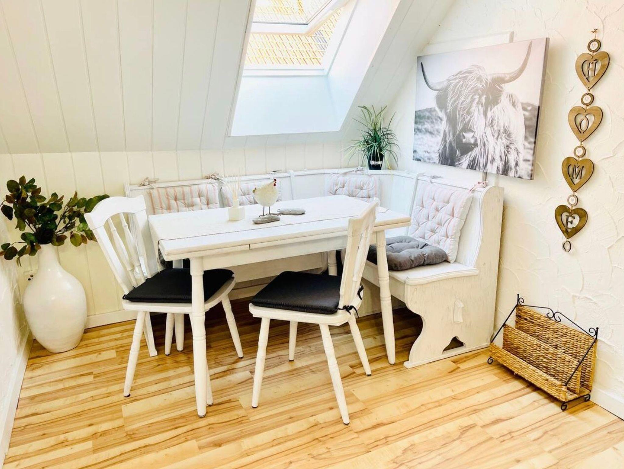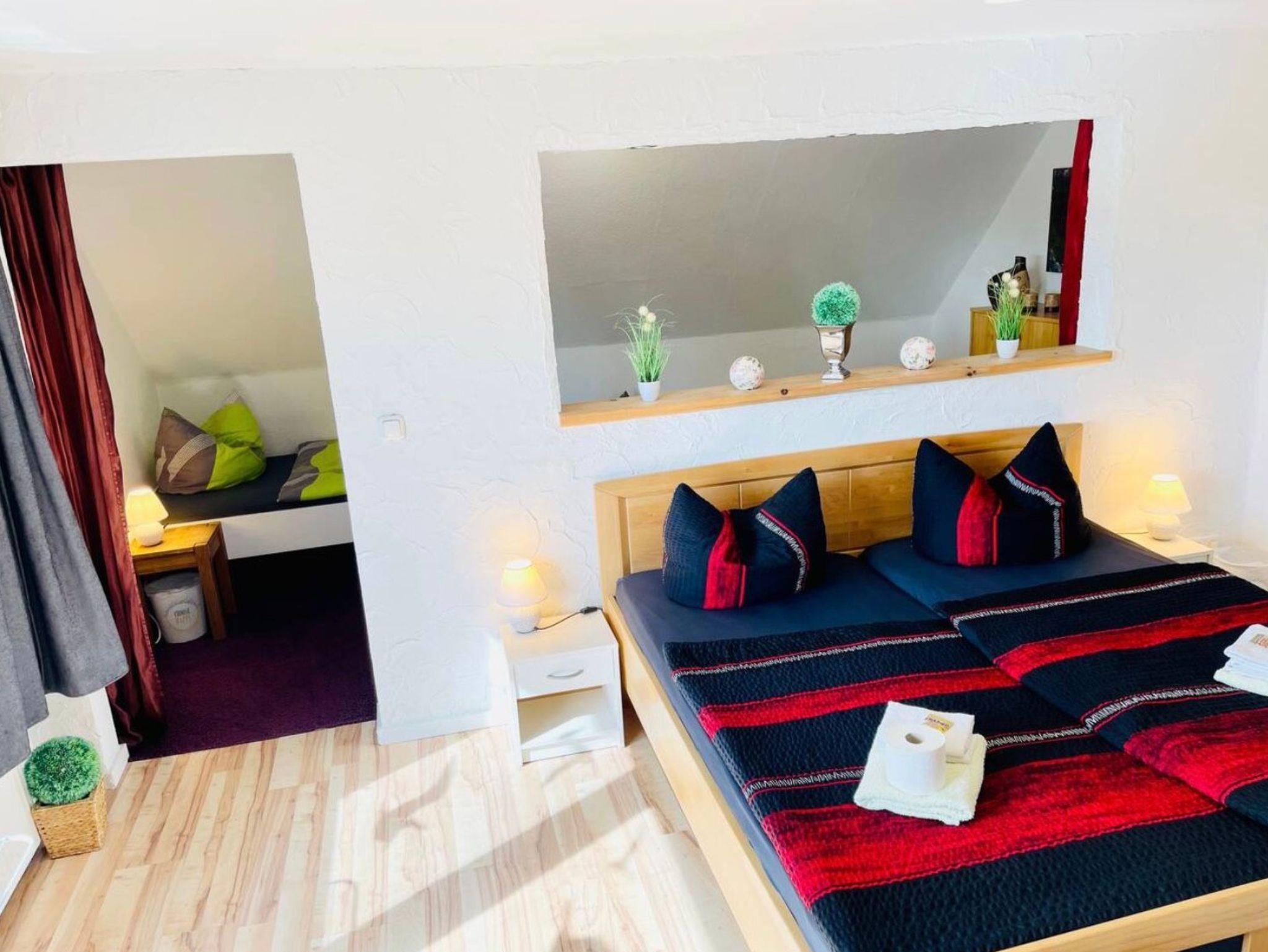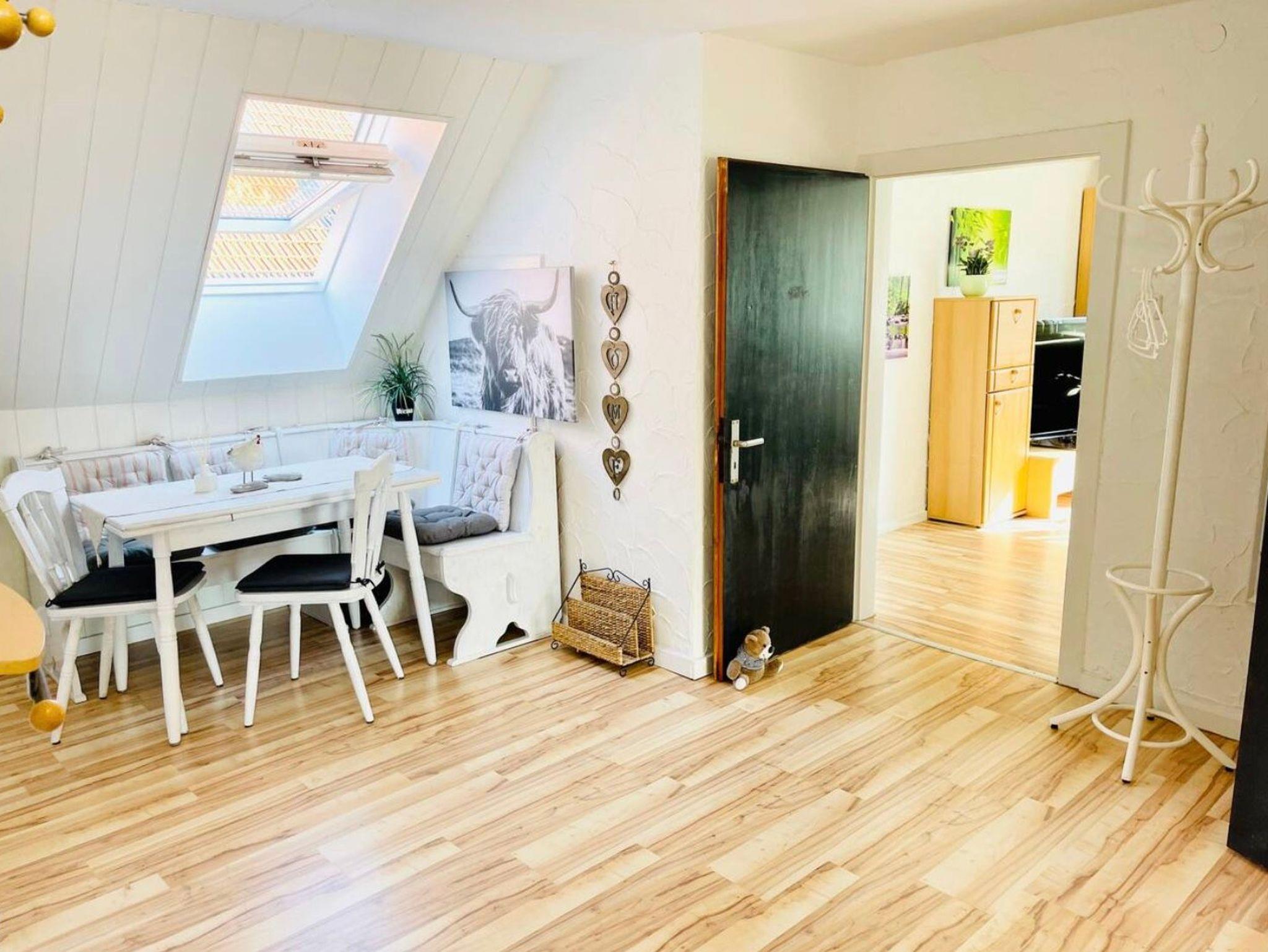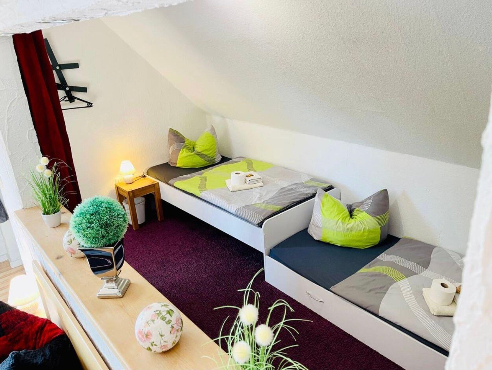 Große Ferien- bzw. Monteurswohnung (104 qm) im Dachgeschoss mit mehreren Schlafbereichen für bis zu 7 Erwachsene + 1 Kleinkind bis 4 Jahre (zusätzliches Gitterbett). Großes Bad mit Badewanne, Dusche, Waschmaschine und Trockner vorhanden. Eigene Parkplätze und eine überdachte Außenterrasse gehören auch dazu. Für mehr Informationen, auch, was die Erstausstattung betrifft, lesen Sie gerne die ausführliche Beschreibung zum Objekt. Dort finden Sie auch noch weitere Fotos.
