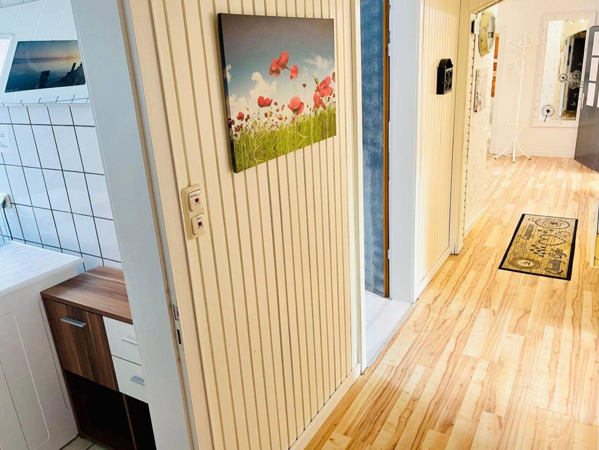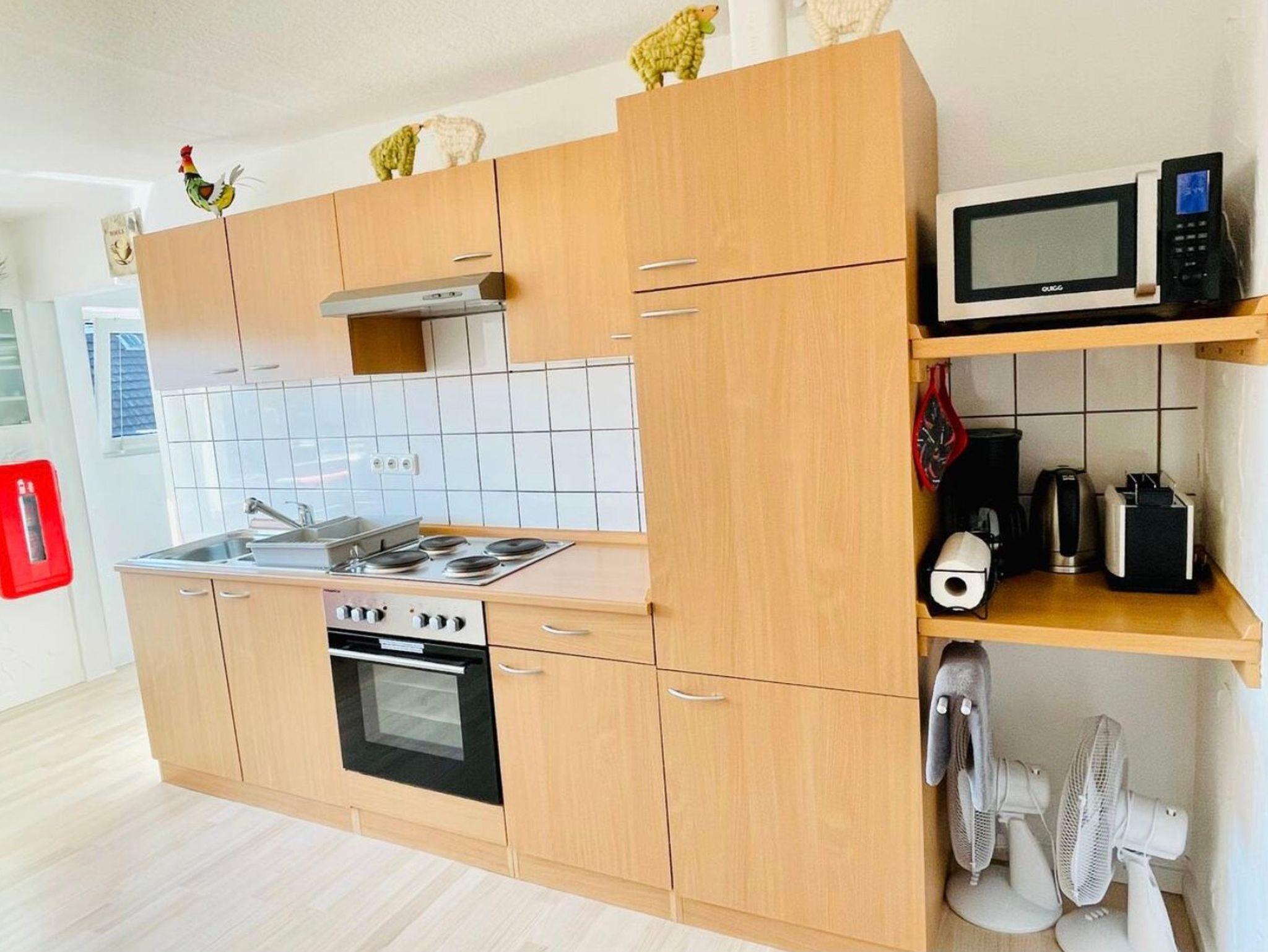 Hier befindet sich auch der Erste-Hilfe-Schrank, der Feuerlöscher, der Sicherungskasten und die Mülltrennung. Ihnen stehen außerdem eine Kaffeemaschine inkl. Filter (Kaffee bitte selbst mitbringen), ein Toaster, 2 Ventilatoren und eine Mikrowelle zur Verfügung.