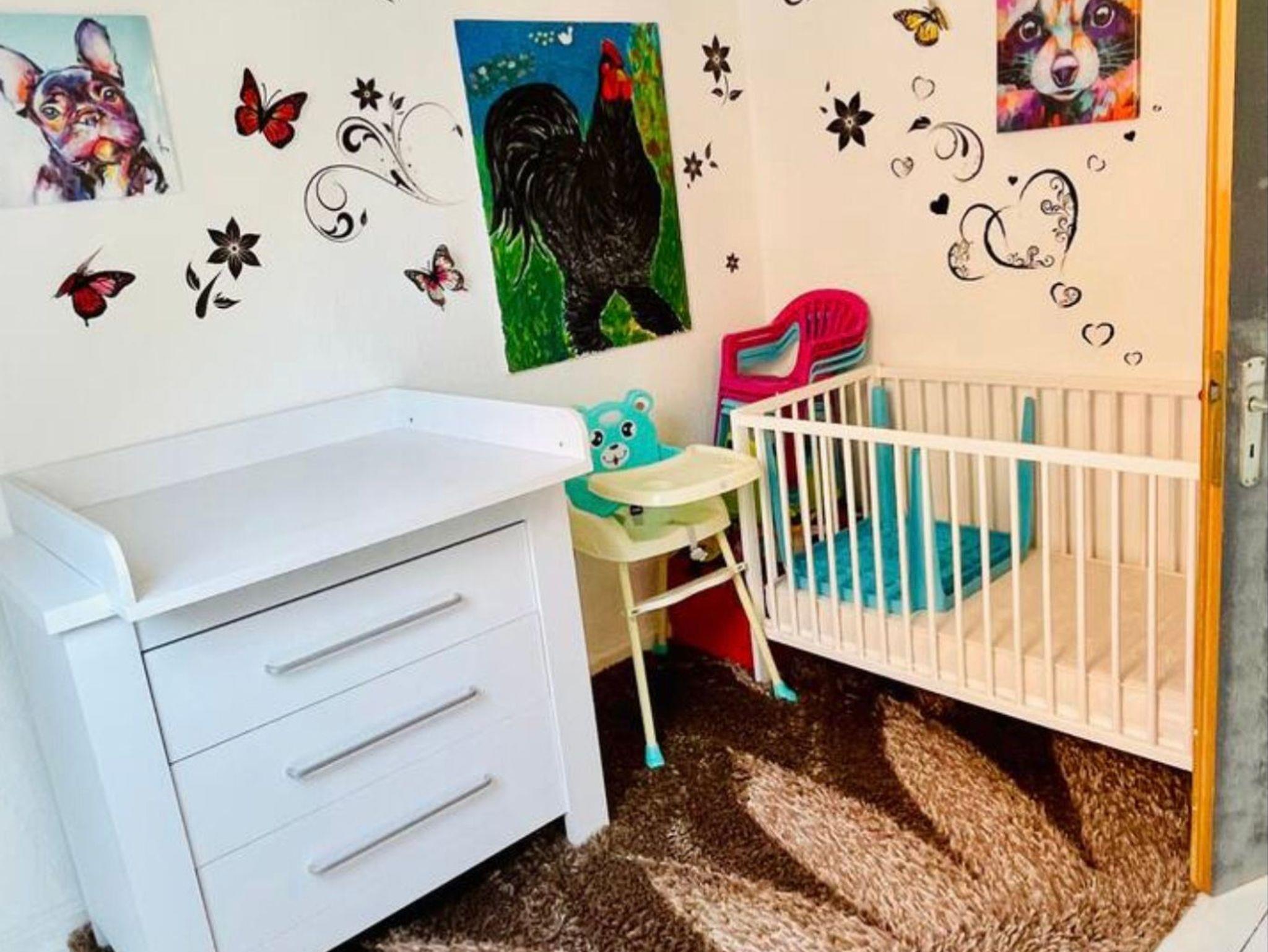 Schlafzimmer 3 (Kinderzimmer) mit Einzelbett, Gitterbett, Wickeltisch und div. Zubehör für kleine Gäste.