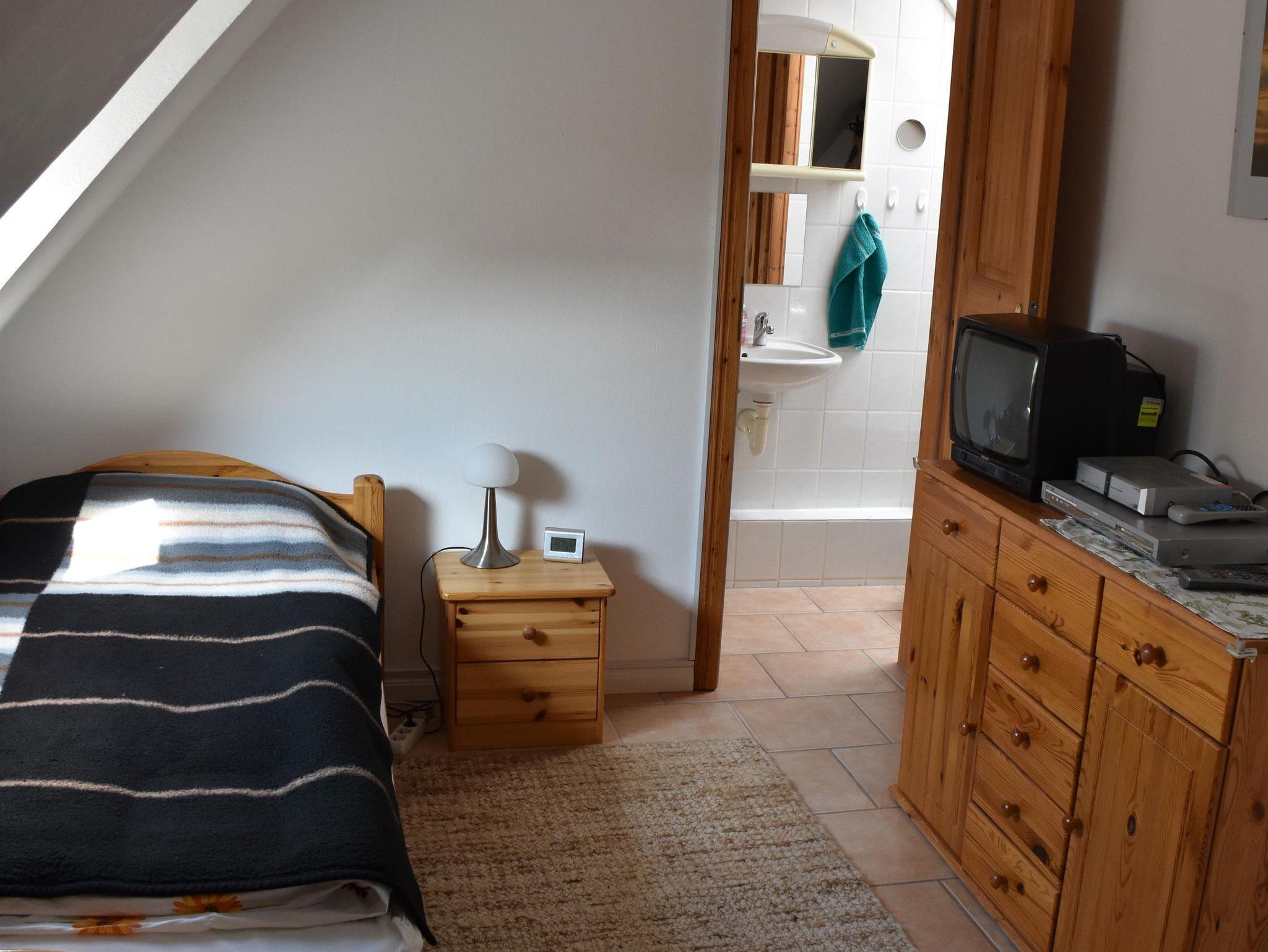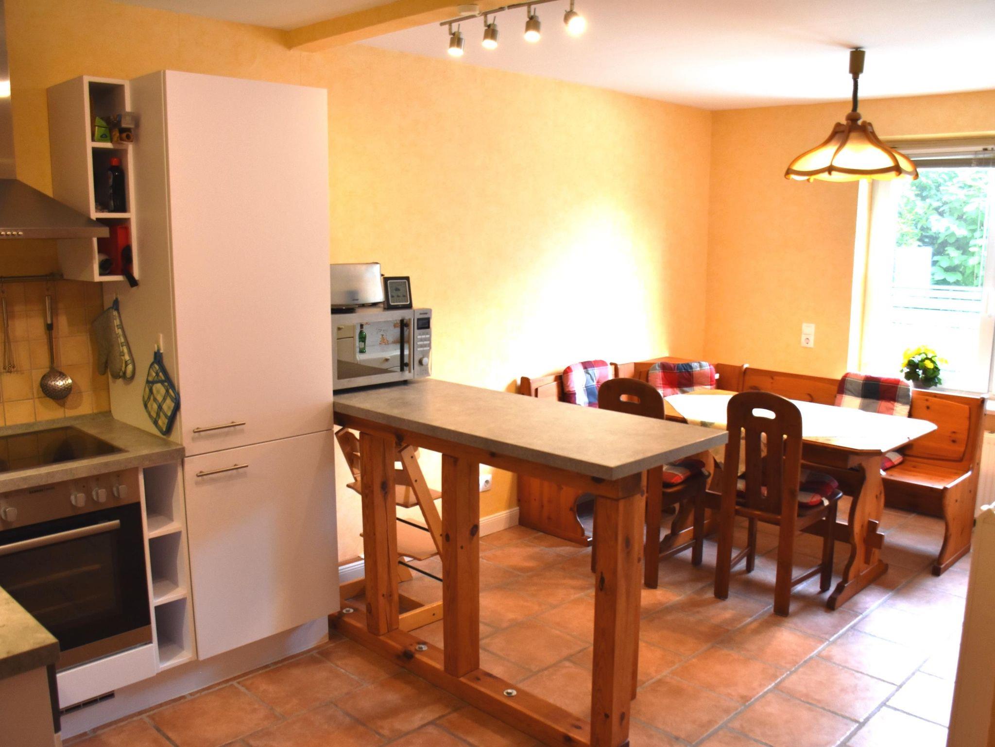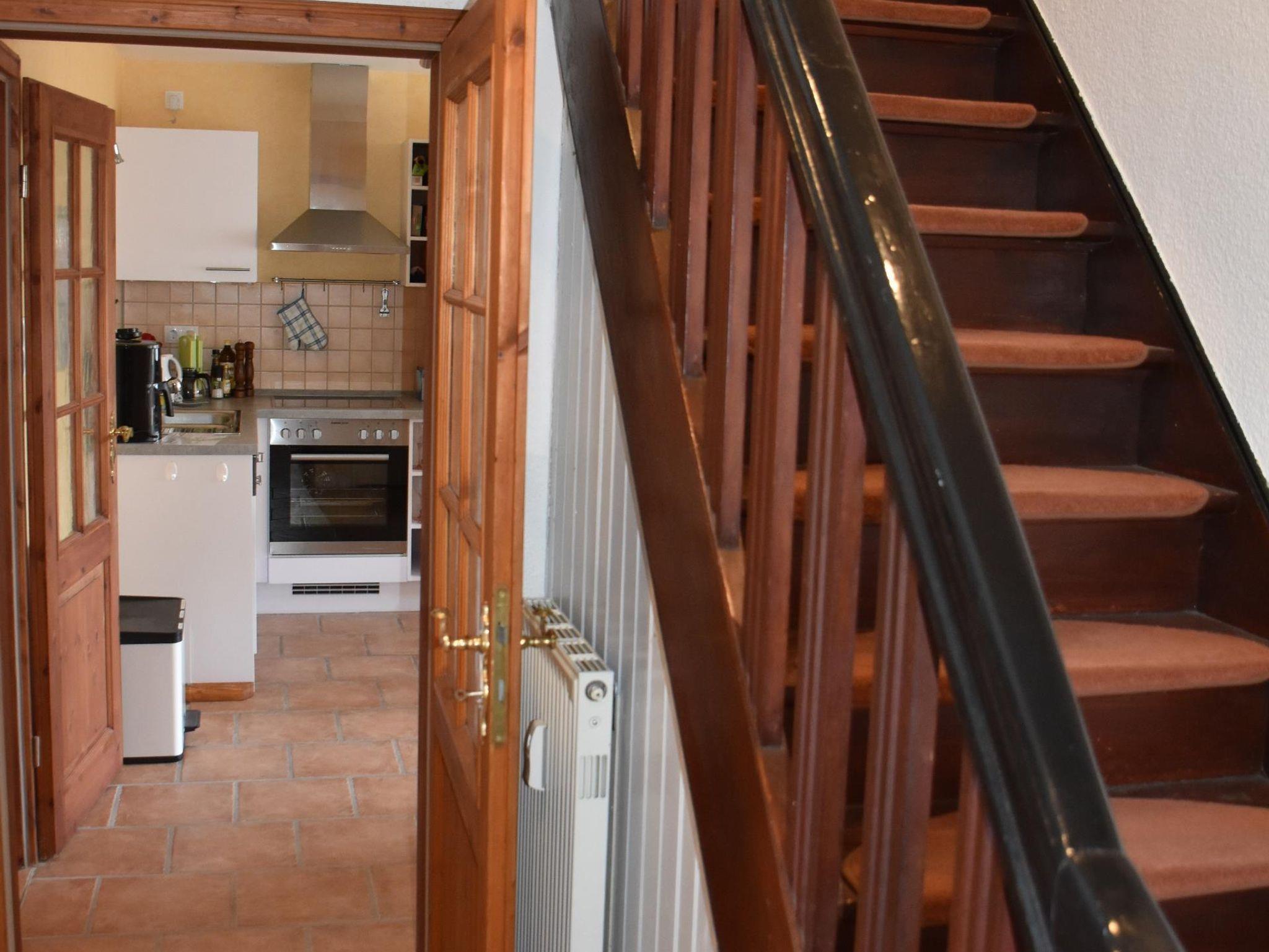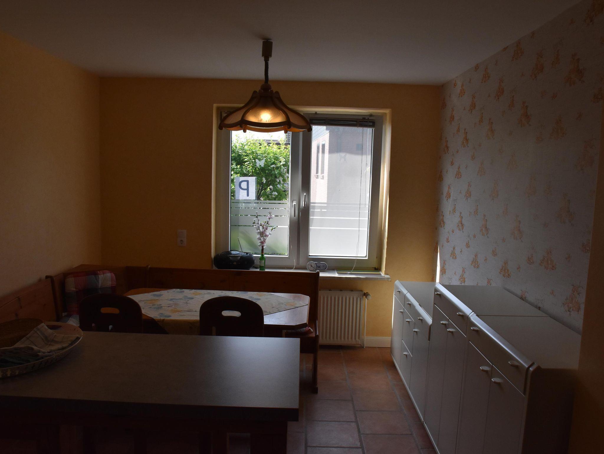 4* Ferienwohnung über zwei Etagen (EG, 1. OG), separater ebenerdiger Eingang in Mehrfamilienhaus. Überdachte Terrasse mit Tisch und Stühlen. Einbau-Küche mit Kühlschrank, Ceranfeld, Backofen, Geschirrspüler, Mikrowelle. Essbereich in der Küche mit Esstisch. Zwei Kinderbetten und zwei Zustellbetten vorhanden. Wohnzimmer, WC/Dusche im unteren Bereich. Alkoven als Leseecke, Doppelzimmer mit TV und Einzelzimmer mit TV und WC/Badewanne im oberen Bereich. Waschmaschine.