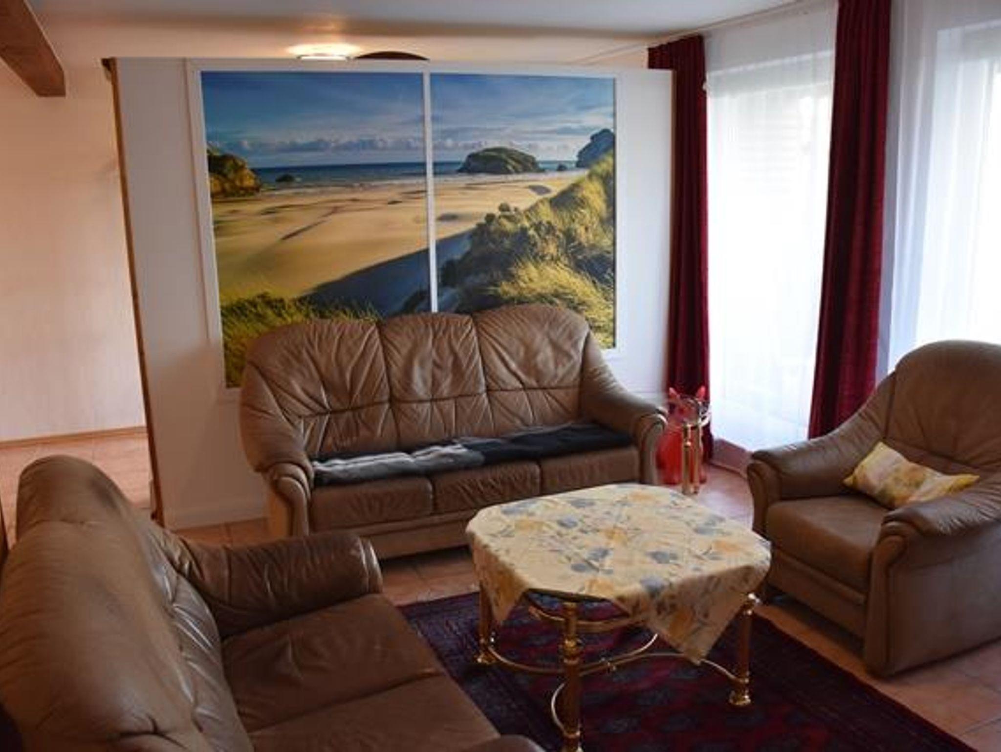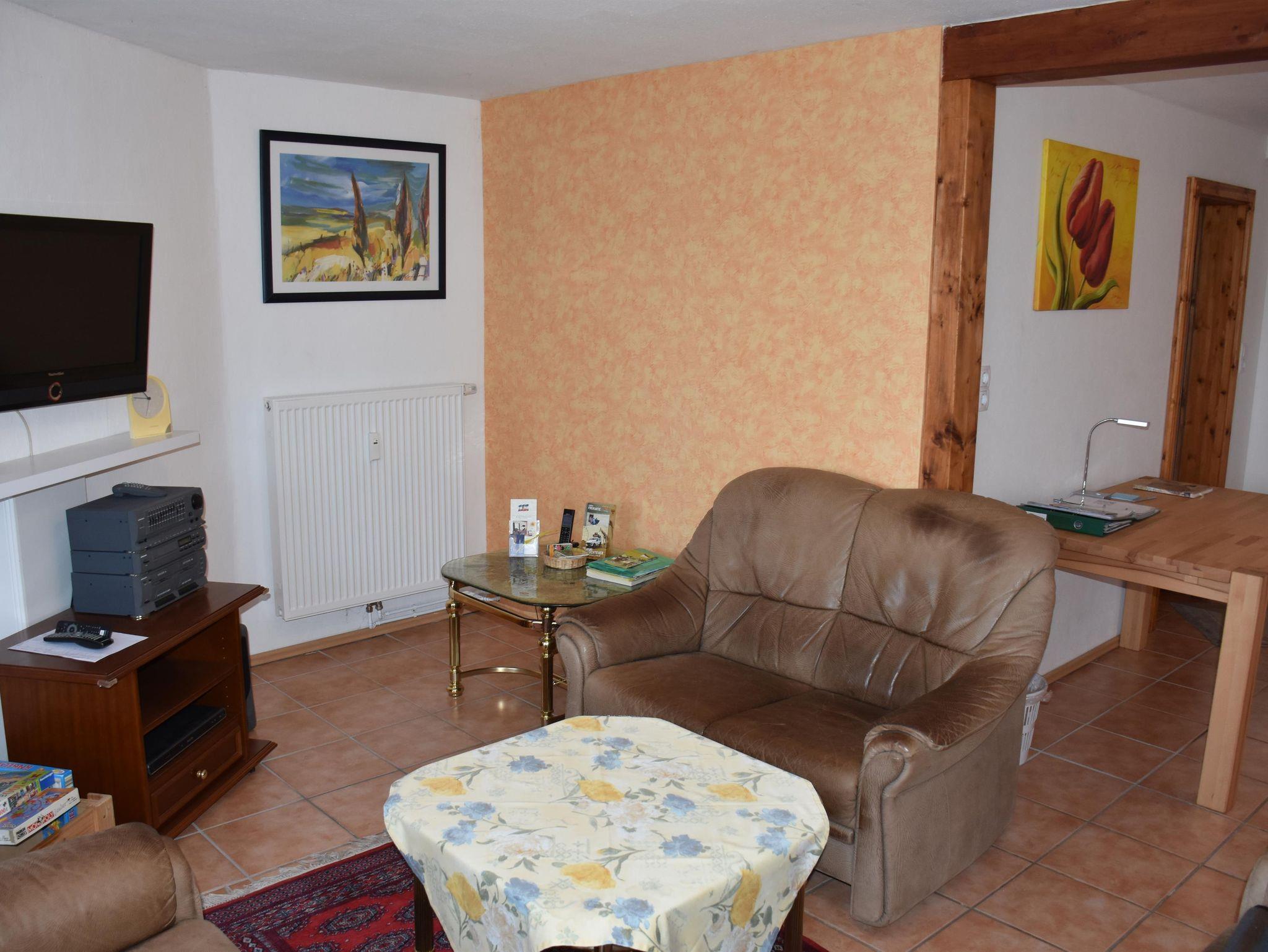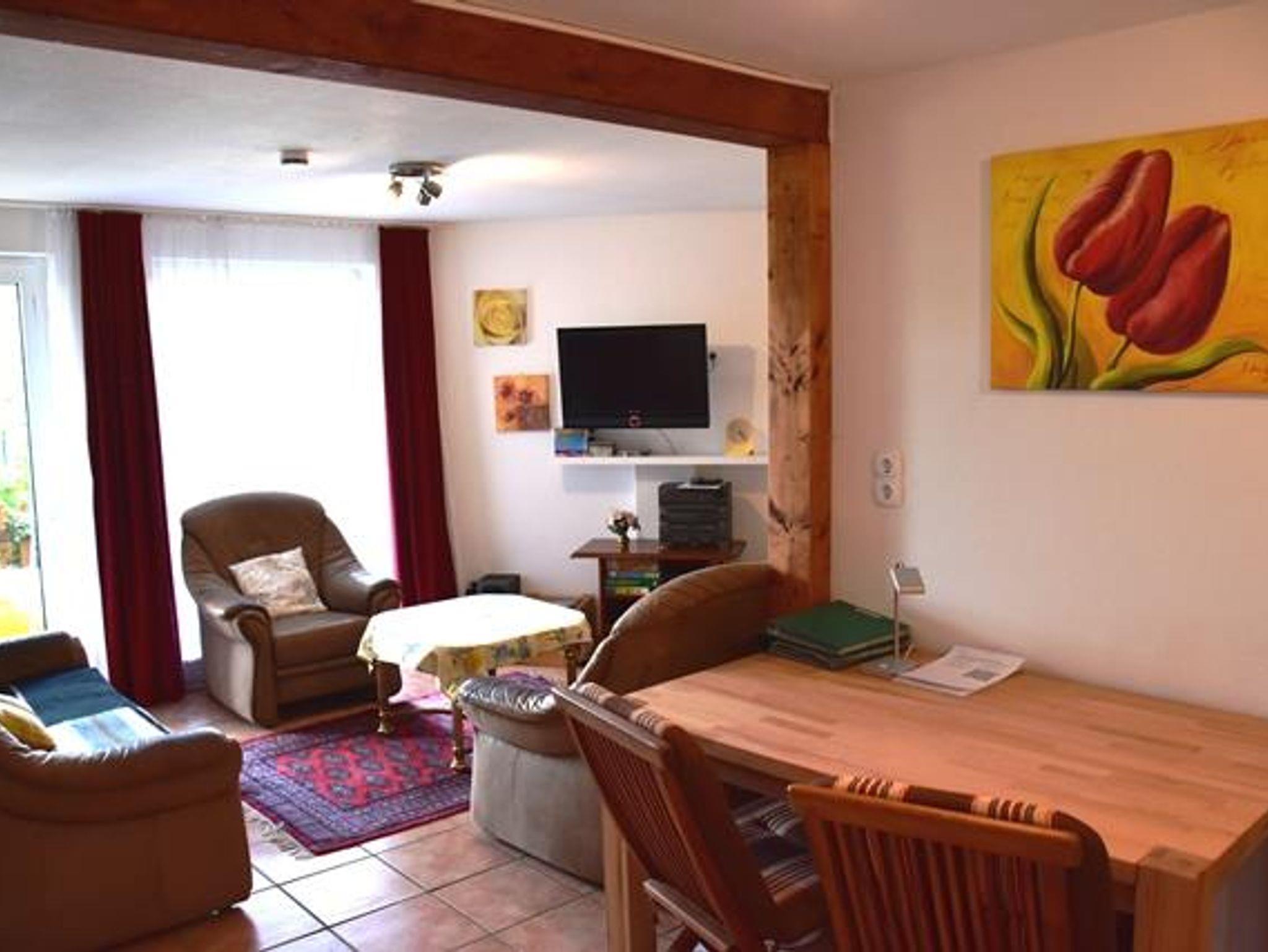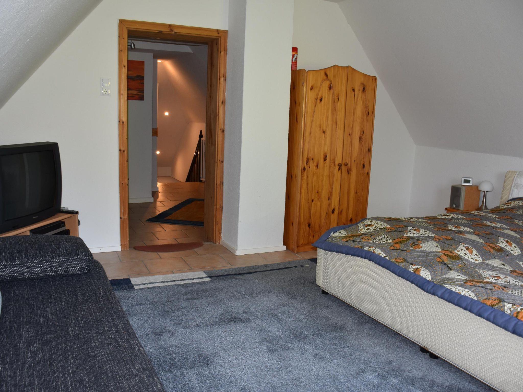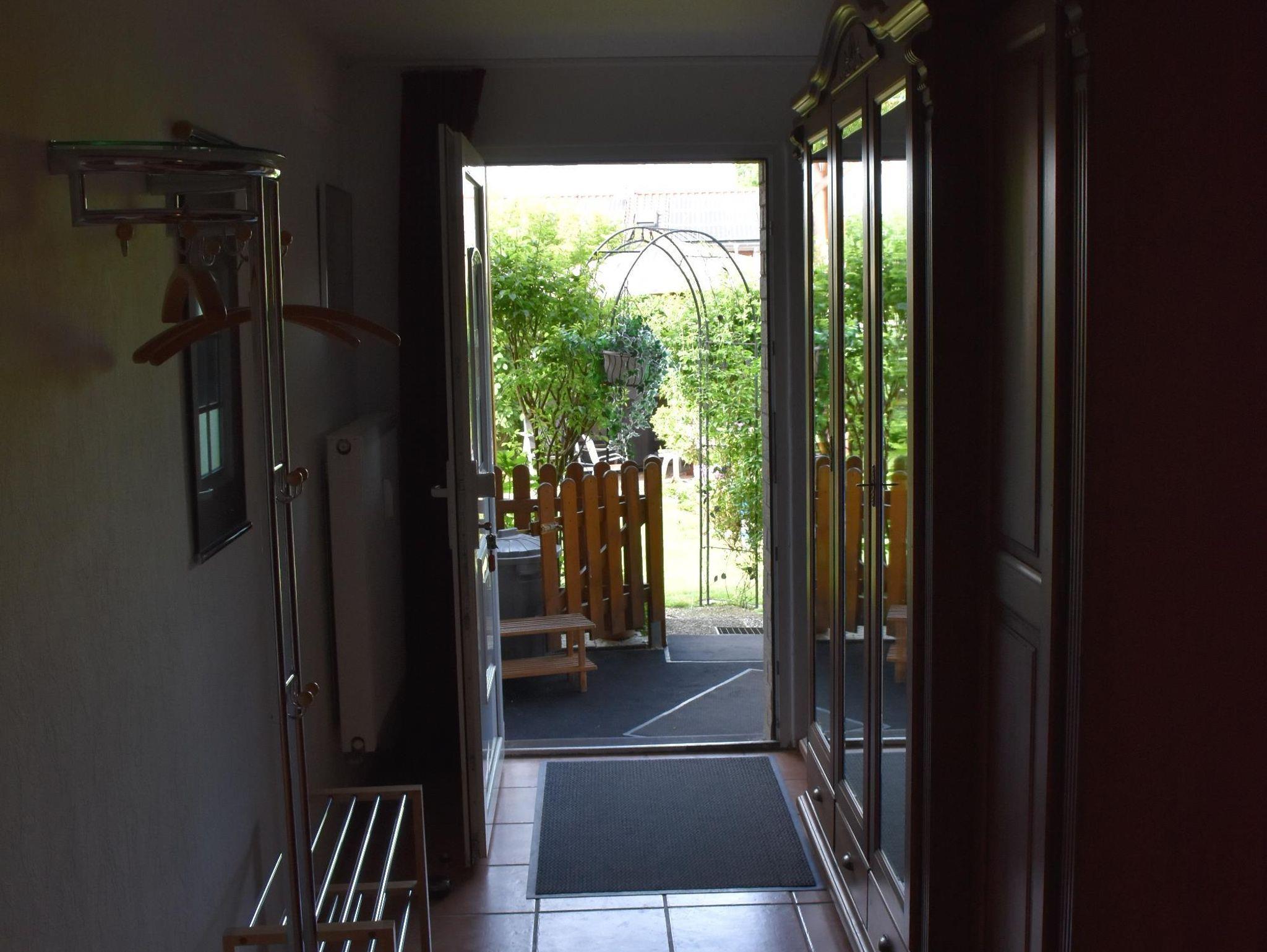 4* Ferienwohnung über zwei Etagen (EG, 1. OG), separater ebenerdiger Eingang in Mehrfamilienhaus. Überdachte Terrasse mit Tisch und Stühlen. Einbau-Küche mit Kühlschrank, Ceranfeld, Backofen, Geschirrspüler, Mikrowelle. Essbereich in der Küche mit Esstisch. Zwei Kinderbetten und zwei Zustellbetten vorhanden. Wohnzimmer, WC/Dusche im unteren Bereich. Alkoven als Leseecke, Doppelzimmer mit TV und Einzelzimmer mit TV und WC/Badewanne im oberen Bereich. Waschmaschine.