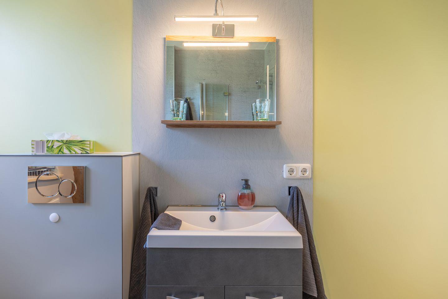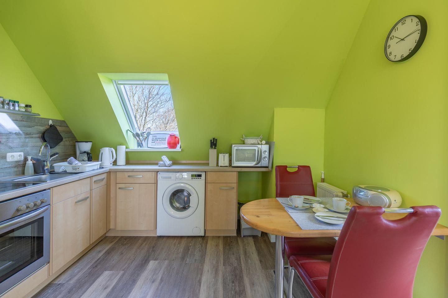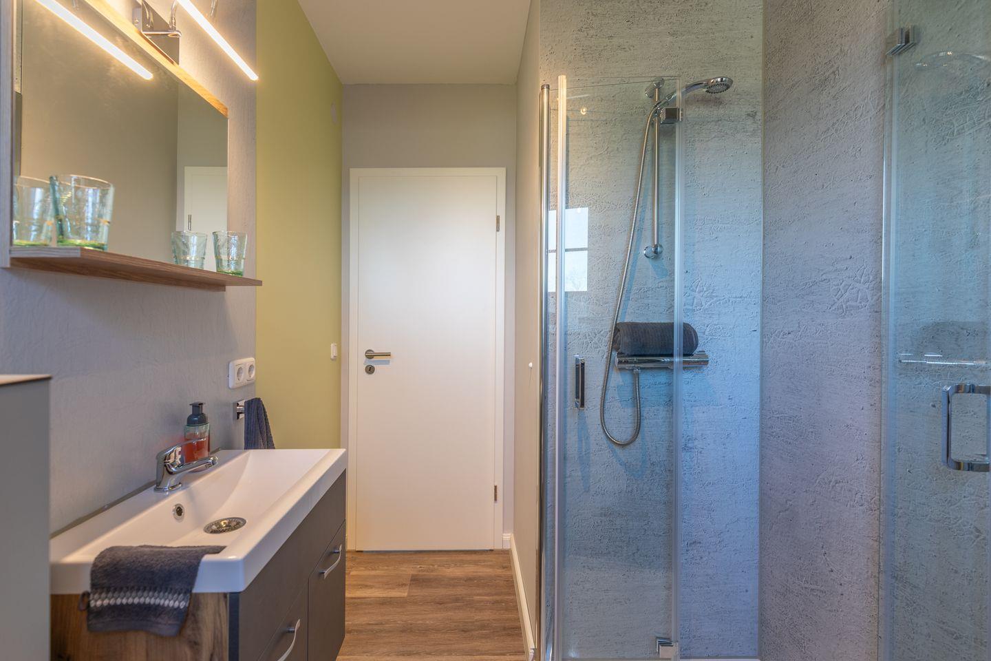 Das Badezimmer ist mit einer bodengleichen Dusche, einem Waschbecken und einer Toilette ausgestattet. Zudem findet man Annehmlichkeiten wie einen Haartrockner und großzügige Stauraumoptionen. Für die praktische Nutzung während Ihres Aufenthalts steht eine Waschmaschine in der Küche zur Verfügung.