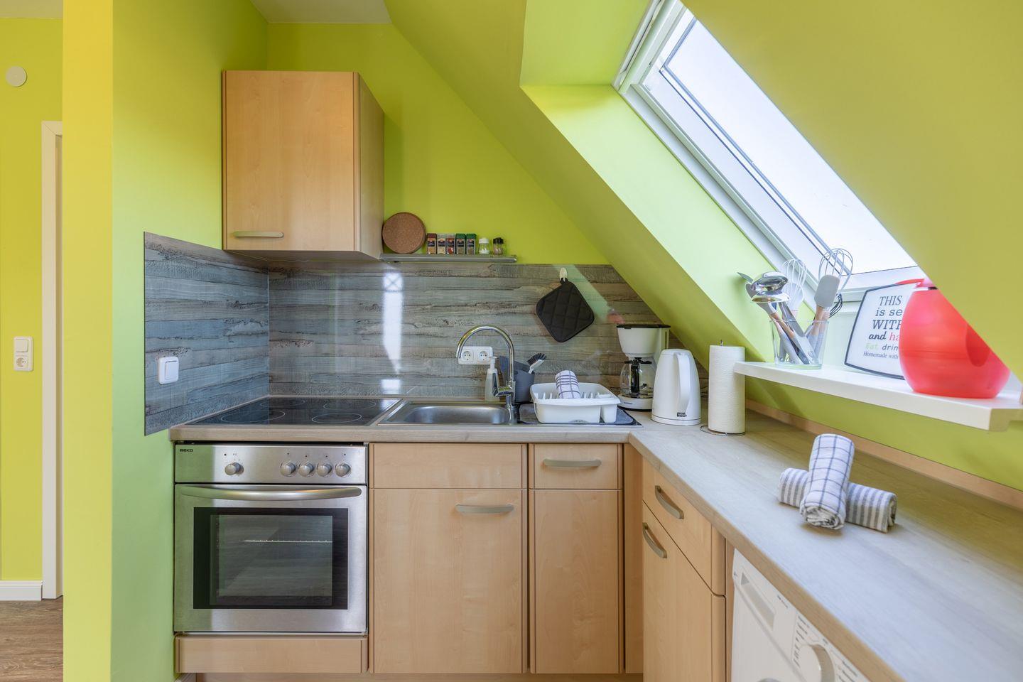 Eine voll ausgestattete Küche lässt kaum Wünsche offen: hier finden Sie einen Ceranherd, einen Backofen, eine Mikrowelle sowie einen Kühlschrank mit Gefrierfach. Darüber hinaus sind alle nützliche Küchenutensilien vorhanden, darunter Geschirr, Besteck und auch Gewürze. Ein Wasserkocher, eine Kaffeemaschine, ein Toaster und sogar ein Mixer sind ebenfalls Bestandteil der Einrichtung, sodass Sie sich während Ihres Aufenthalts selbst verpflegen können. Zu den Wohlfühl-Angeboten der Ferienwohnung Fria zählen auch WLAN mit einer Geschwindigkeit von ab 50 Mbit/s, ein Fernseher mit Satellitenanschluss, ein CD-Spieler sowie ein Radio für Ihre Unterhaltung.