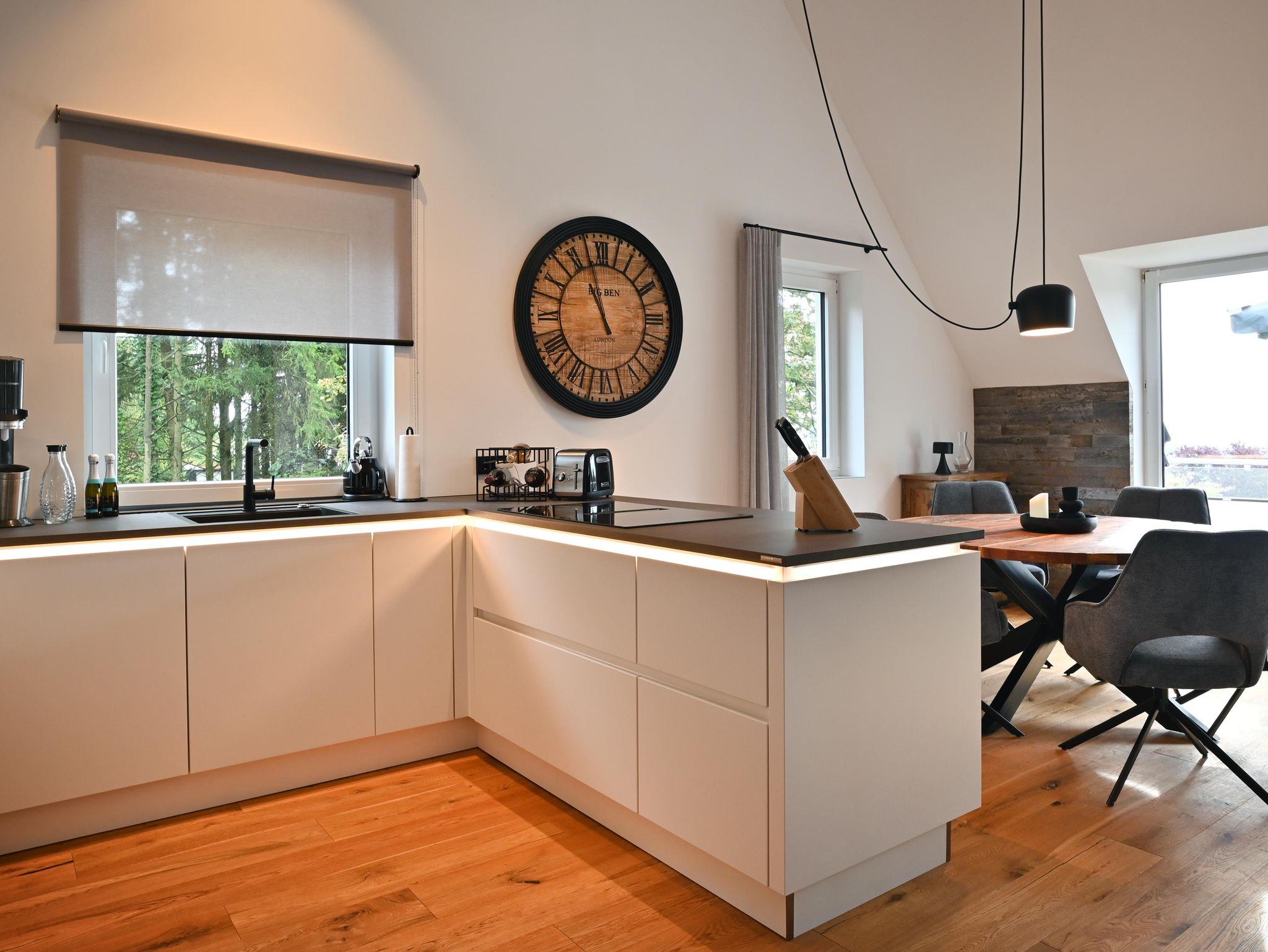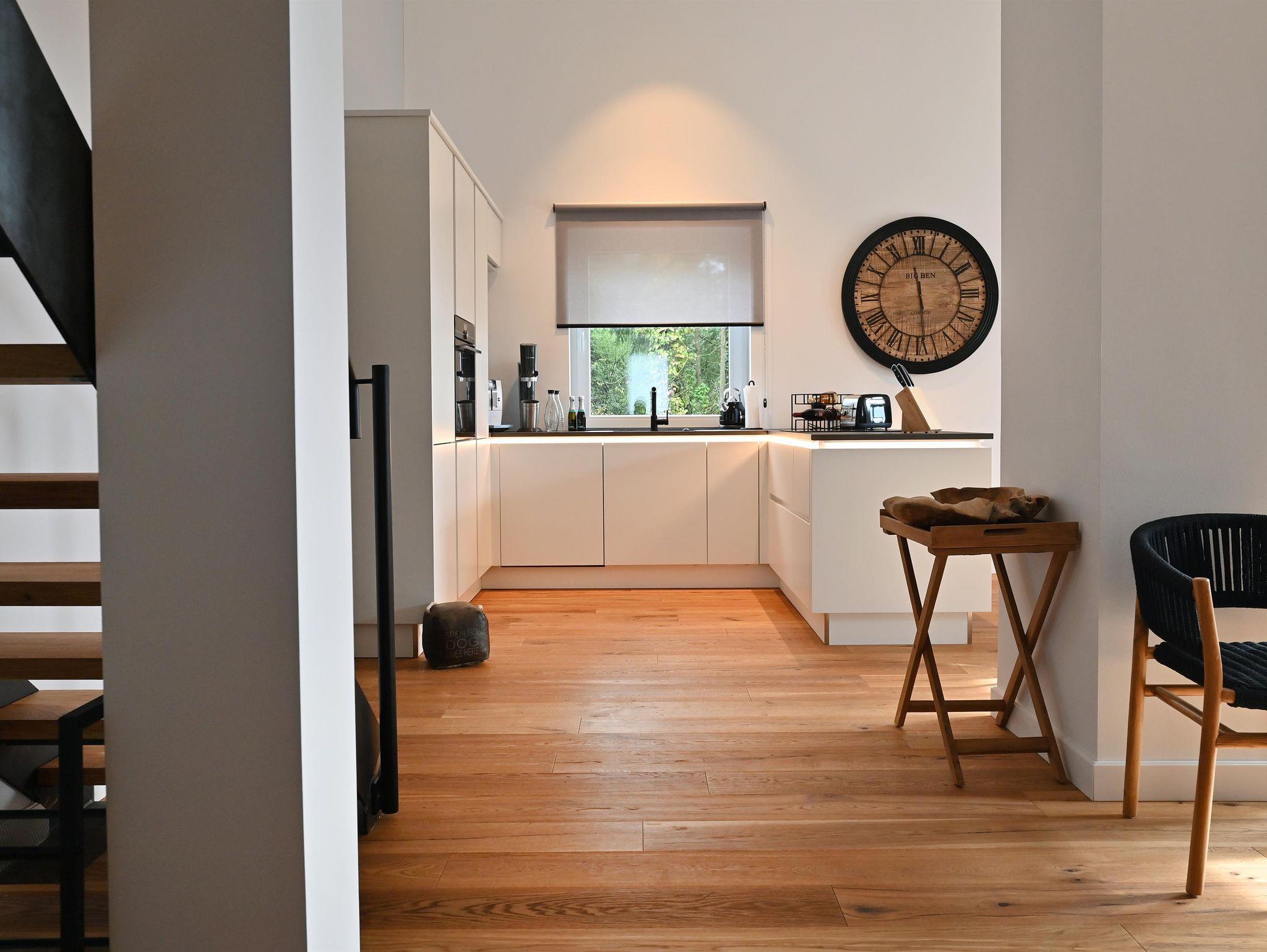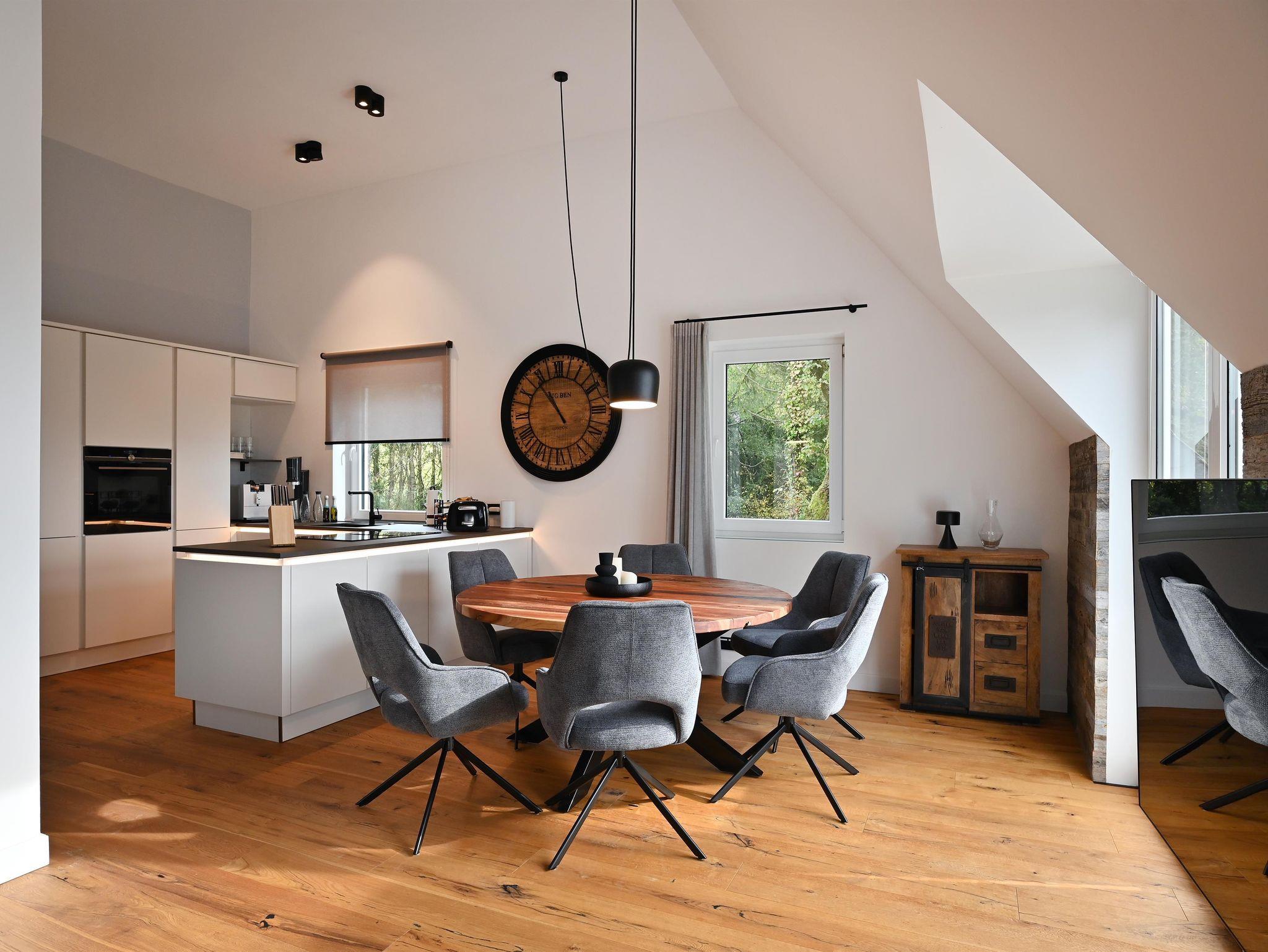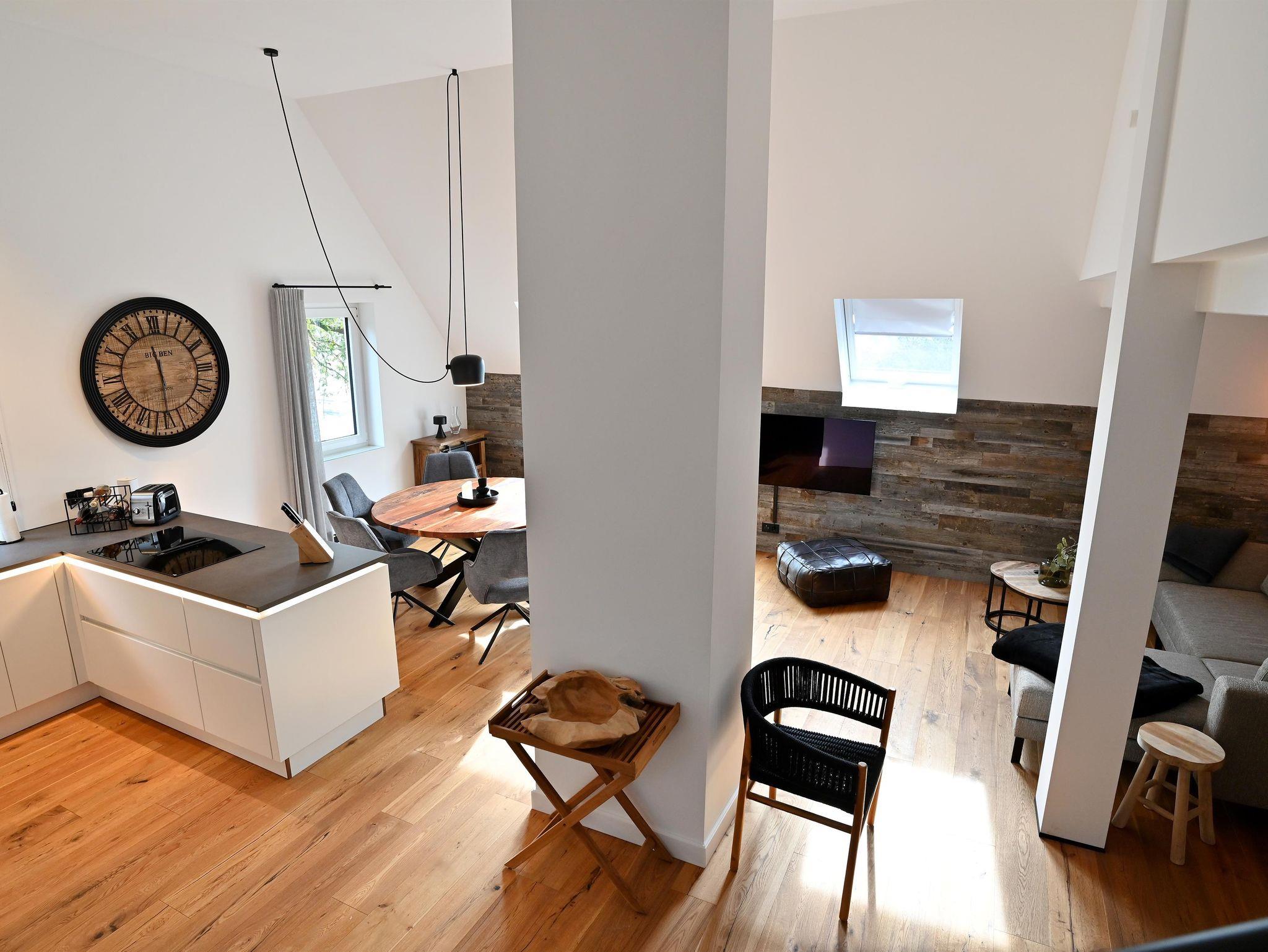 Die moderne Küche lädt zum ausgiebigen Kochen ein, der runde Esstisch bietet Platz für sechs Personen und ist ideal für gemeinsame Mahlzeiten. Echtholzböden und -türen verleihen der Wohnung eine warme Atmosphäre. Praktische Annehmlichkeiten wie Waschmaschine und Trockner sind ebenfalls vorhanden.