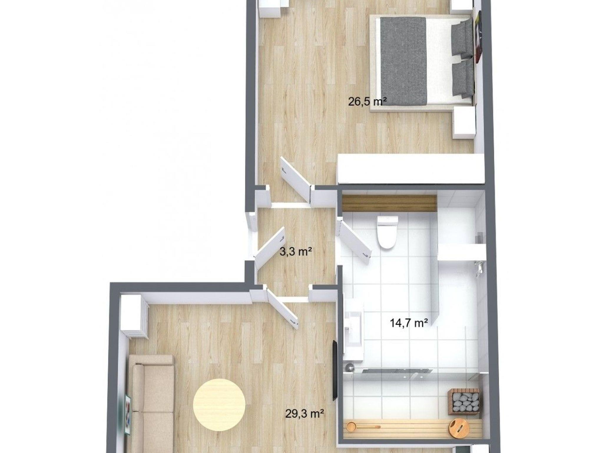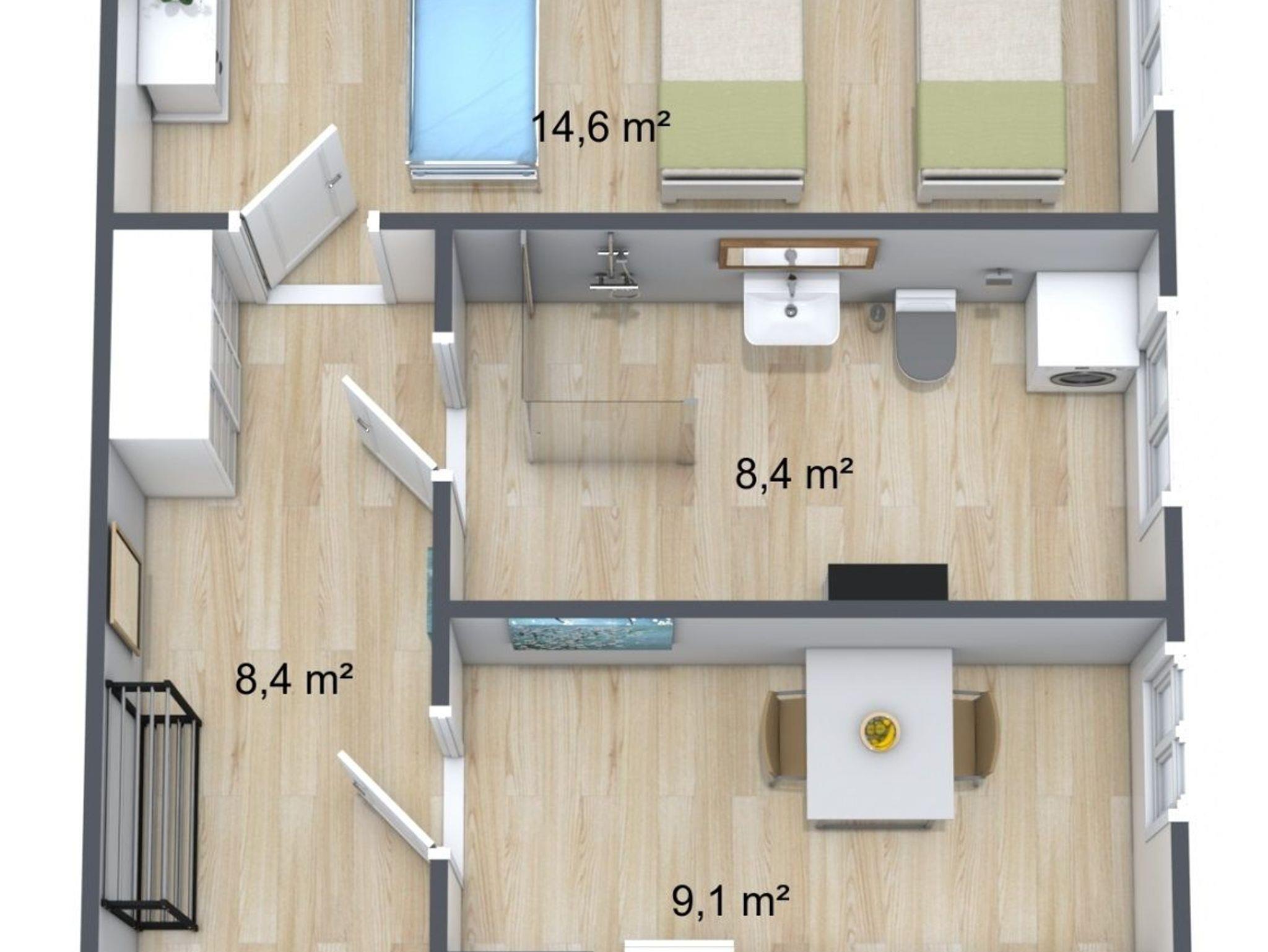 Mit einer Größe von 42m² bietet sie ausreichend Platz für Ihren entspannten Aufenthalt. Das Schlafzimmer verfügt über zwei gemütliche Einzelbetten und ein zusätzliches Gästebett, sodass bis zu 3 Personen bequem übernachten können.