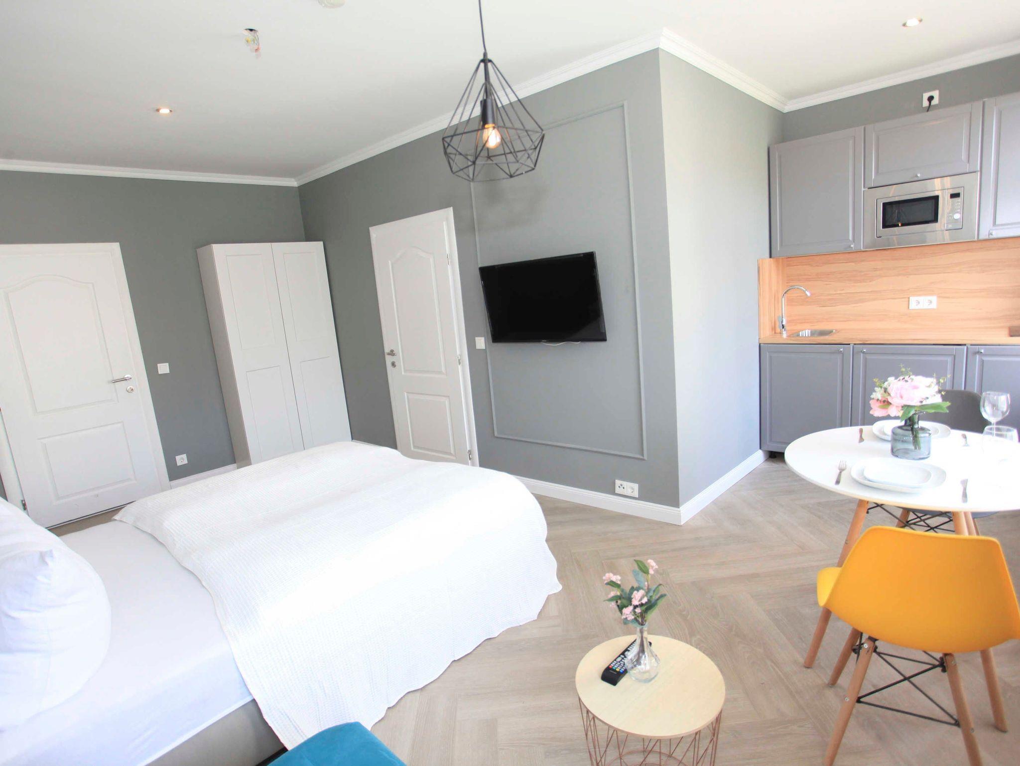 Das moderne Badezimmer ist mit einer erfrischenden Dusche ausgestattet, während die vollausgestattete Küche alles bietet, was Sie für die Zubereitung köstlicher Mahlzeiten benötigen. Ein Herd, eine Mikrowelle, ein Kühlschrank mit Tiefkühlfunktion, ein Wasserkocher und eine Kaffeemaschine stehen Ihnen zur Verfügung.
