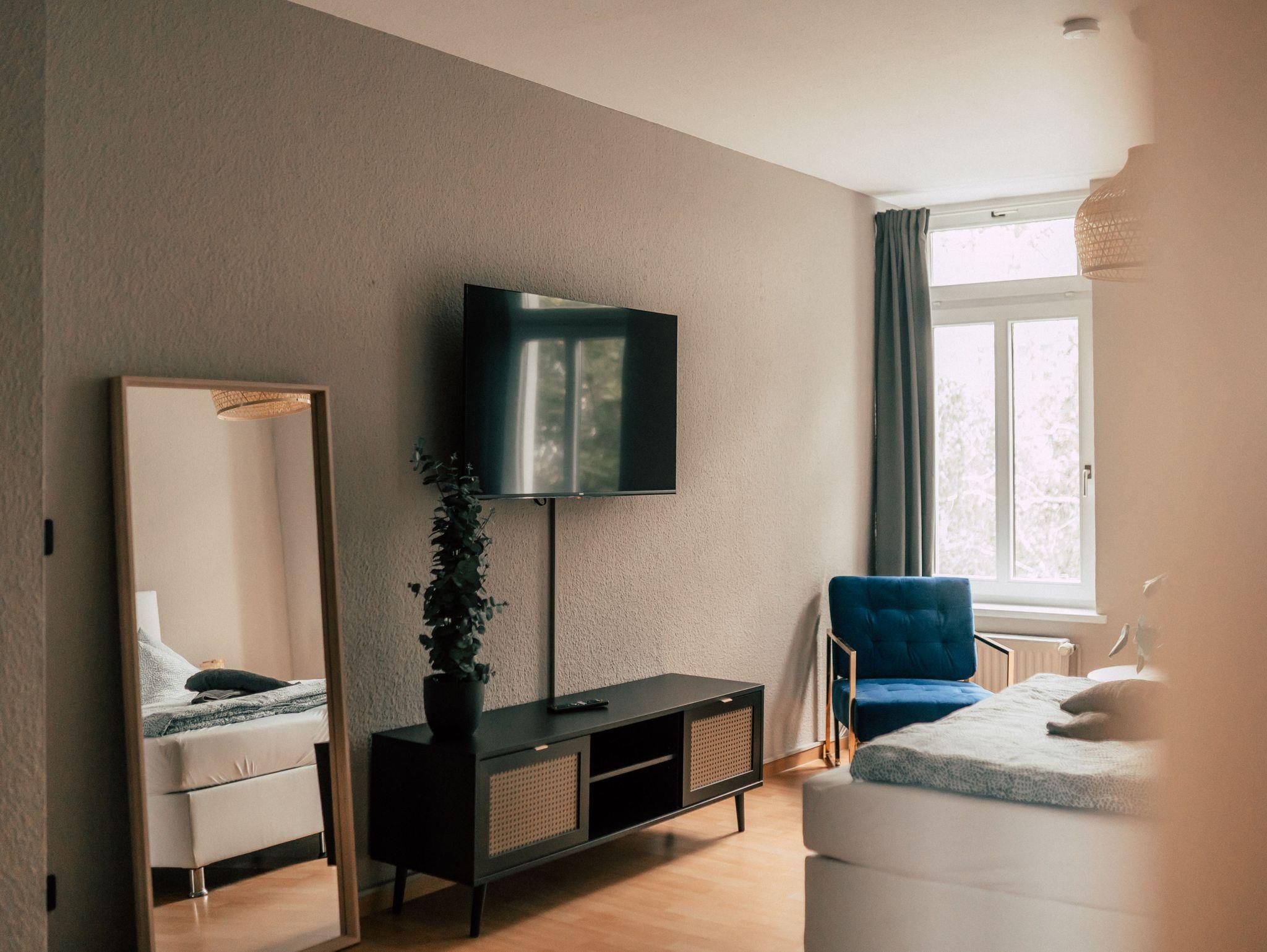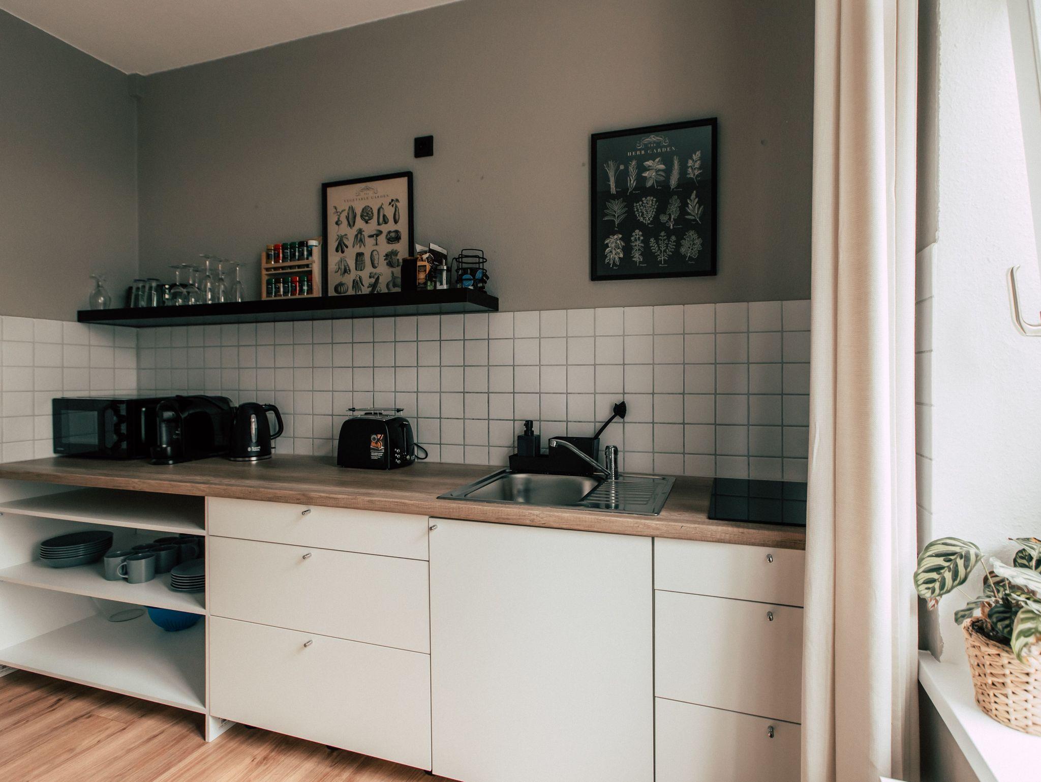 Die charmante und großzügige Altbauwohnung erstrahlt, frisch renoviert, in neuem, leicht vergoldeten, Glanz! Der offene Eingangsbereich führt Dich gleich an einen gemütlichen Esstisch, der zum Verweilen, Schlemmen oder zum lockeren Spieleabend einlädt. Der Wohnbereich ist stilvoll eingerichtet und verfügt neben einem Sofa auch über ein bequemes Doppelbett und eine Sitzecke. Gekonnt vermischen sich hier dezente, natürliche Materialien wie Holz oder Bast mit einem Hauch Luxus von samtigen Stoffen, Marmor und Gold. Das Schlafzimmer verfügt über ein weiteres Doppelbett, sowie über einen Schreibtisch und einen geräumigen Kleiderschrank. Die Küche ist gut ausgestattet und liebevoll dekoriert. Vom Herd über das gut bestückte Gewürzregal bis hin zur Kapselkaffeemaschine findest Du alles, was Du brauchen könntest. Für eine Portion Wellness sorgt das helle Badezimmer mit Duschwanne.