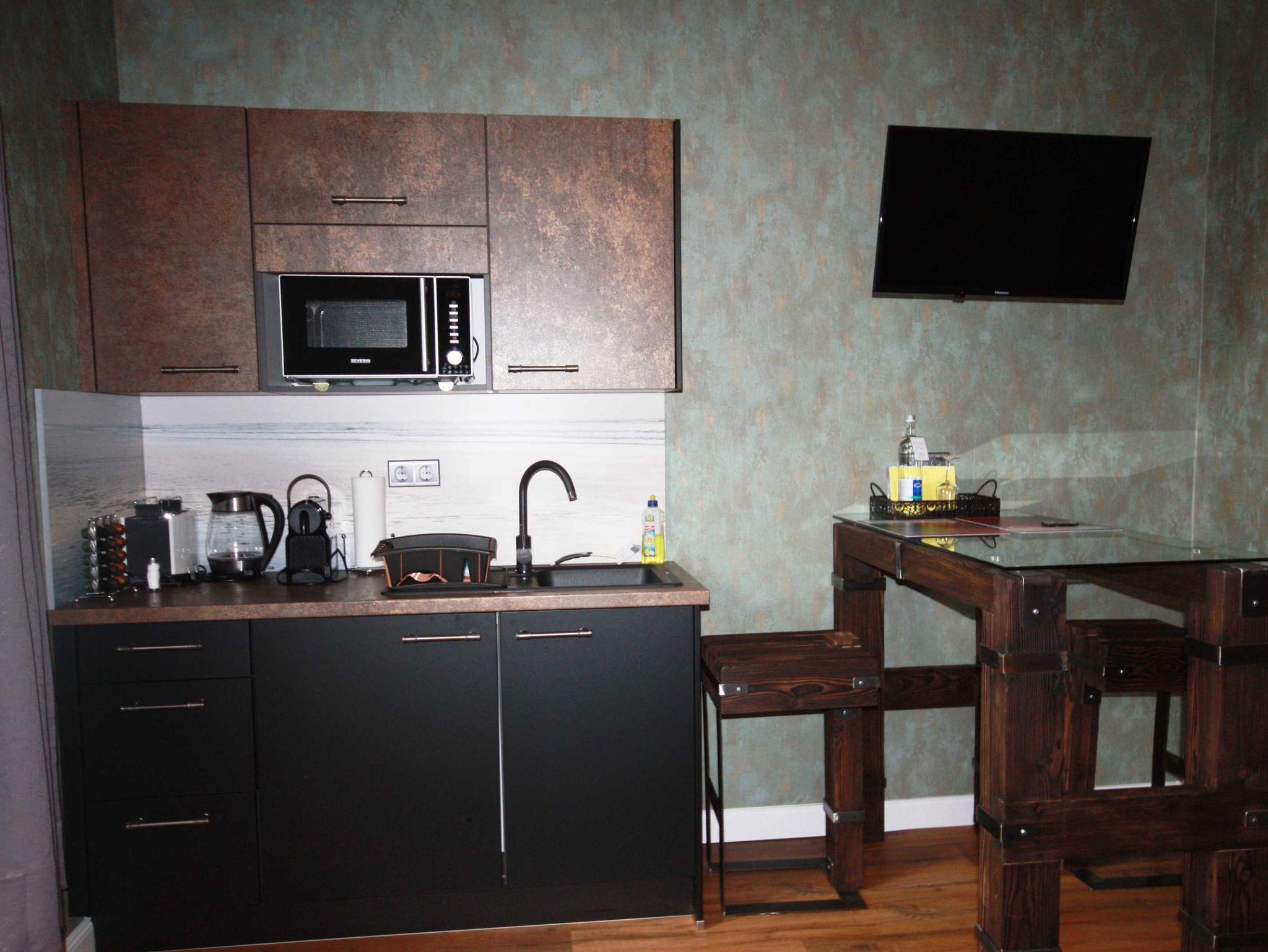 • Küchenzeile mit Kühlschrank mit Gefrierfach, Mikrowelle mit Grill- und Heißluftfunktion, Kaffeemaschine, Toaster, etc.