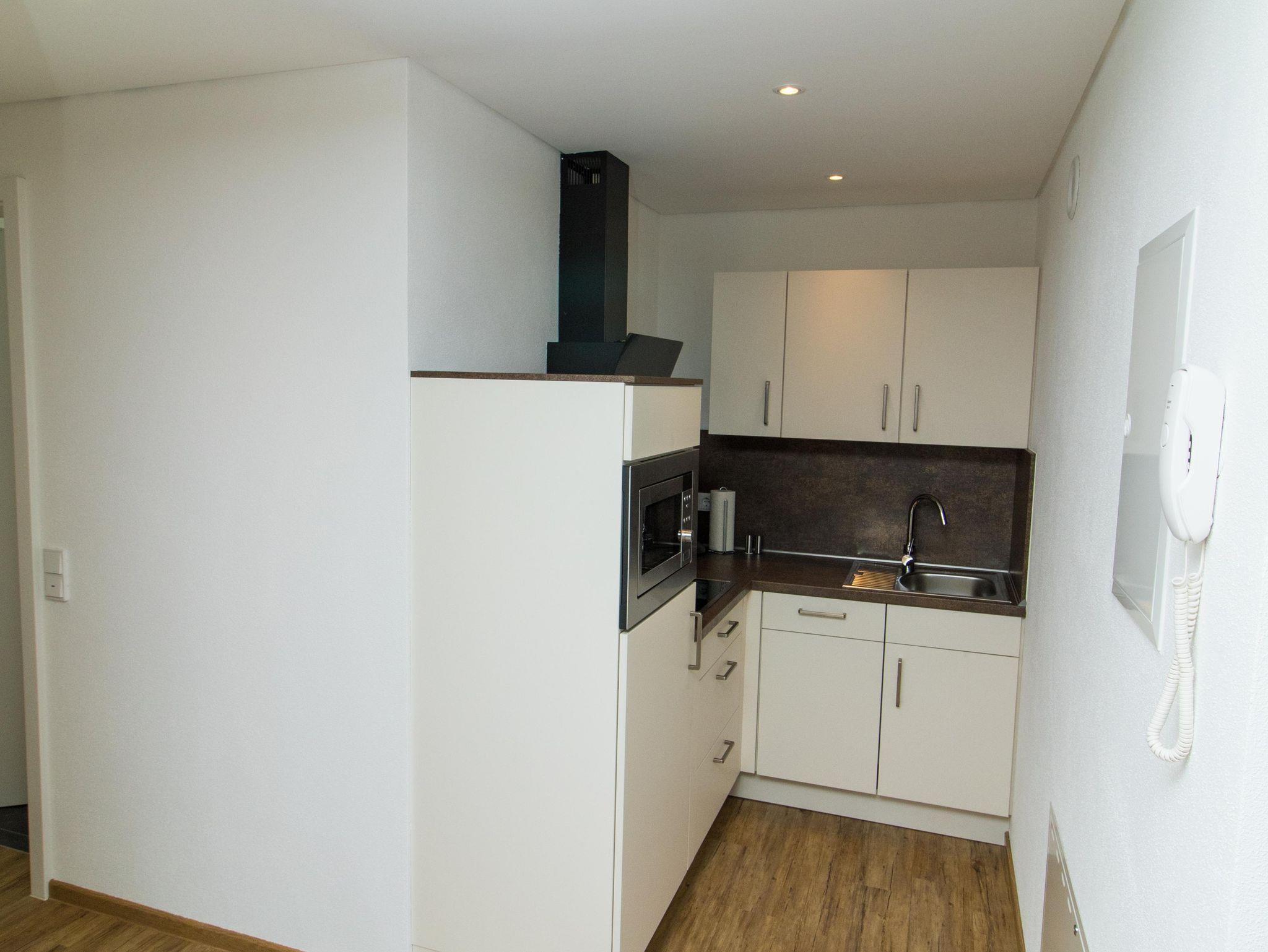 Einbauküche mit Spülmaschine, Kühlschrank mit Tiefkühlfach, 4-Platten Ceran-Kochfeld, Mikrowellen-Backofen, Kaffeepadmaschine, Wasserkocher