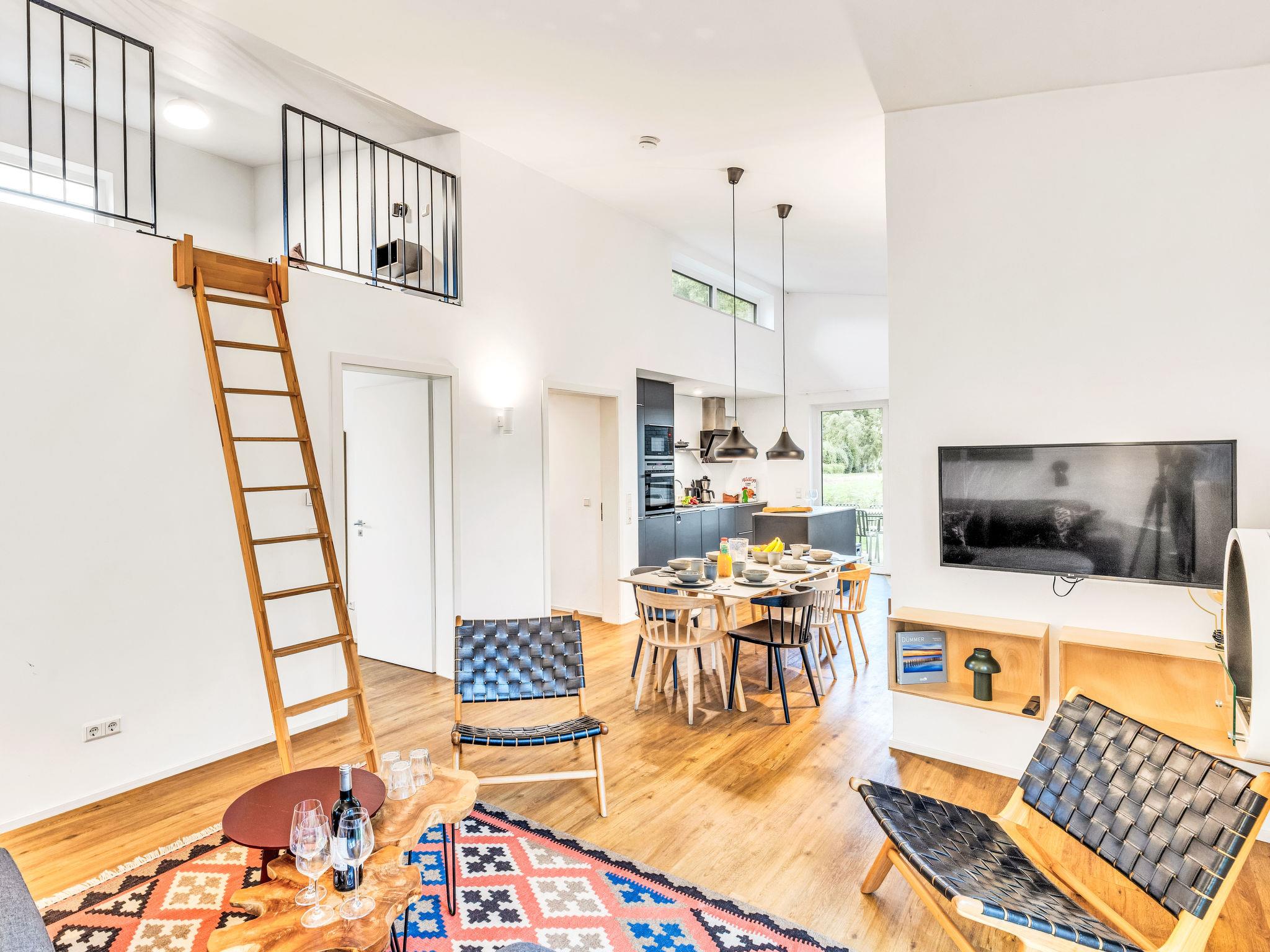 "Abendrot", 4-room house 98 m2 on 2 levels. Tasteful and cosy furnishings: living/dining room with satellite TV (flat screen). Exit to the terrace. 3 rooms, each room with 1 double bed (2 x 90 cm, length 200 cm). Kitchen-/living room (oven, dishwasher, 4 ceramic glass hob hotplates, toaster, kettle, microwave, electric coffee machine). Bath/WC, shower/WC. Upper floor: (ladder) open gallery with sloping ceilings with 2 sleeping facilities. Terrace. Terrace furniture, electric barbecue. Facilities: washing machine, dryer, sauna, children's high chair (extra), hair dryer. Internet (WiFi, free). Please note: non-smoking house. Smoke alarm.