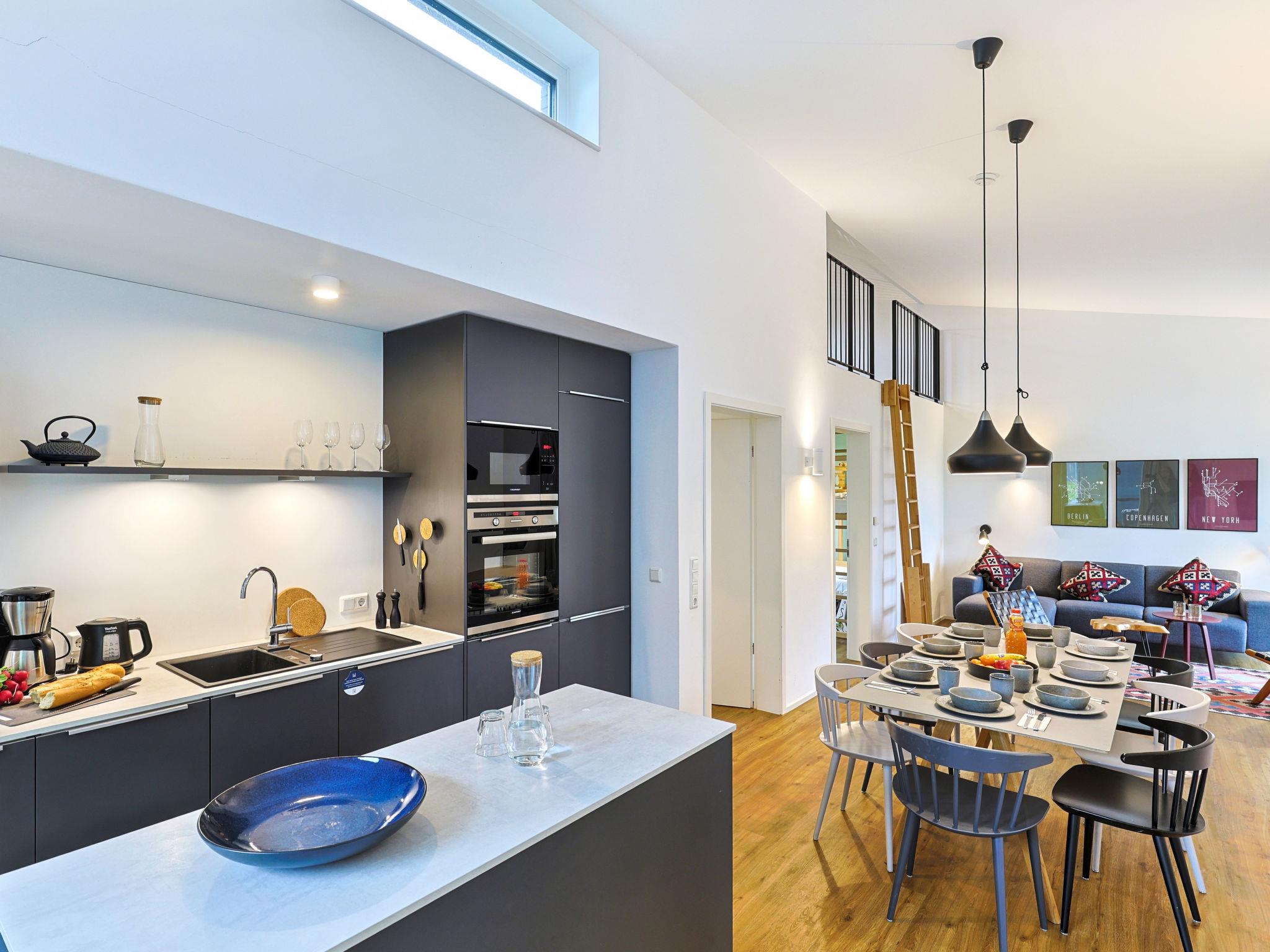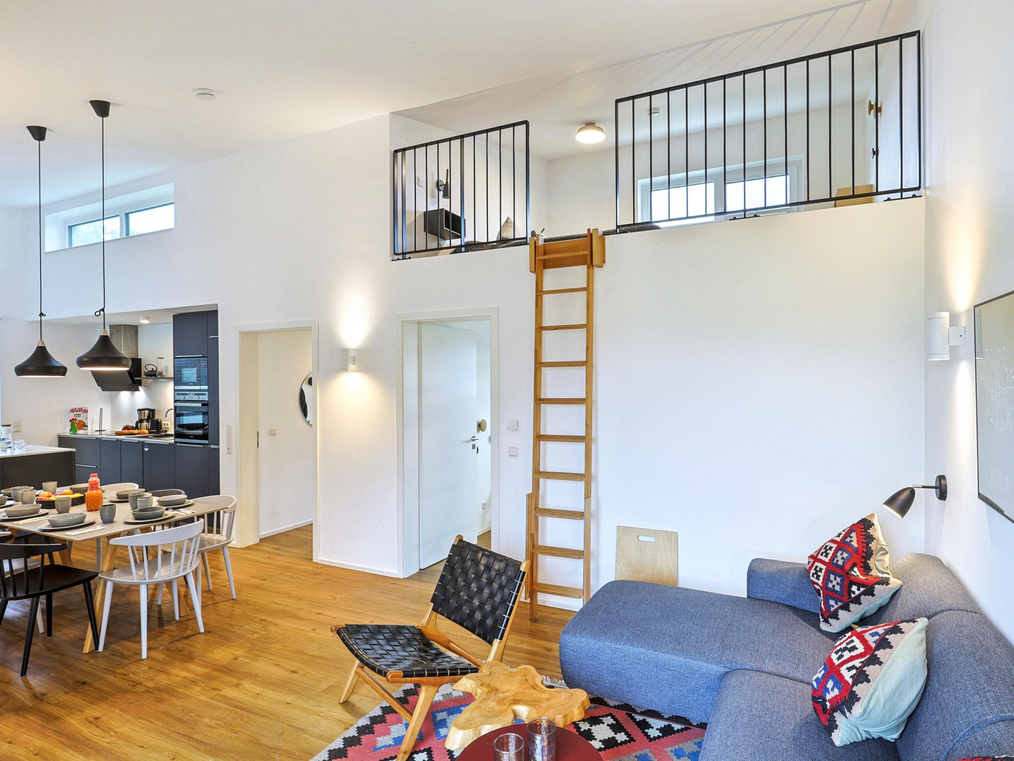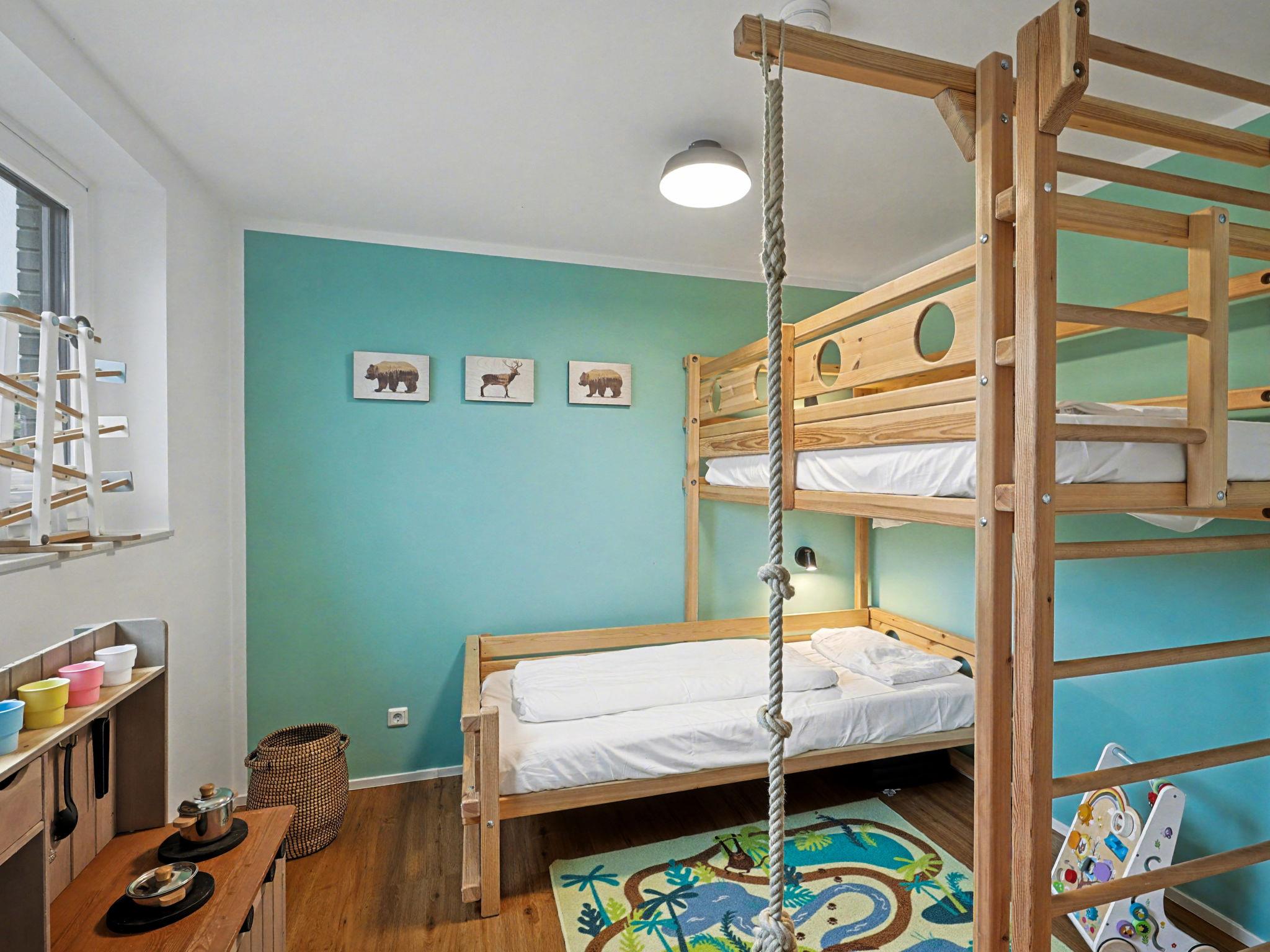 "Familiennest", 4-room house 98 m2 on 2 levels. Tasteful and cosy furnishings: living/dining room with satellite TV (flat screen). Exit to the terrace. 2 rooms, each room with 1 double bed (2 x 90 cm, length 200 cm). 1 room with 1 x 2 bunk beds (90 cm, length 200 cm). Kitchen-/living room (oven, dishwasher, 4 ceramic glass hob hotplates, toaster, kettle, microwave, electric coffee machine). Bath/WC, shower/WC. Upper floor: (ladder) open gallery with sloping ceilings with 2 sleeping facilities. Terrace. Terrace furniture, electric barbecue. Facilities: washing machine, dryer, sauna, children's high chair (extra), hair dryer. Internet (WiFi, free). Please note: non-smoking house. Maximum 1 pet/ dog allowed. Smoke alarm, fire extinguisher. There is a hot tub on the terrace.