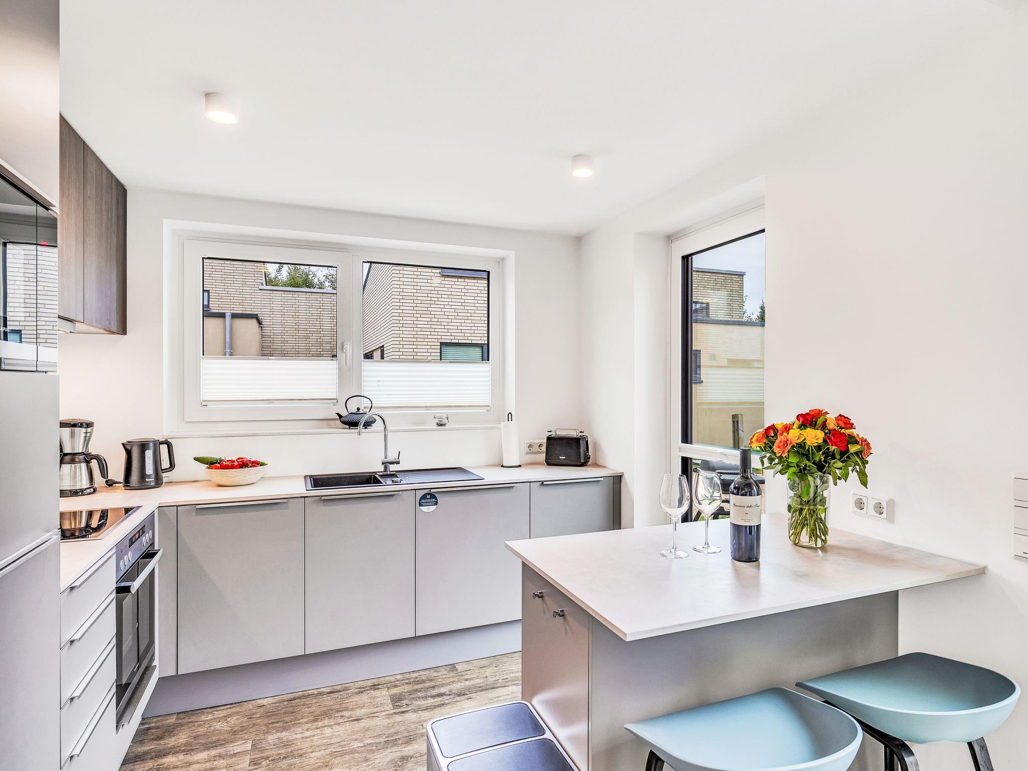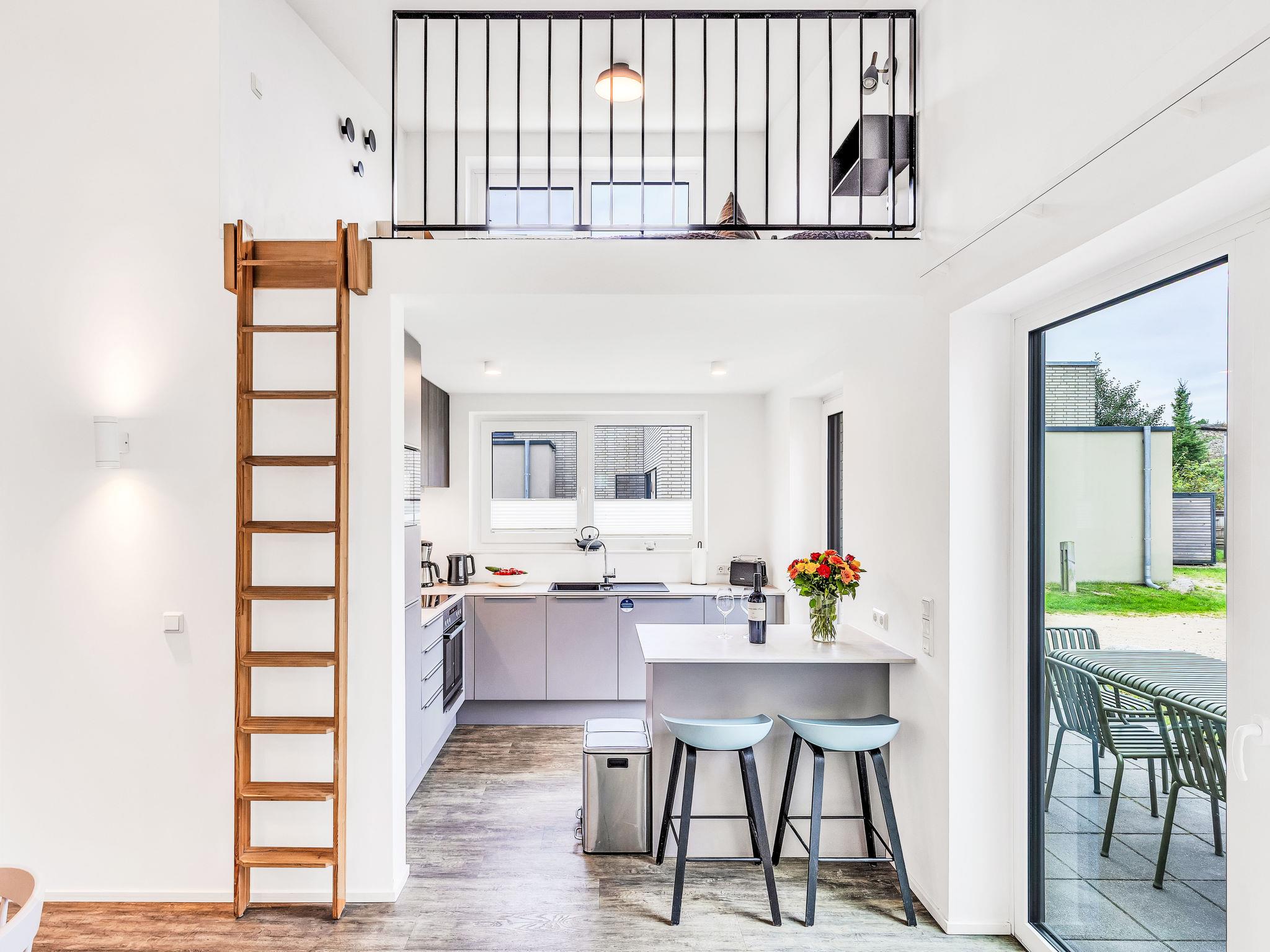 "Schmidt", 3-room house 85 m2 on 2 levels. Tasteful and cosy furnishings: living/dining room with satellite TV (flat screen). Exit to the terrace. 2 rooms, each room with 1 double bed (2 x 90 cm, length 200 cm). Open kitchen (oven, dishwasher, 4 ceramic glass hob hotplates, toaster, kettle, microwave, electric coffee machine). Bath/WC, shower/WC. Upper floor: (ladder) open gallery with sloping ceilings with 2 sleeping facilities. Terrace. Terrace furniture, electric barbecue. Facilities: washing machine, dryer, sauna, children's high chair (extra), hair dryer. Internet (WiFi, free). Please note: non-smoking house. Smoke alarm.