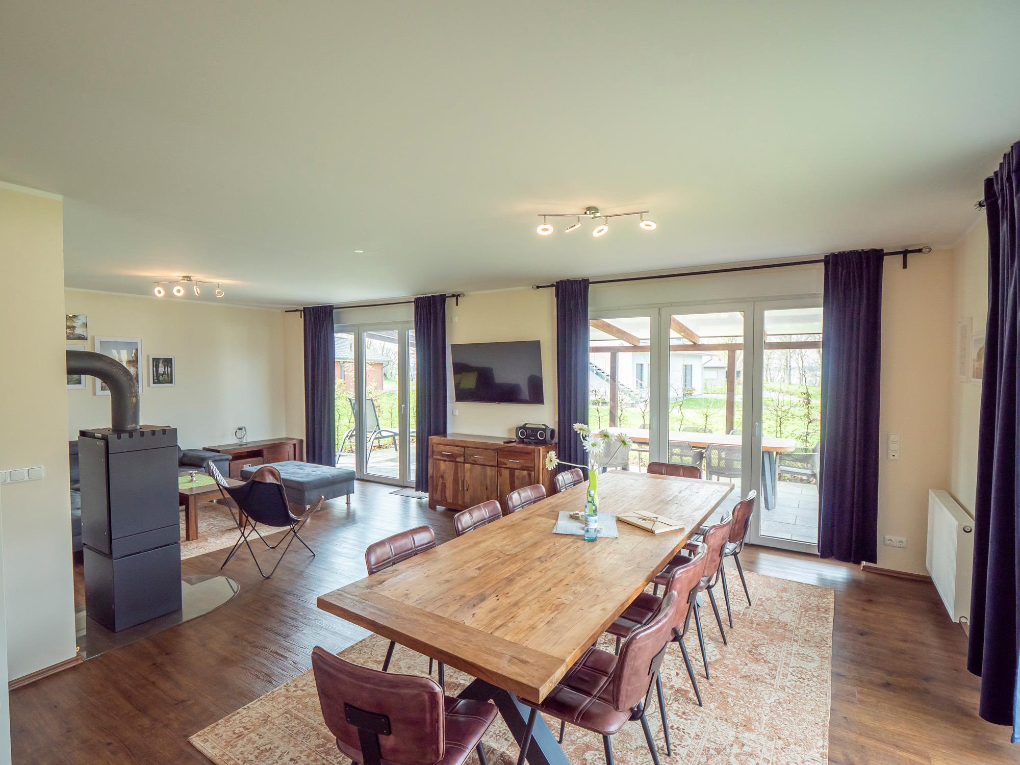 Die offene Küche ist vollständig ausgestattet und hat viel Platz für einen großen Esstisch, an dem bis zu zehn Personen Platz haben. Von dort aus ist es ein fließender Übergang zum Wohnzimmer mit der großen, gemütlichen Couch. An kühlen Abenden können Sie den Ofen im Wohnraum anzünden, der zusätzlich zur Zentralheizung für wohlige Wärme sorgt. Kaminholz stellen wir gegen Aufpreis zur Verfügung. Sie brauchen dies nicht mitzubringen.