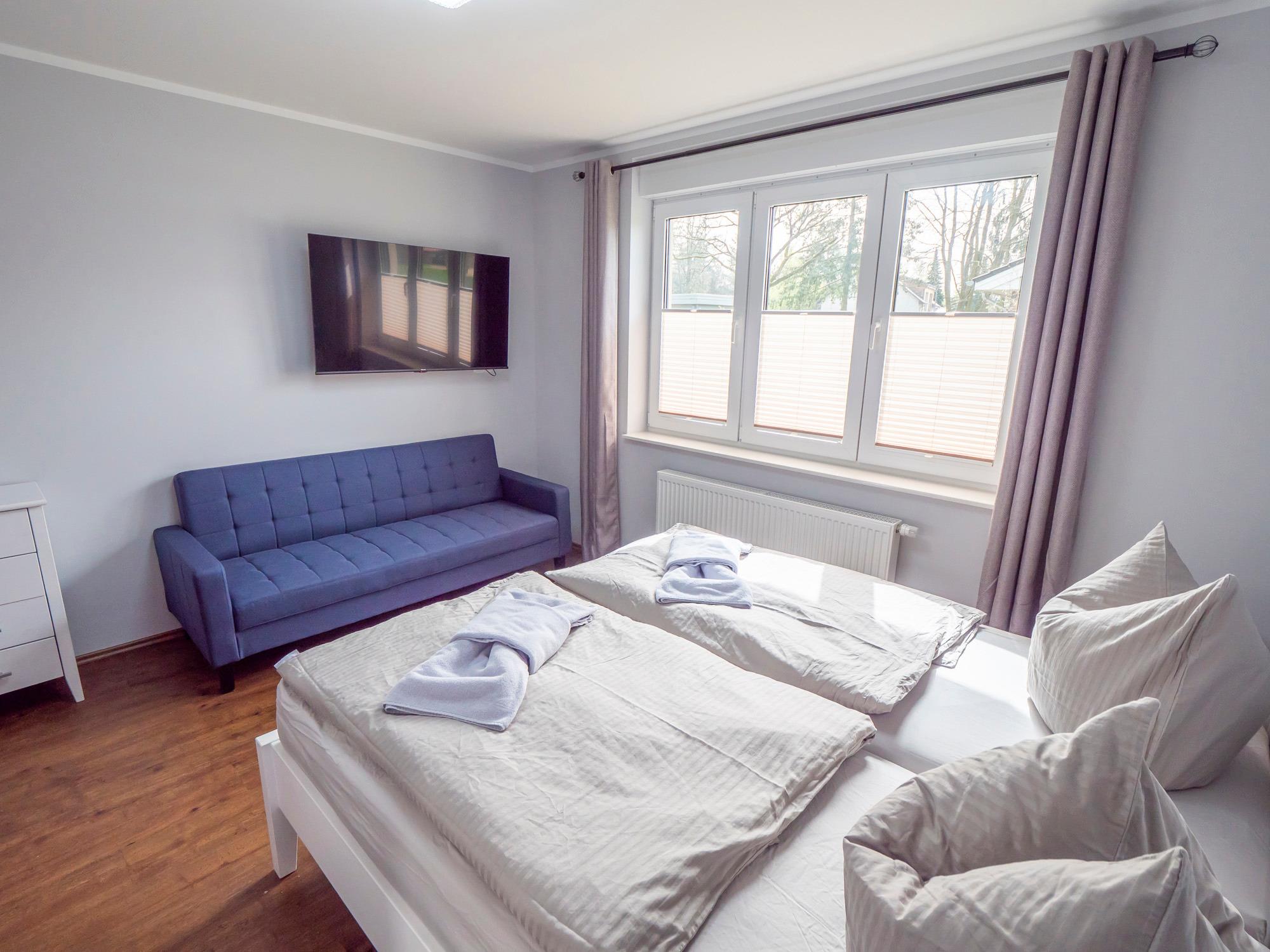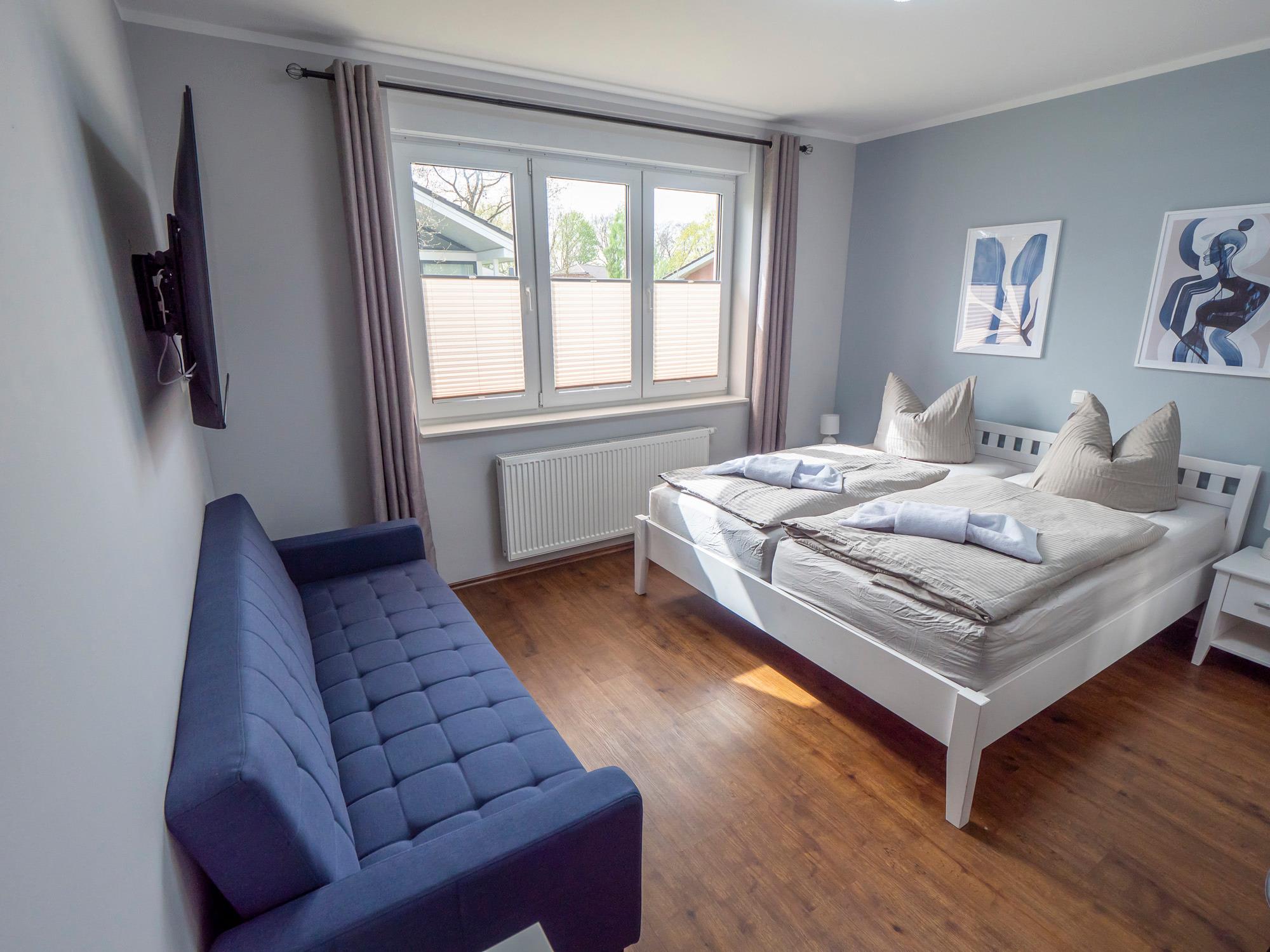 Das Schlafsofa oder aber 2 komfortable Schlafliegen können zusätzlich für eine Aufbettung genutzt werden.