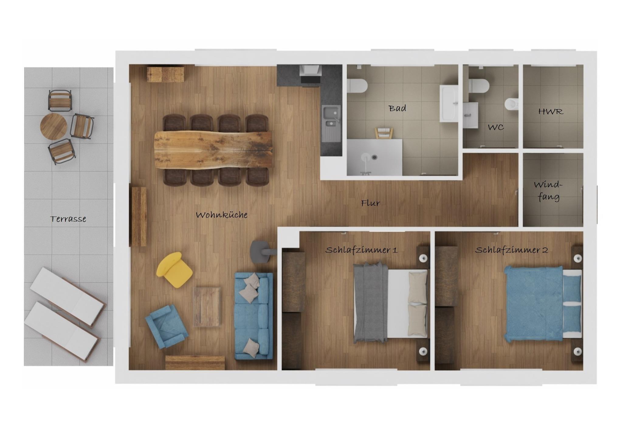Unsere Ferienwohnung "Terra" ist mit ihren zwei Doppelschlafzimmern ideal für Familien geeignet. Vom Wohnbereich aus haben Sie Zutritt zur möblierten Terrasse (mit Grill) und zum Grundstück.
