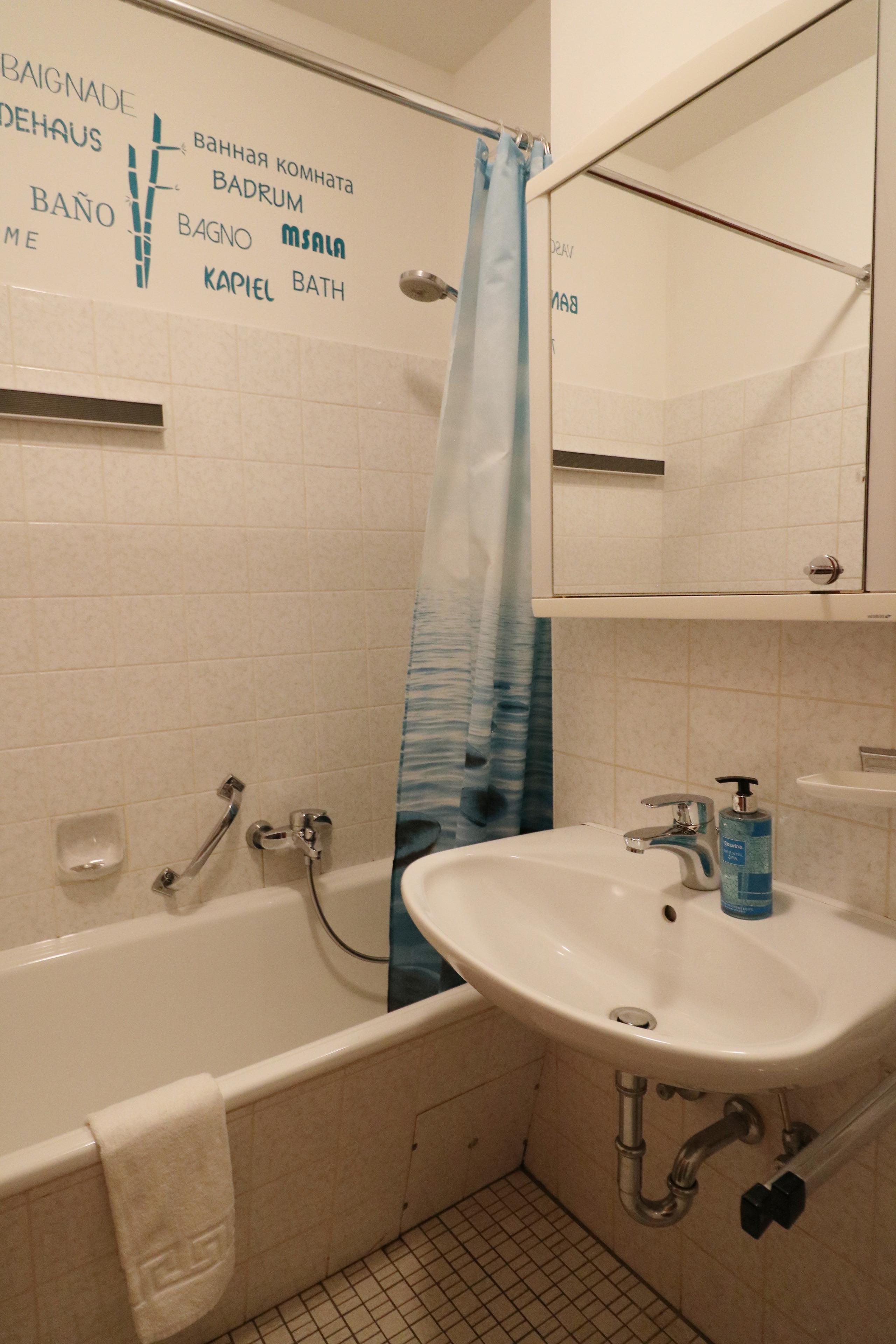 Im Bad befindet sich eine Badewanne mit Duschmöglichkeit.