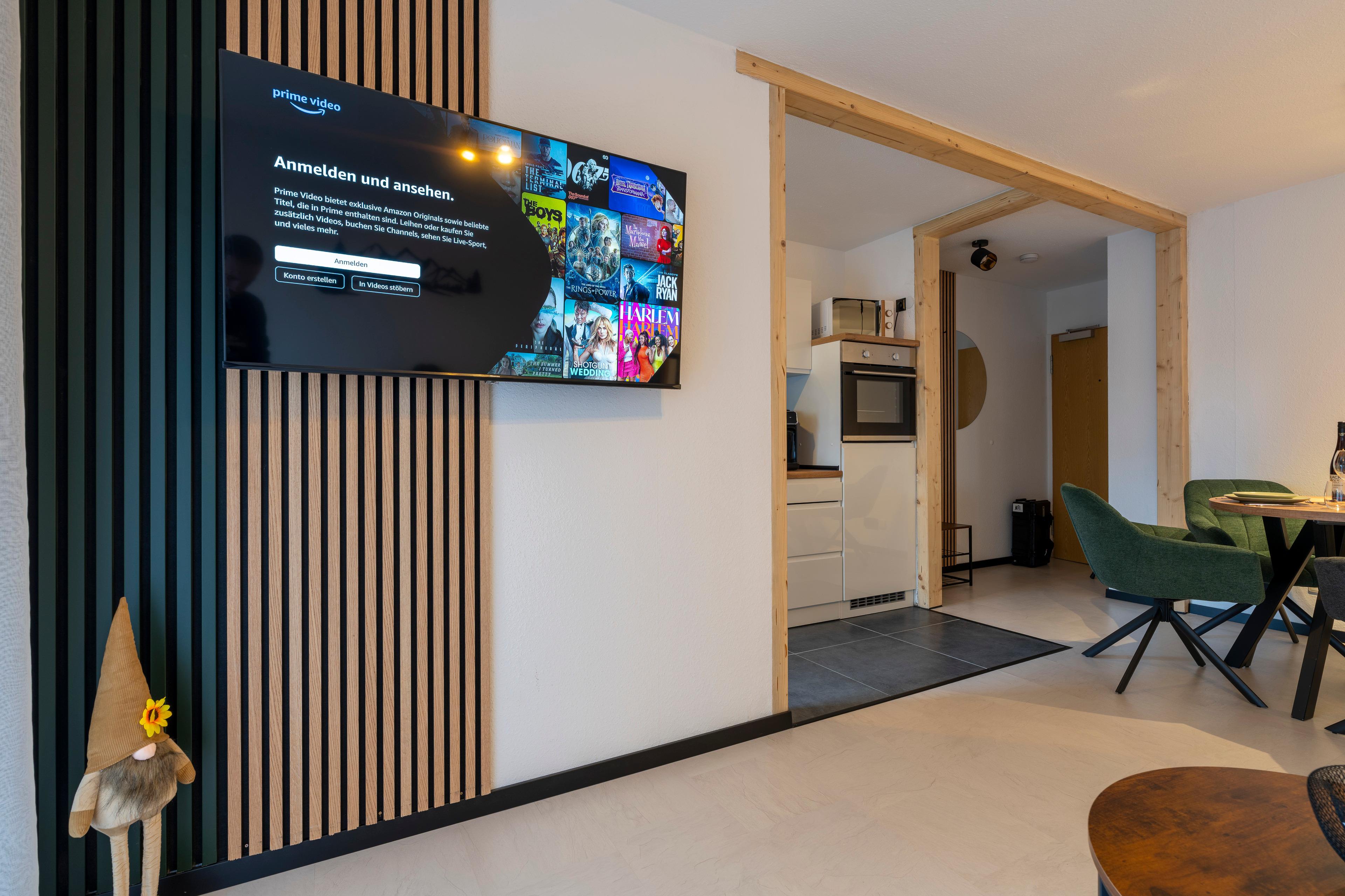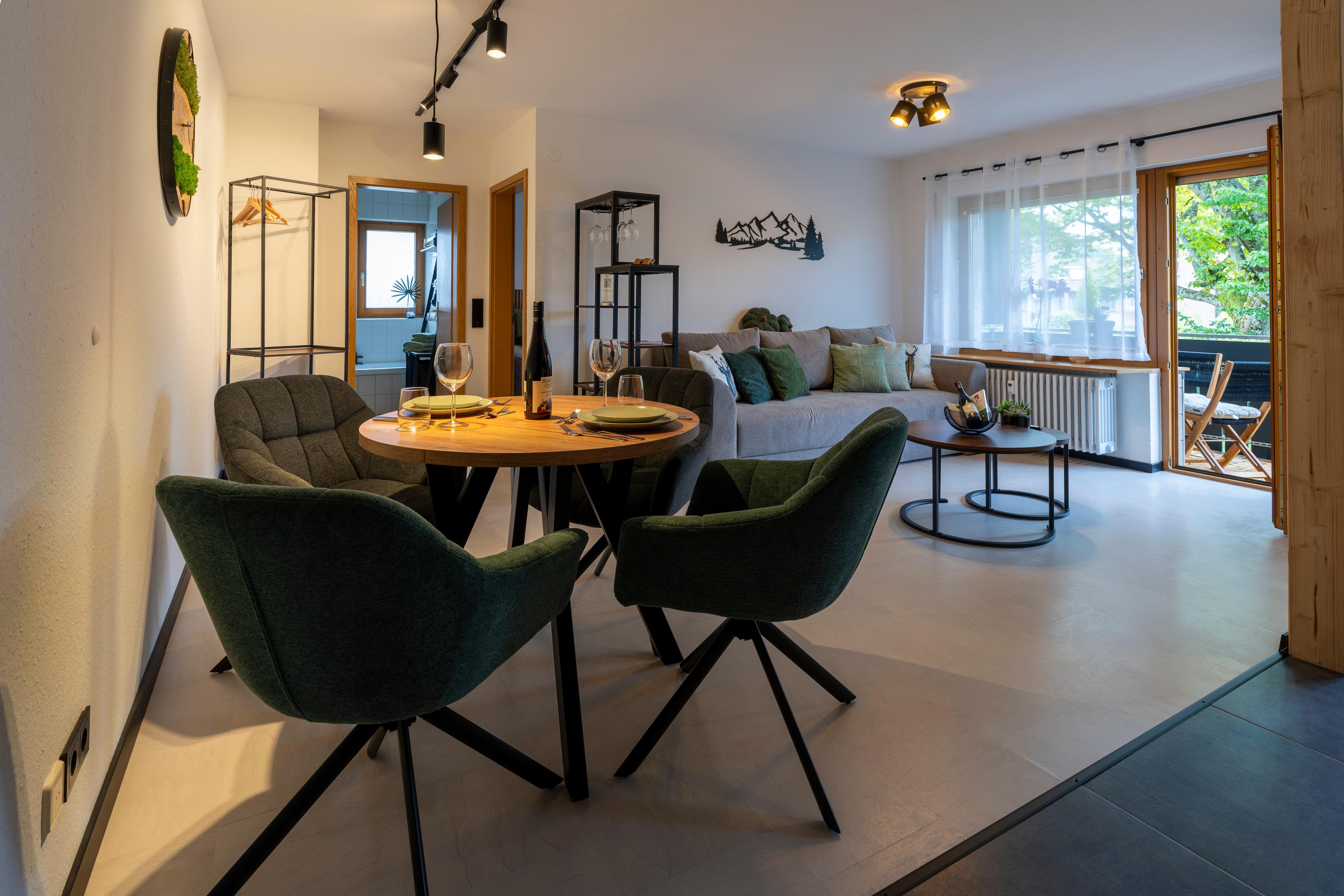 Die moderne Wohnung verwöhnt mit einer voll ausgestatteten Küche, einem Badezimmer mit einladender Badewanne und einem sonnigen Ost-Balkon, der mit Wiesenblick zum Frühstück in der Morgensonne einlädt. Im gemütlichen Wohnzimmer erwartet Sie eine stilvolle Schlafcouch, die sich in ein vollwertiges Boxspringbett verwandelt und Hotelkomfort verspricht. Der einladende Essbereich ist perfekt für gemeinsame Mahlzeiten. Im Schlafzimmer sorgt ein flexibles Boxspringbett für erholsamen Schlaf – wahlweise als Doppelbett oder zwei Einzelbetten. WLAN und zwei Fernseher runden das Wohlfühlpaket ab.