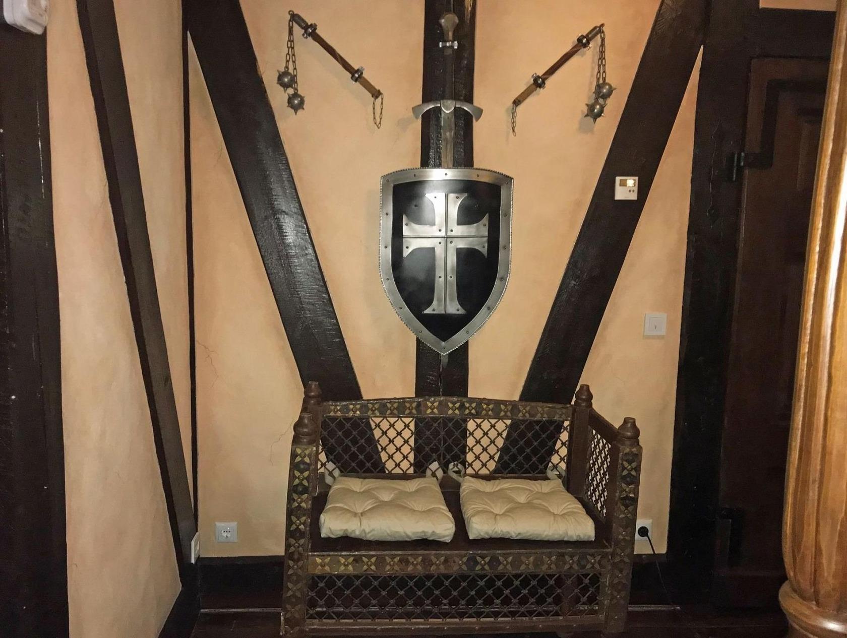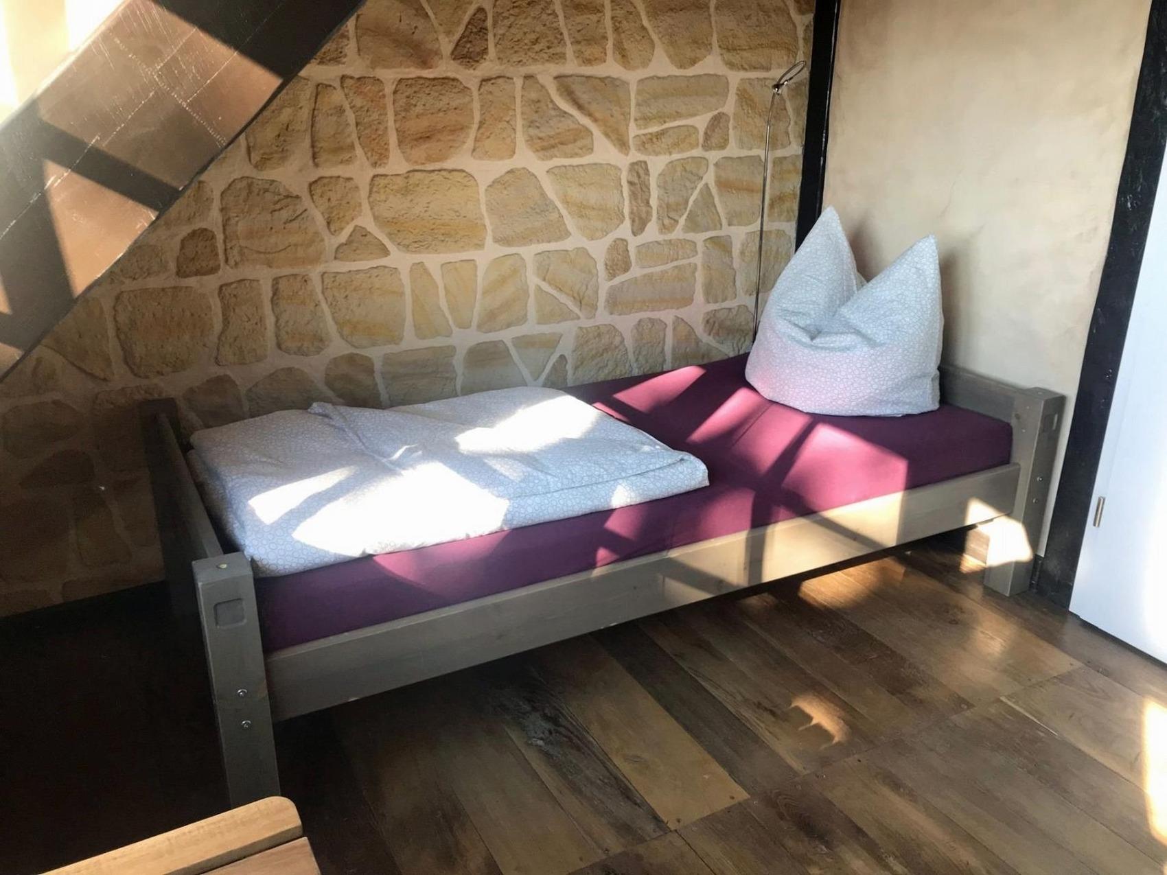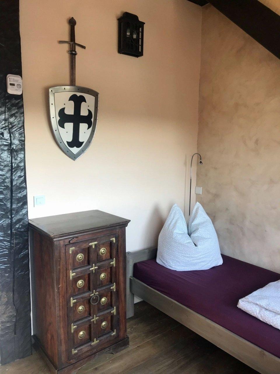 Kinderfreundliche Ferienwohnung WACHSTUBE im Rittergut bei Dresden für 6 Personen.Da unsere Wachmannschaft zur Zeit eine Fehde in der Umgebung befrieden möchte, konnte ich dem Kommandanten des Rittergutes das Versprechen abringen, in der Wachstube Gäste unterbringen zu dürfen.Sie können die Kommandantenstube nutzen, die Küche der Wachen, den Aufenthaltsraum und die drei Schlafräume der Torwachen.Die Wachmannschaft hat allerdings einige ihrer Waffen zurückgelassen.Geniesen Sie das einmalige Ambiente und lassen Sie uns alle hoffen, das die Wachen nicht vorzeitig zurückkommen.Ihre Kinder finden in der Wachstube Bücher, Spielzeug, Lego und andere interessante Beschäftigungen. Außerdem in unserem kleinen Park ein großes Trampolin, Tischtennisplatte, Riesenschach und Reckstangen. Das alles in einem übergroßen Sandkasten. Langeweile kommt da keine auf.Im historischen Innenhof finden Sie für einen stimmungsvollen Tagesausklang eine große Feuerschale, Grill mit ausreichend Tische und Stühlen.Als Handwerkerwohnung gut geeignet.