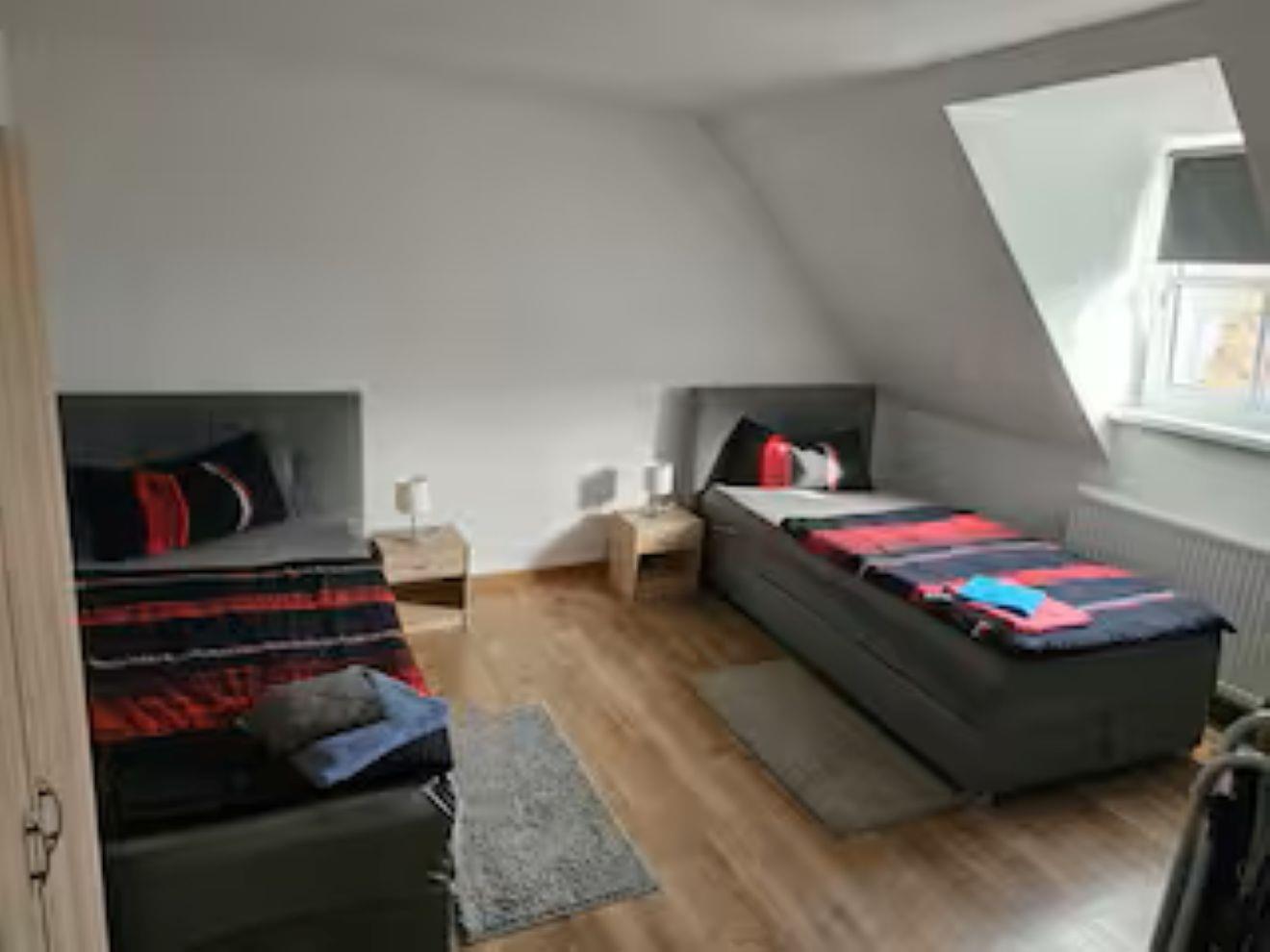 Jedes Zimmer verfügt über 1 oder 2 Einzelbetten 90x200 mit H4 Taschenfederkernmatratze, Kleiderschrank, Nachttischrank mit Nachttischlampe, Schreibtisch + Stuhl, Wäscheständer , Mülleimer. Insgesamt gibt es 2 Wohn-Schlafzimmer.