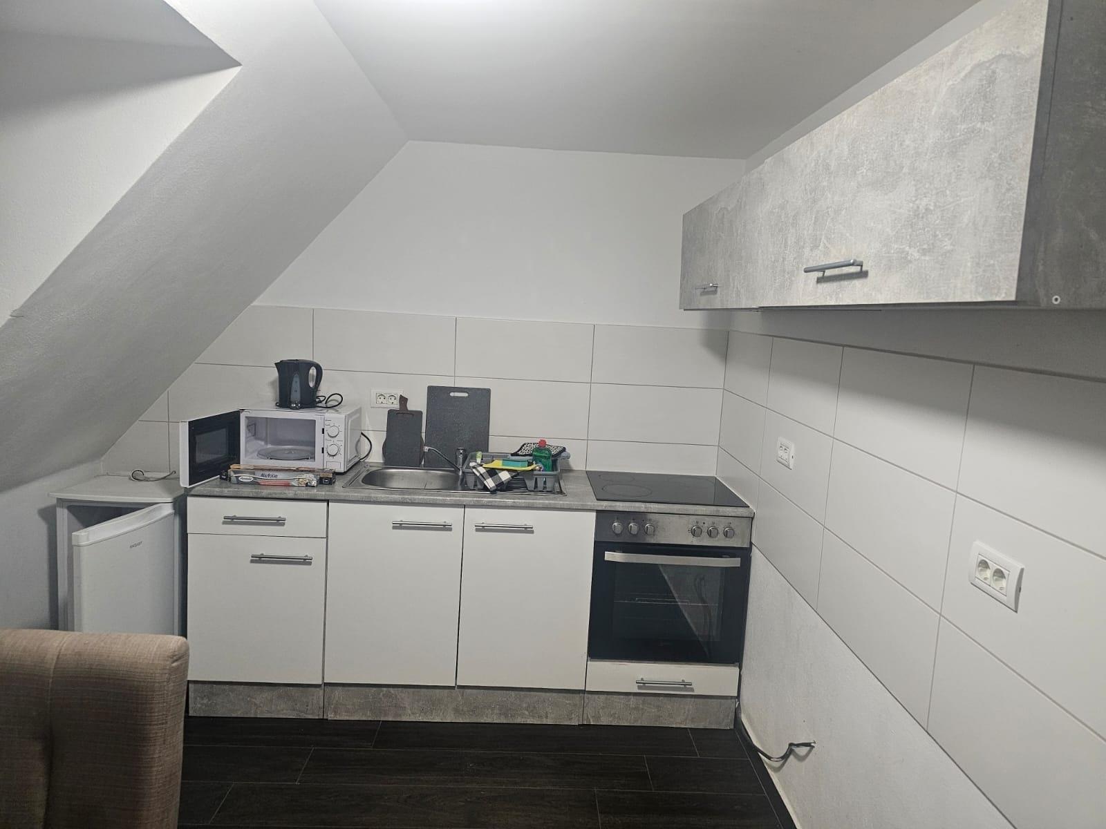 Voll ausgestattete Wohnung, Küche komplett mit allen Geräten ( Kaffeemaschine, Wasserkocher, Mikrowelle, Backofen, Cerankochfeld, Geschirrspüler, Kühl-Gefrier-Kombination).