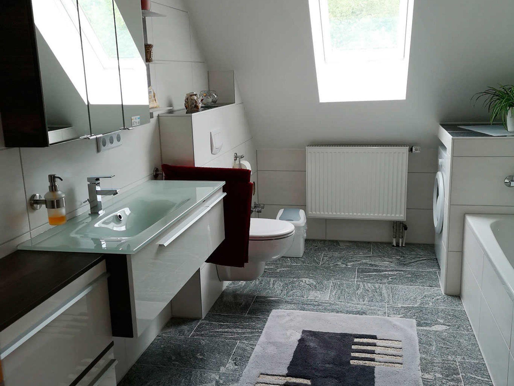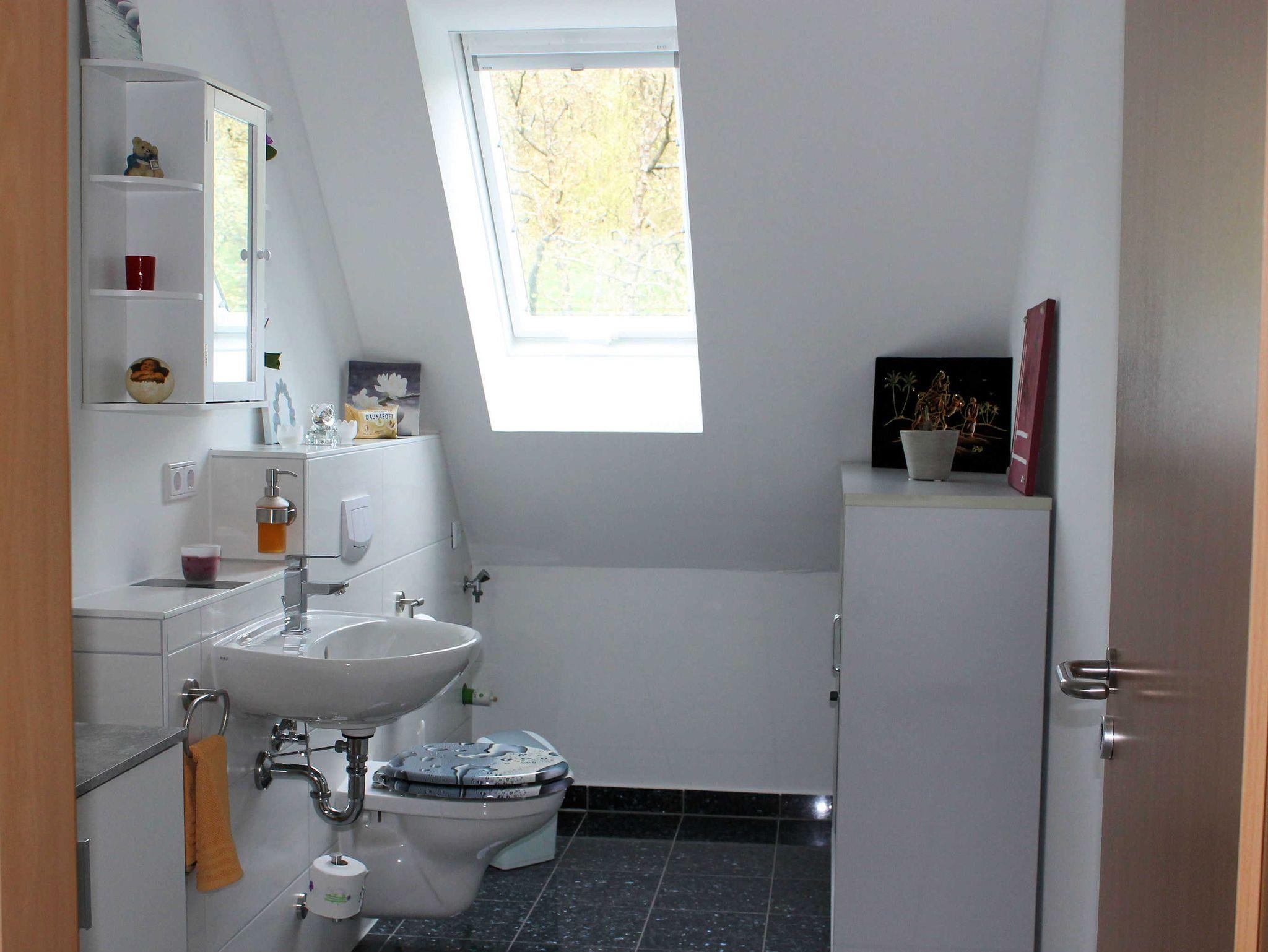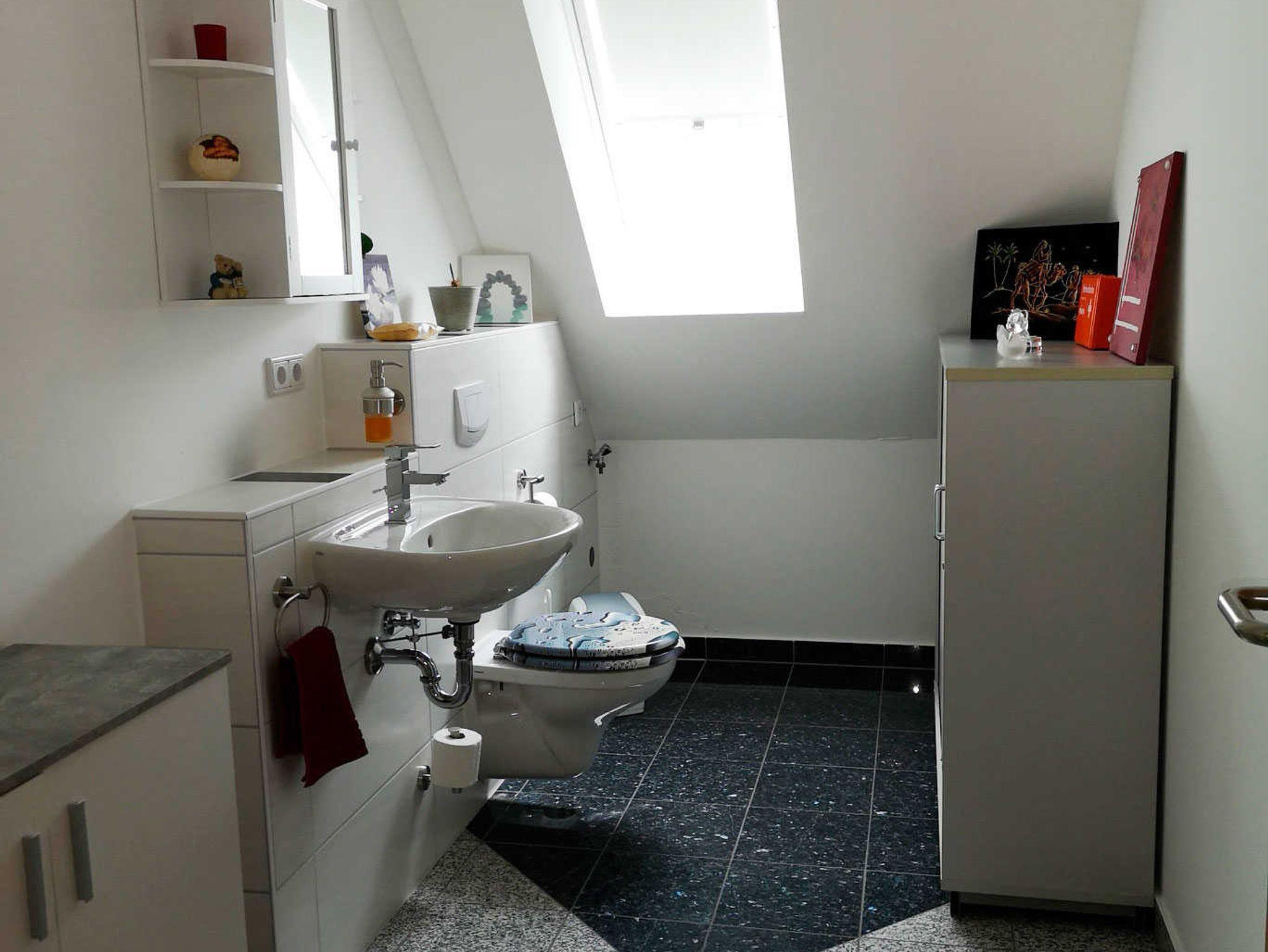 Im zweiten Schlafzimmer befindet sich ein Doppelbett, ein 140er Bett und ein Kinderbett. Die Fewo verfügt über ein Badezimmer mit Badewanne, Dusche und WC und ein separates WC mit Waschbecken und Waschmaschine.