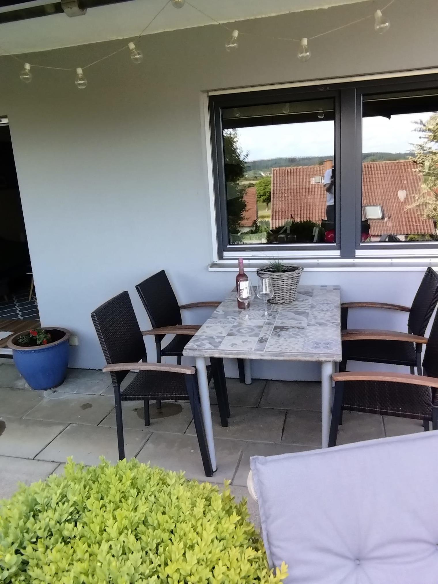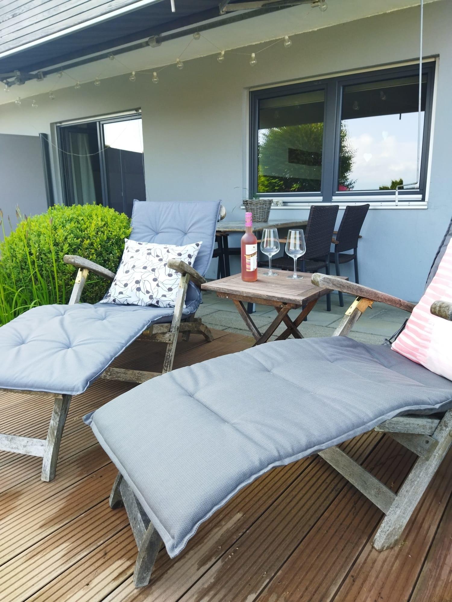 Auf einer großen Terrasse, stehen Ihnen Gartenmöbel und Liegestühle zur Verfügung, damit Sie es sich bei schönem Wetter auch dort gemütlich machen können.