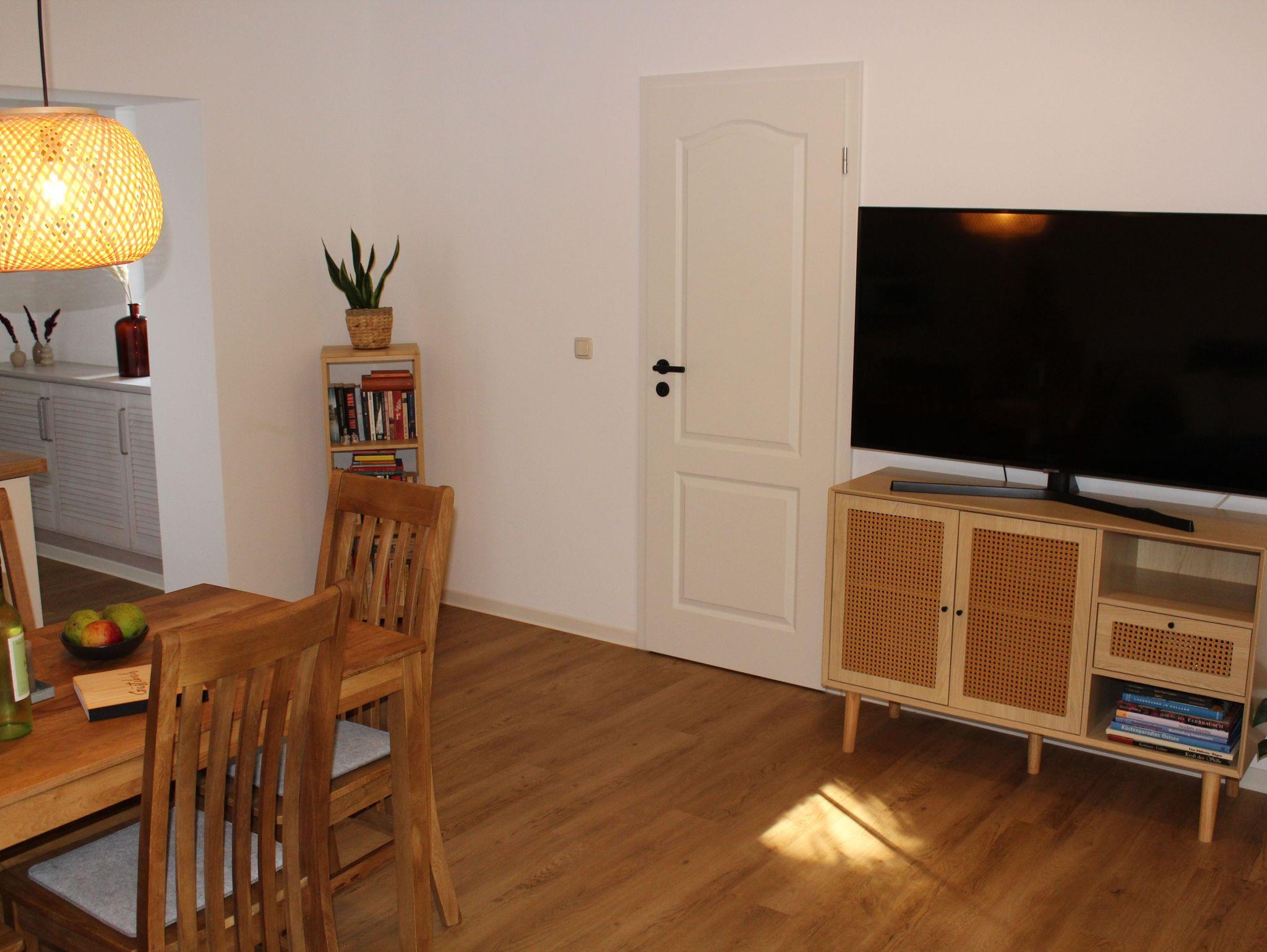 Die liebevoll eingerichtete Ferienwohnung in Weitenhagen bietet Platz für bis zu vier Personen und lädt zu einem erholsamen Aufenthalt in ruhiger Lage ein. Das helle Wohnzimmer ist mit einer großen, gemütlichen Eckcouch, einem Fernseher sowie Radio, CD- und Videoplayer ausgestattet. Ein Esstisch und eine offene, komplett eingerichtete Küchenzeile schaffen eine wohnliche Atmosphäre, in der Sie sich rundum wohlfühlen können. Das Hauptschlafzimmer verfügt über ein komfortables Doppelbett, eine kleine Sitzgruppe und einen zusätzlichen Fernseher. Im zweiten Schlafzimmer befinden sich zwei Einzelbetten ideal für Kinder oder mitreisende Freunde. Das Badezimmer ist modern gestaltet und mit Dusche und WC ausgestattet. Bettwäsche und Handtücher sind selbstverständlich vorhanden.