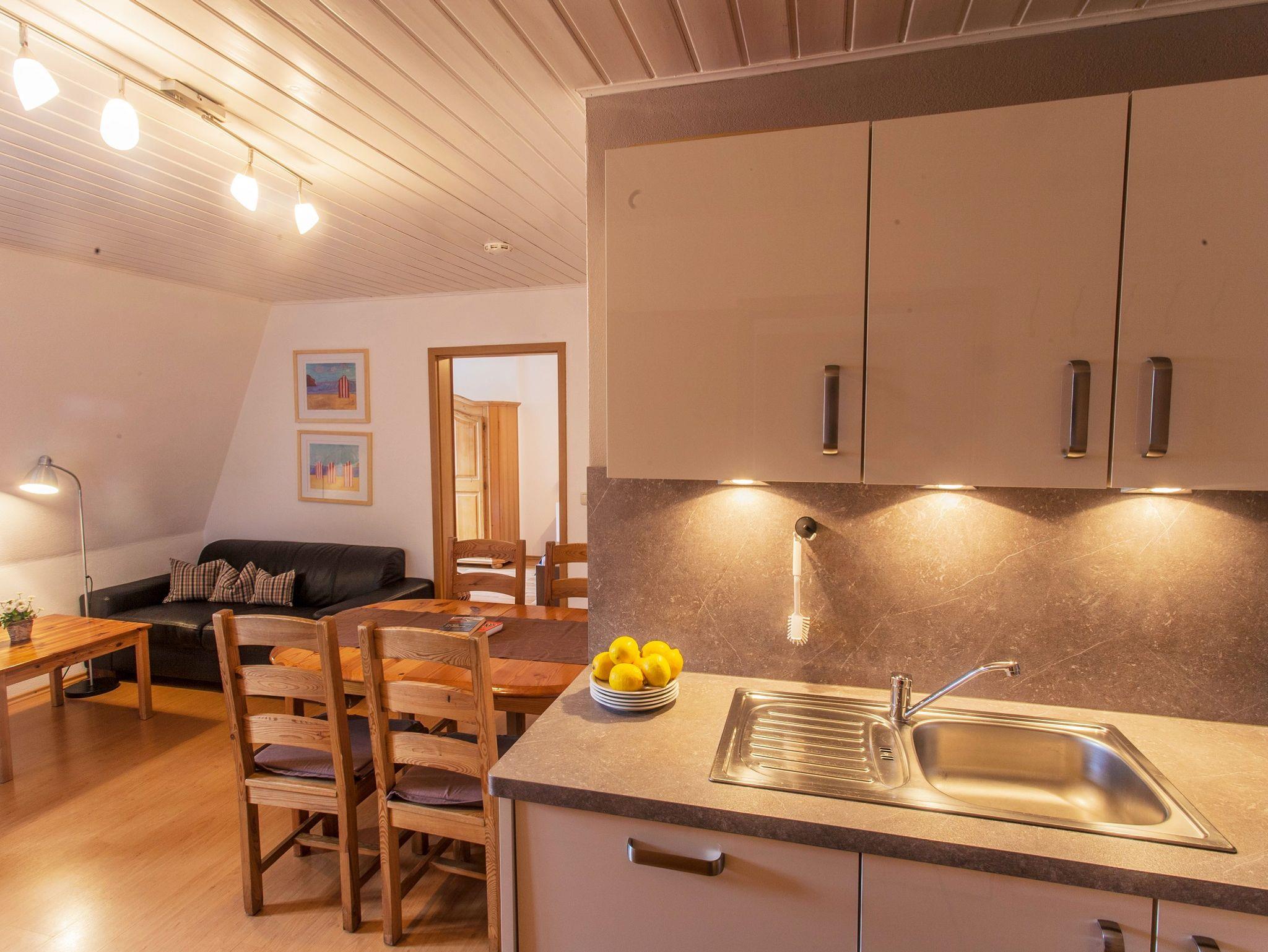 Die Ferienwohnung bietet mit 61qm Platz für 1 - 4 Personen. Die Wohnküche ist mit einer gemütlicher Essecke und einem Sofa ausgestattet. Die beiden Schlafzimmer sind einmal mit Doppelbett und einmal mit zwei Einzelbetten ausgestattet und haben jeweils ein anliegendes Badezimmer mit Dusche und WC. Die Betten sind bereits bei Ihrer Ankunft überzogen. In der Küche stehen Ihnen bereit: Ein Elektroherd mit Ceranfeld, Backofen, Spülmaschine, Kühlschrank mit Gefrierschrank, Toaster, Wasserkocher, Tischwäsche und natürlich eine Kaffeemaschine.