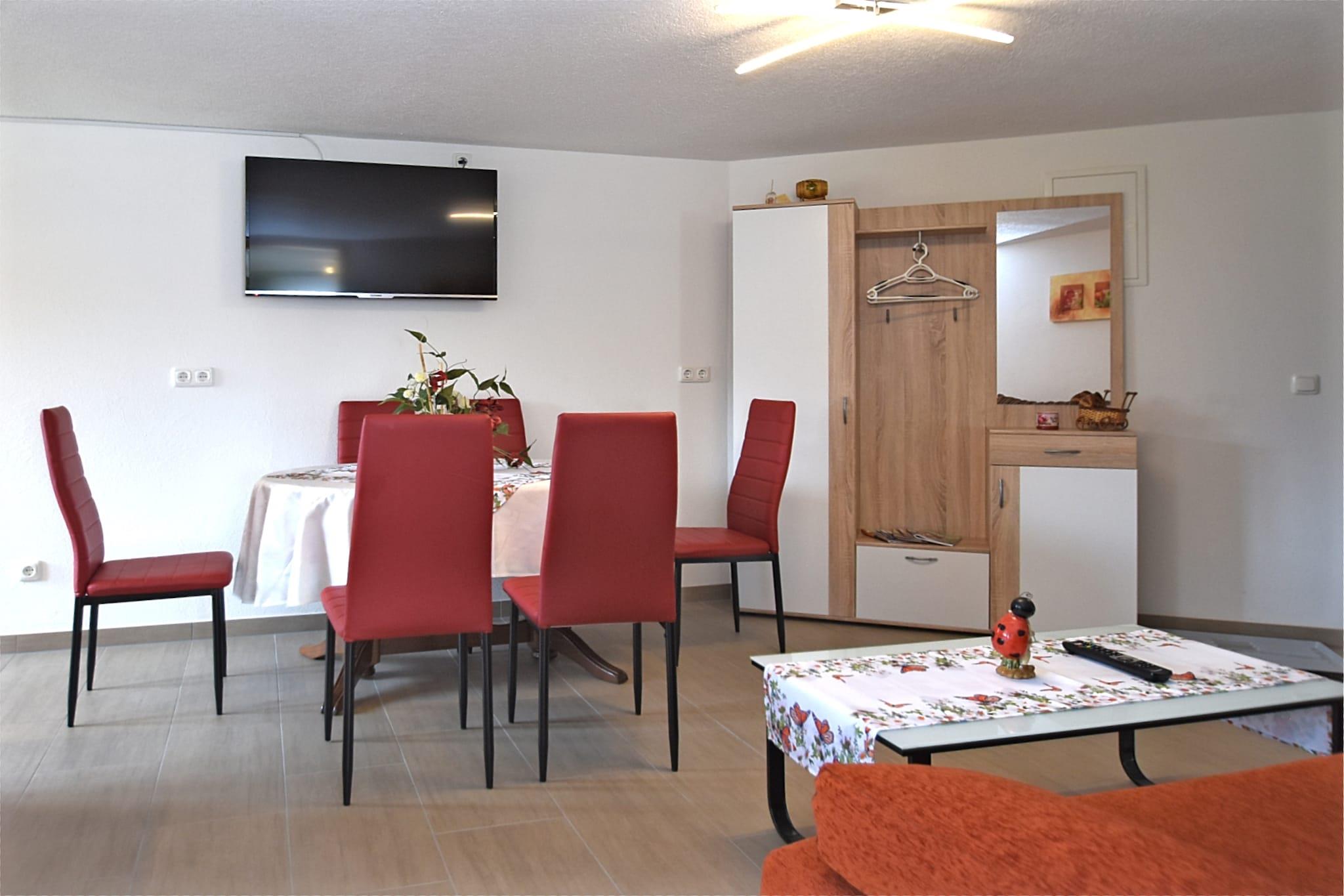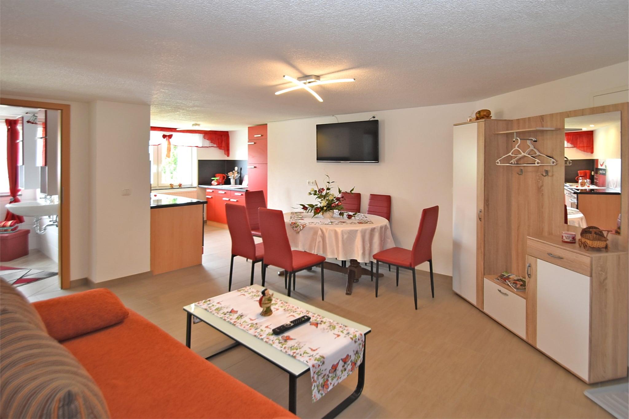 Beliggende i den fredelige landsby Lichtenhain, nær Sebnitz, er denne rummelige lejlighed i stueetagen perfekt til op til 6 gæster. Med to soveværelser – det ene med dobbeltseng, det andet med dobbeltseng (180 x 200 cm) og køjeseng – er det ideelt for familier eller små grupper. Det åbne køkken er fuldt udstyret med et keramisk komfur med 4 kogeplader, ovn, kombineret mikroovn, opvaskemaskine, køleskab/fryser, brødrister, filterkaffemaskine og endda et vaffeljern - perfekt til hjemmelavede måltider og hyggelig morgenmad. Stuen/spisestuen har fladskærms-satellit-tv, radio og spisebord. Badeværelset har bruser, håndvask og toilet, mens centralvarme sikrer komfort året rundt. Gæsterne kan nyde en fælles have på 1000 m² med dam, legeredskaber, parasol og kulgrill (efter anmodning). En barneseng, høj stol, vaskemaskine og betalt tørretumbler tilføjer ekstra bekvemmelighed. Parkering og cykelopbevaring er til rådighed på stedet. Med butikker, restauranter og offentlig transport kun 500 m væk, og skovstier, swimmingpools og skiløjper inden for rækkevidde, er dette hjem en fantastisk base for at udforske det saksiske Schweiz.