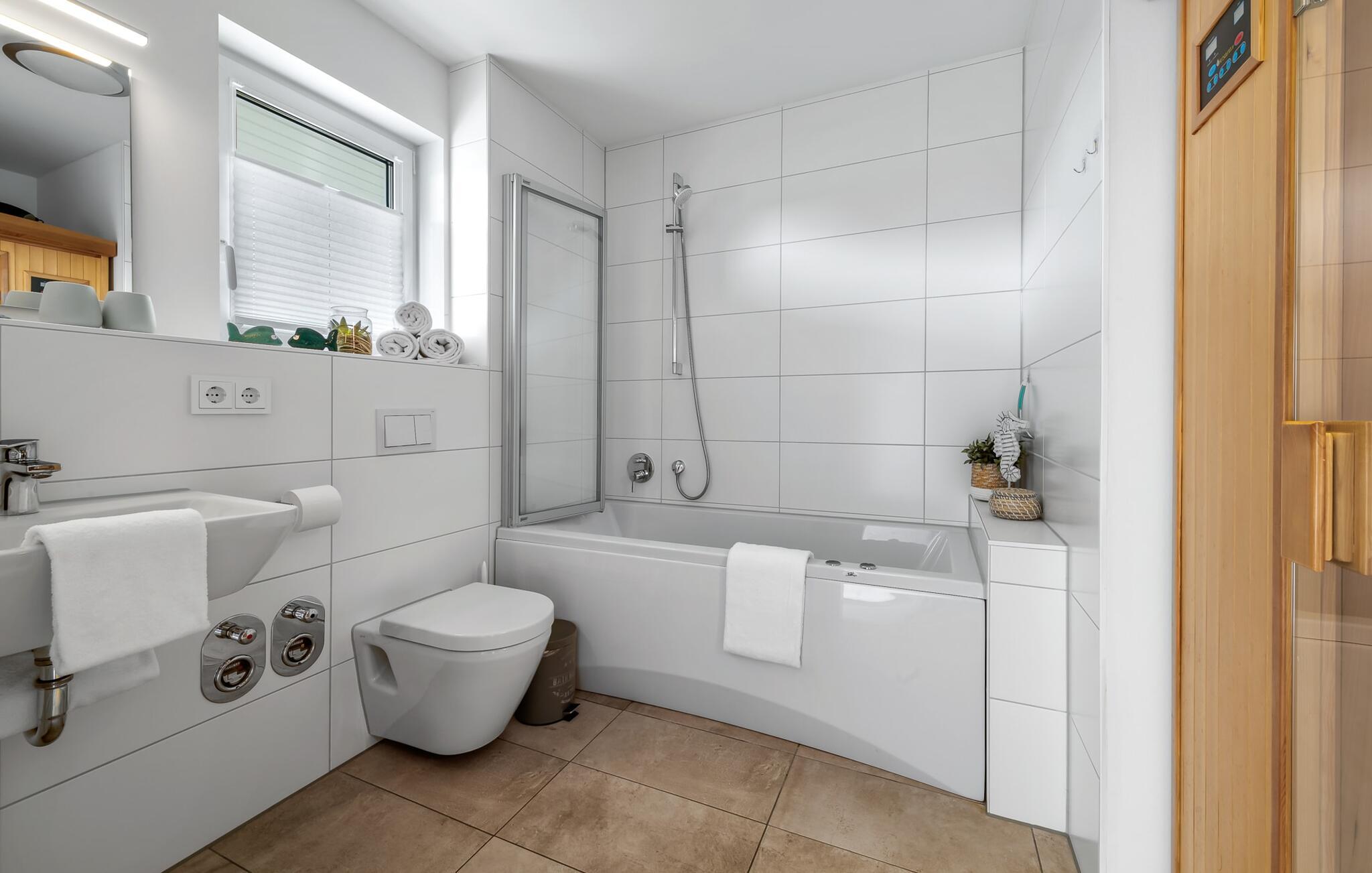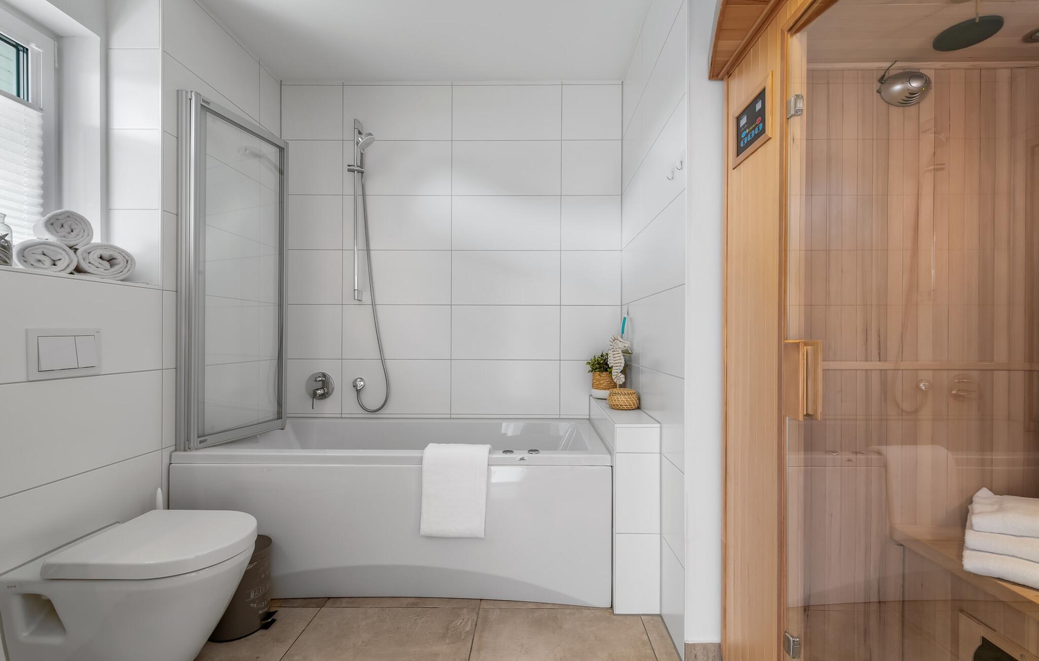 Et højdepunkt er uden tvivl badeværelset, eller rettere det lille, private wellness-område. Med dets spabad og infrarøde sauna kan I afslutte vellykkede feriedage på en afslappende måde. Der er også en privat vaskemaskine her.