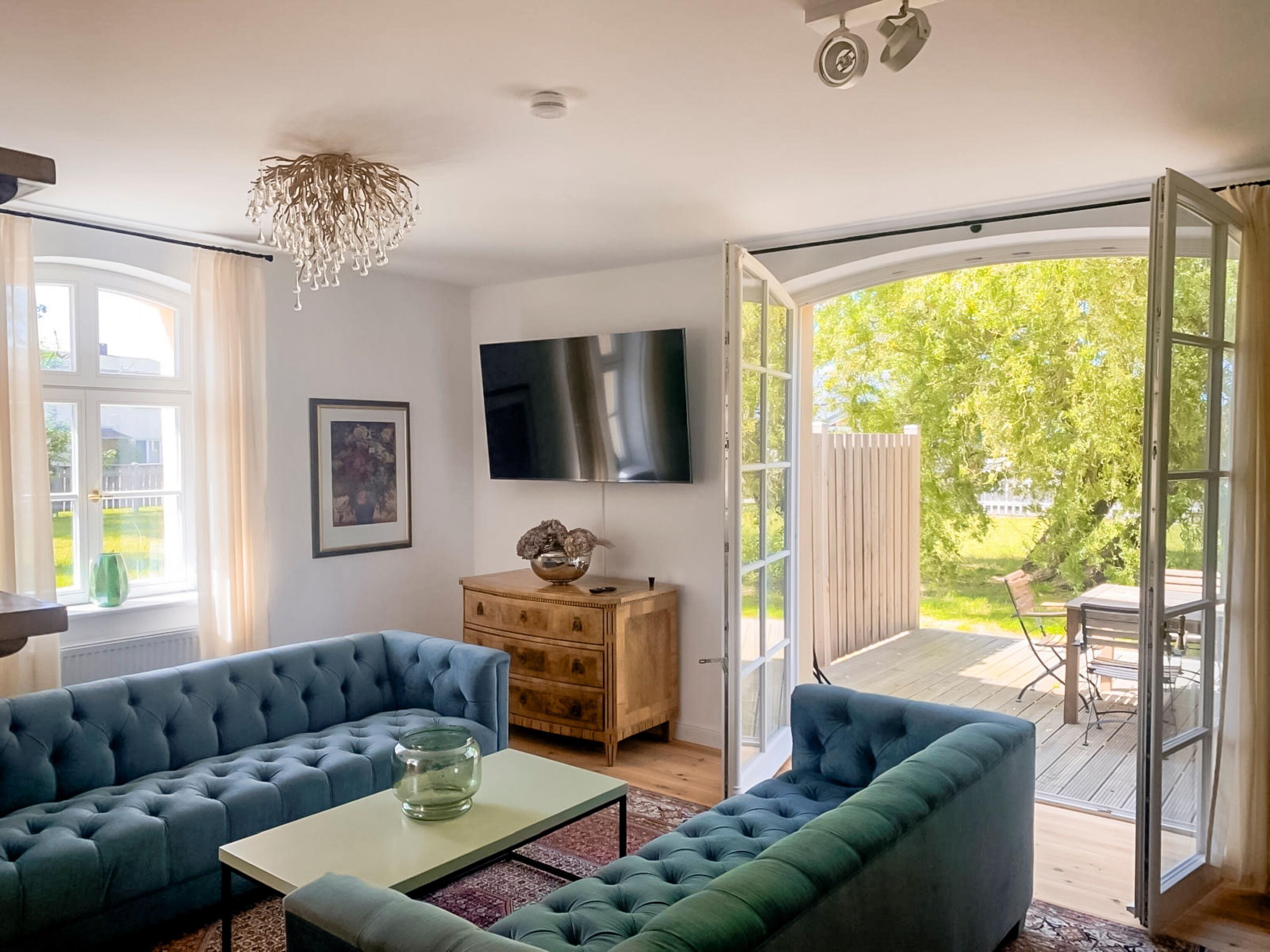 Wohnzimmer mit Kamin: Lichtdurchflutet und gemütlich, mit TV-Flatscreen und einladender Sitzgarnitur.