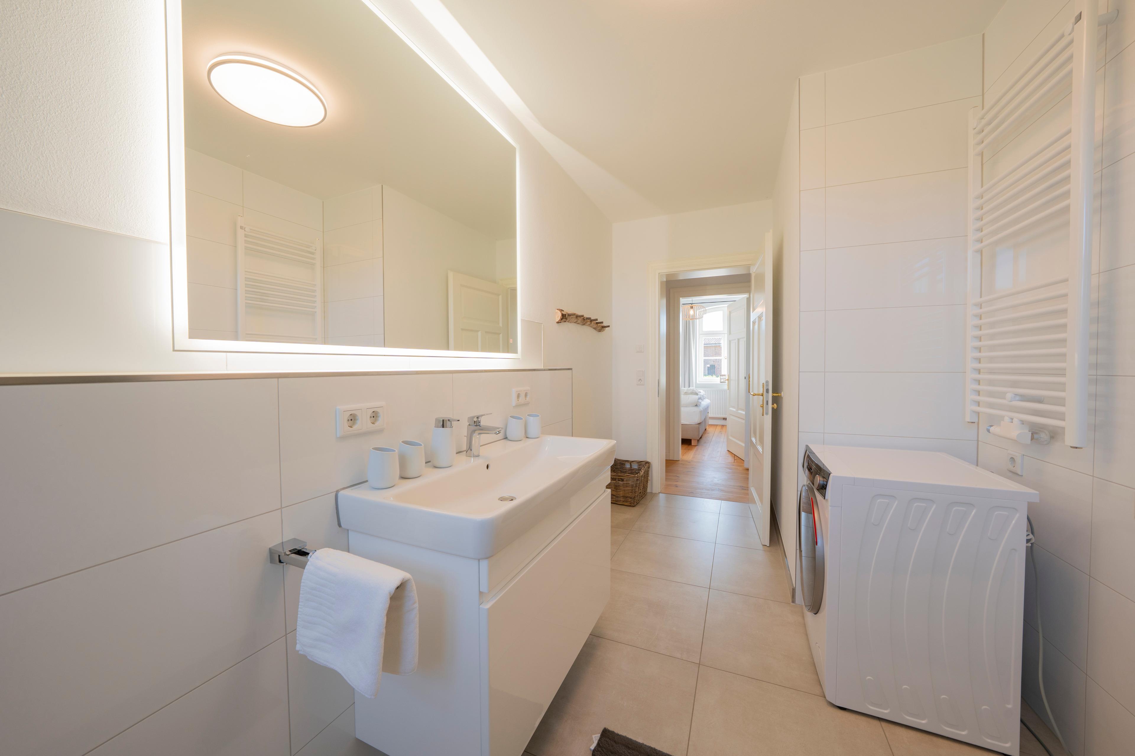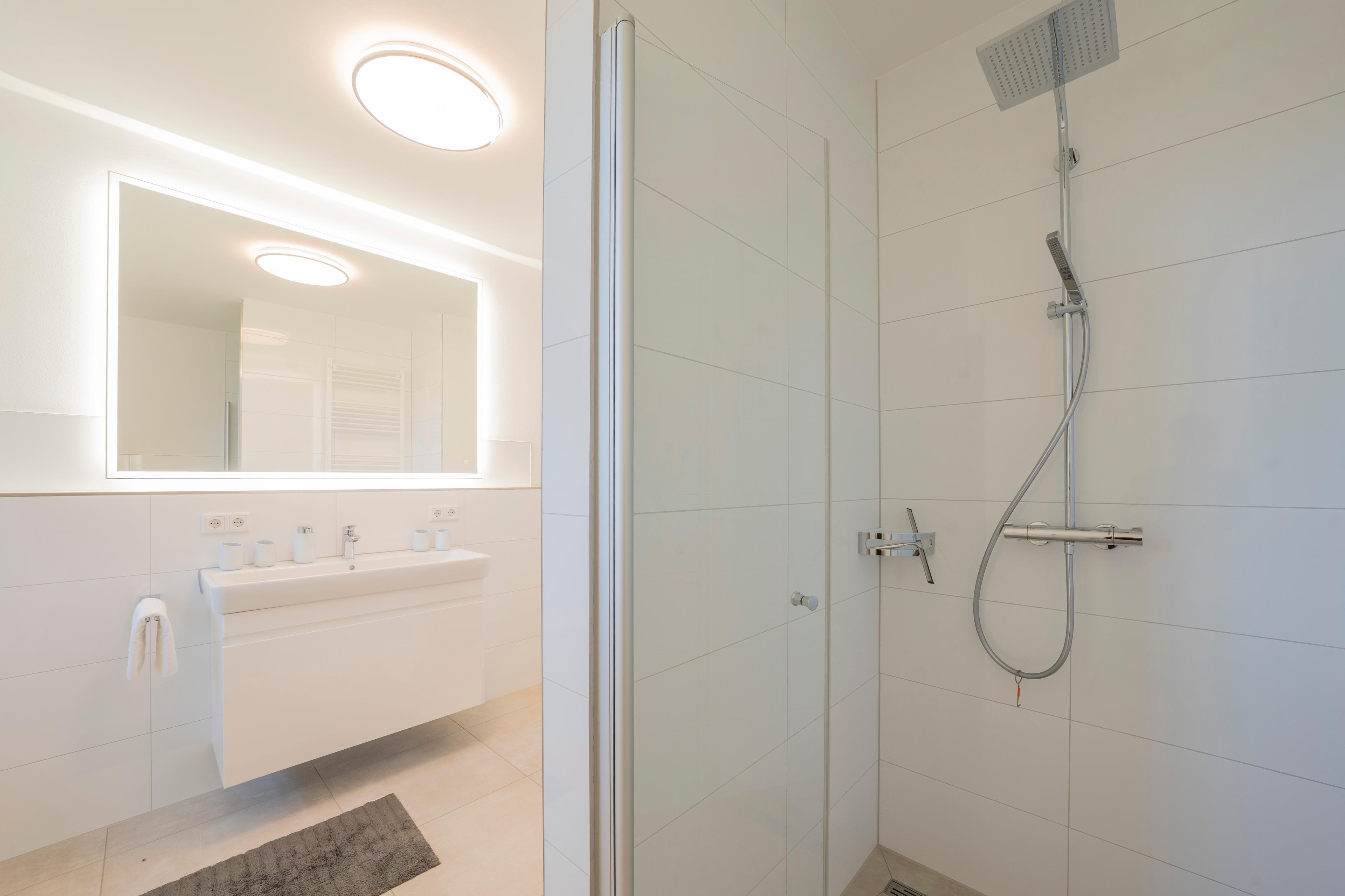 Modernes Badezimmer: Mit Badewanne, Dusche, Waschtisch und WC sowie zusätzlichem Gäste-WC.