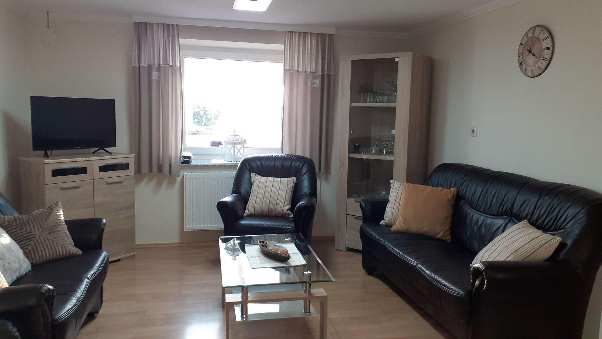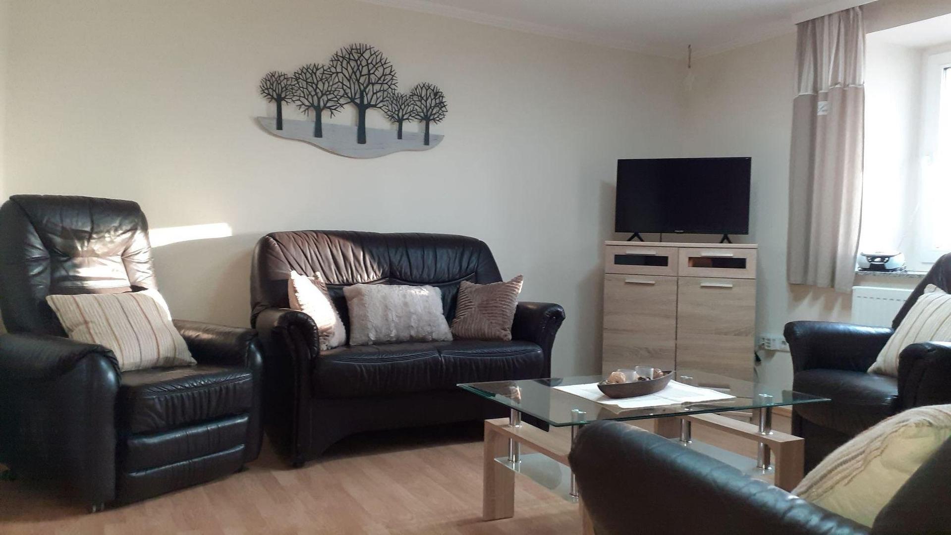 Wohnzimmer mit Ledermöbeln (3-2-1-1) und Smart-TV