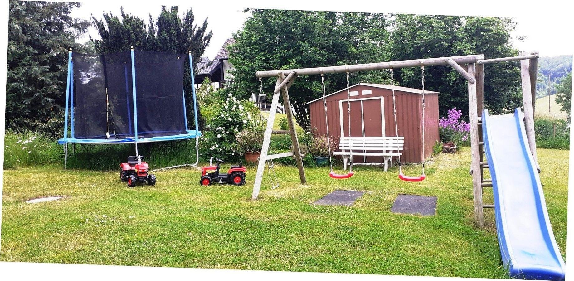 Auf dem großen, komplett umzäunten Grundstück befinden sich zwei Terrassen zur Südseite(eine davon mit Wintergarten), Gartenmöbel, Grill, Rasen, Sonnenliegen und Kinderspielplatz . 3 Parkplätze stehen kostenlos zur Verfügung.