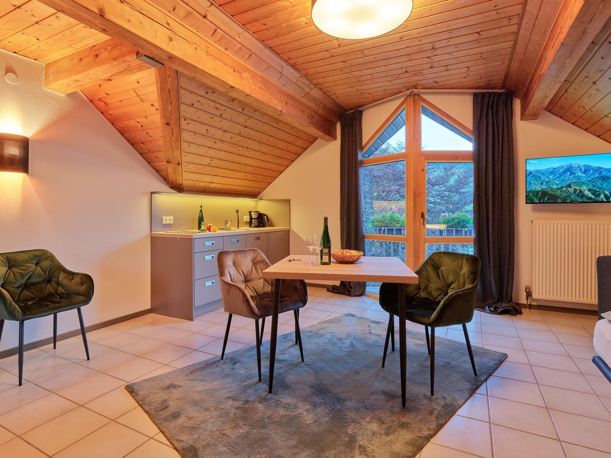 Dieses Apartment in der ersten Etage bietet vom eigenen Balkon einen wundervollen Mosel- und Weinbergeblick. Es bieten Ihnen helle Fliesen, eine Sitzgruppe und hat eine gemütliche Chaiselongue und Satelitten-Flachbild-TV, eine voll ausgestattete, hochwertige Küchenzeile mit einem Kühlschrank und Gefrierfach, Ceran-Kochfeld und einem Geschirrspüler sowie ein eigenes hochwertiges, modernes Badezimmer mit großem Spiegel, ein Radio mit Bluetooth-Funktion und einer Dusche und einem Haartrockner. Außerdem gibt es einen Toaster sowie eine Kaffeemaschine und einen Wasserkocher. Das gemütliche sehr hochwertige Boxspringbett verwöhnt Sie mit zwei separaten Matratzen und zwei allergiker-geeigneten Zudecken und Kissen, außerdem gibt es einen Ganzkörperspiegel.