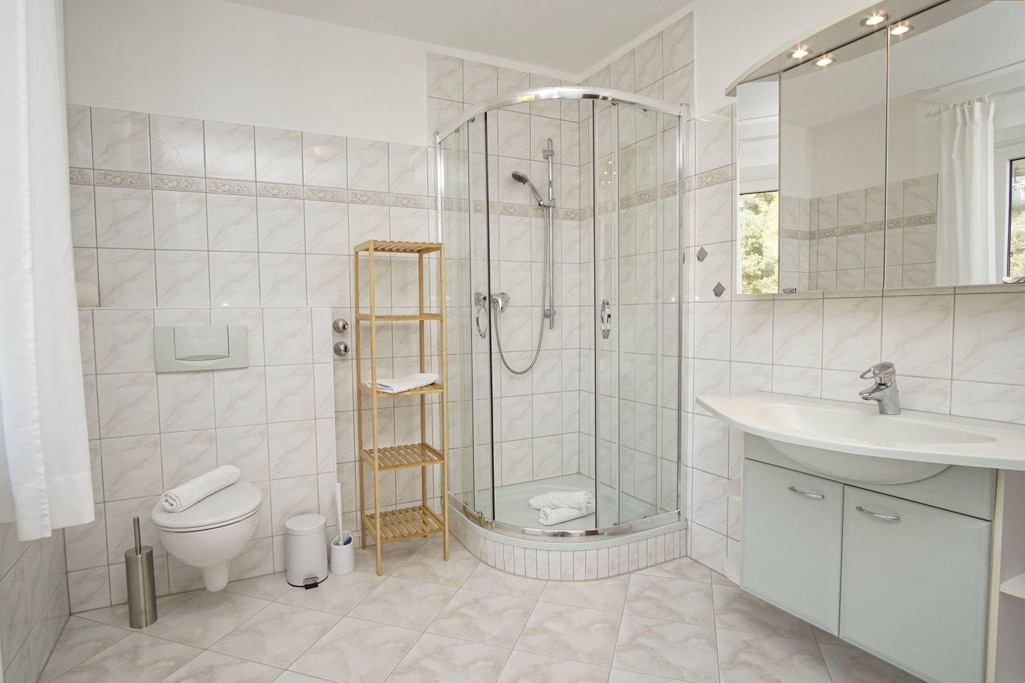 BAD // Badezimmer im OG mit Dusche, WC, Waschbecken und Fenster ++